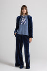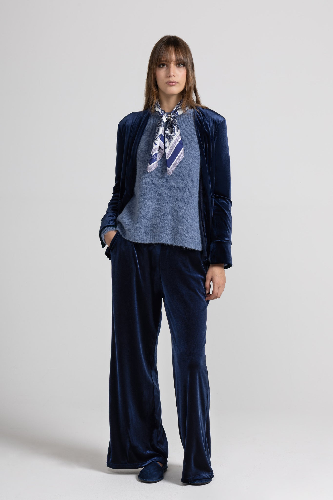 Giacca in tessuto di velluto elasticizzato, collo a revers, spalline strutturate che valorizzano la silhouette, apertura sul davanti, tasche applicate con patta, maniche lunghe arricchite da uno spacchetto con colore a contrasto che aggiunge un tocco distintivo e raffinato al design. La fodera interna assicura comfort e una vestibilità impeccabile. Linea morbida.