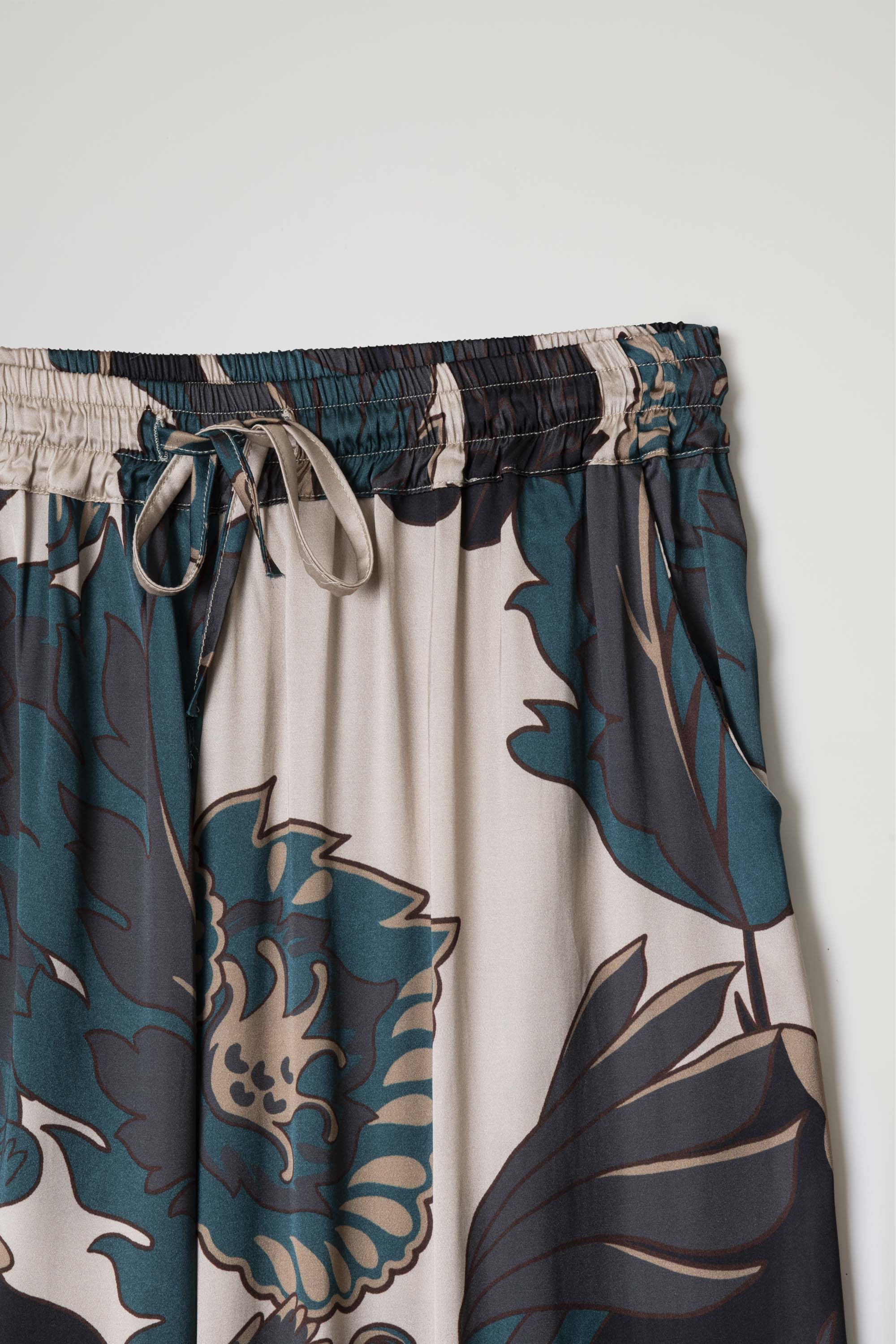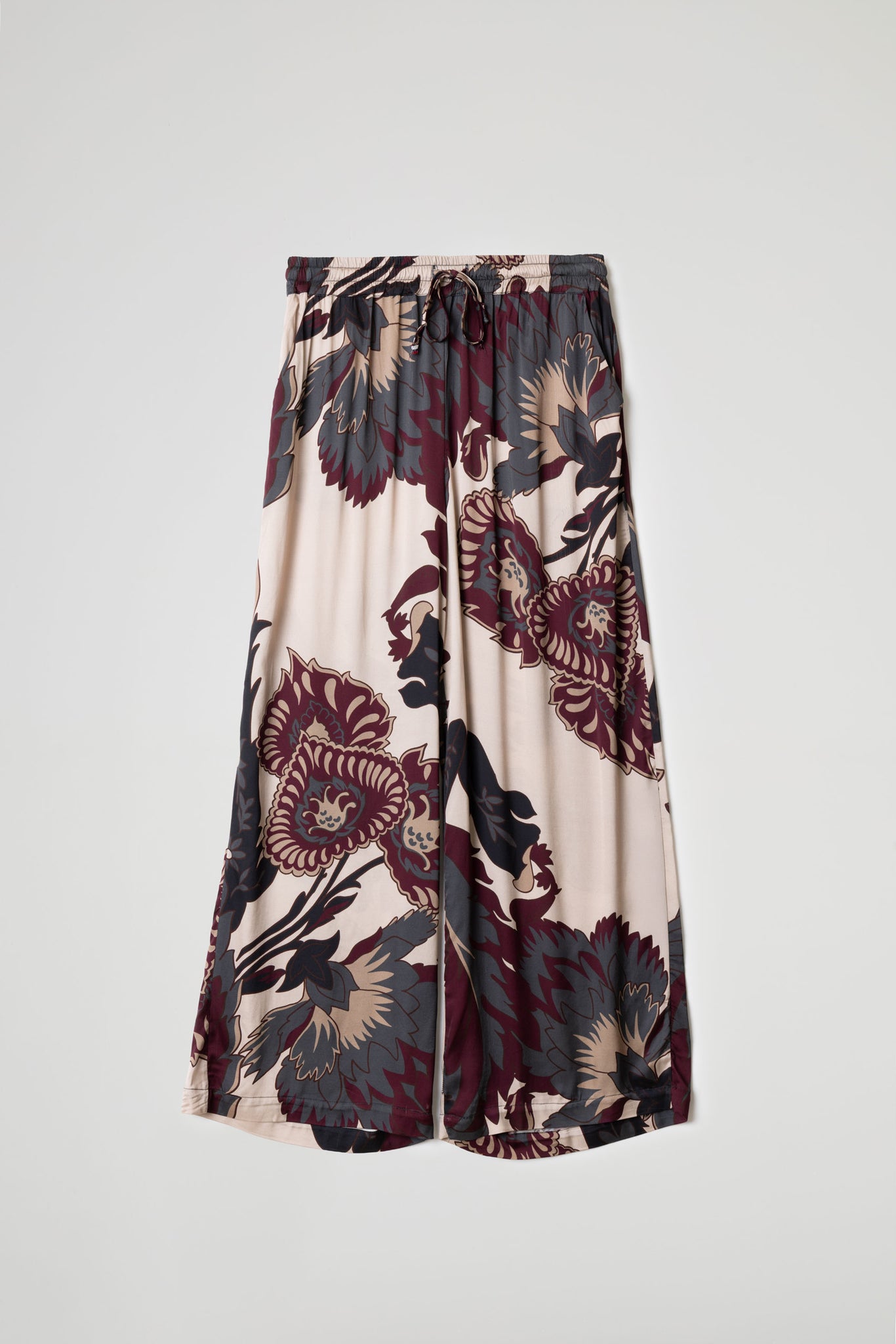 PANATLONE PALAZZO IN RASO DI VISCOSA E ECOVERO STRETCH, ELASTICO E COULISSE REGOLABILE IN VITA, TASCHE ALLA FRANCESE, IMPUNTURA SU GAMBA. FIT COMFORT EFFETTO PYJAMA.