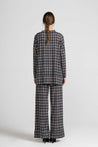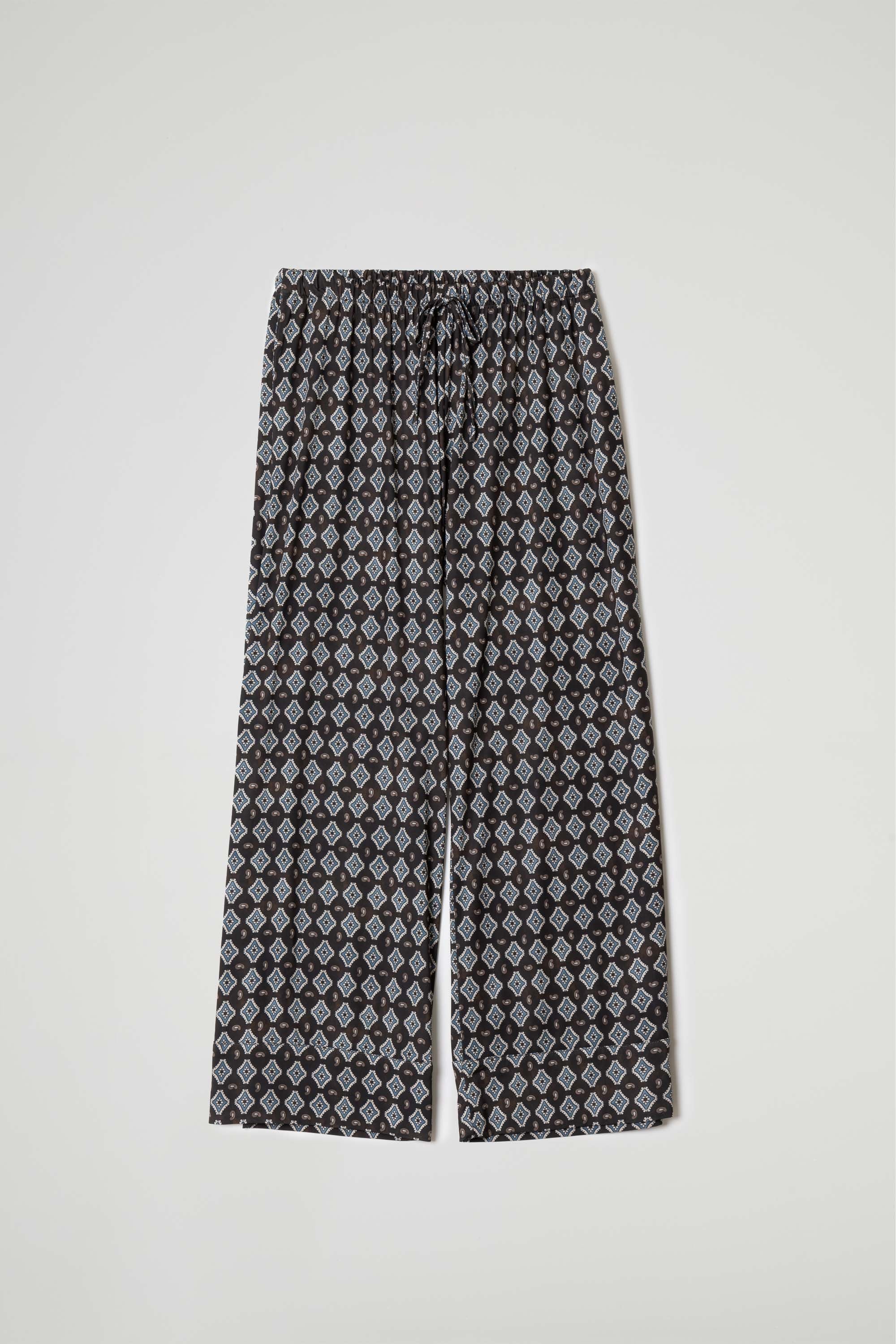Pantalone a palazzo in tessuto tecnico, elastico in vita con coulisse regolabile, tasche a filo, orlo ribattuto alto sul fondo, fantasia geometrica su tutto il capo, Lina morbida