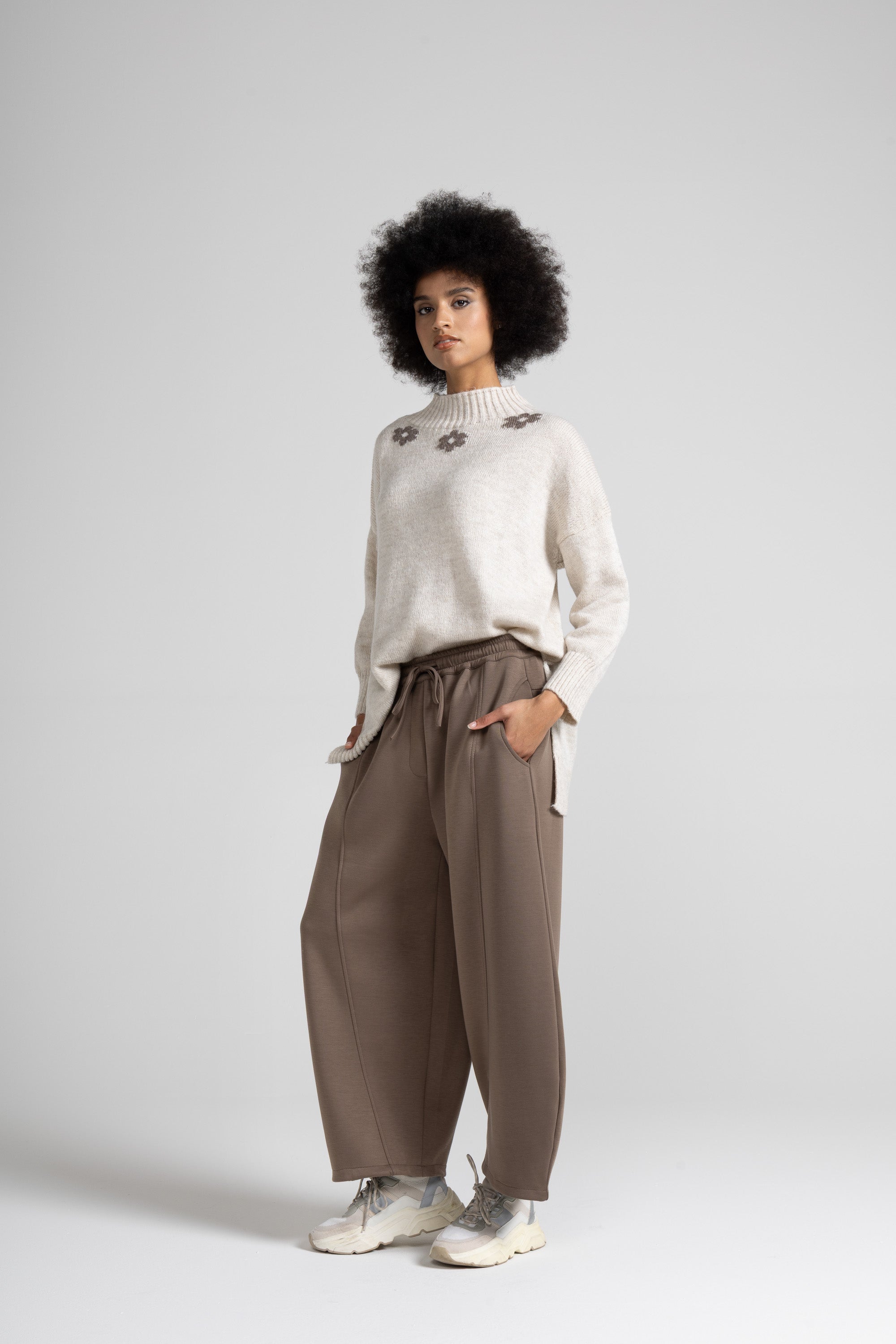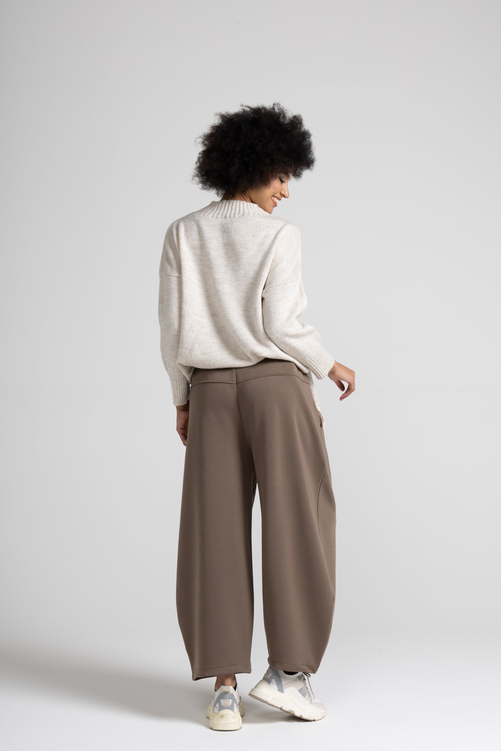 Taglio baggy, vita elastica con coulisse regolabile in tono, due tasche laterali, cucitura centrale frontale, orlo ribattuto sul fondo. Linea ampia.