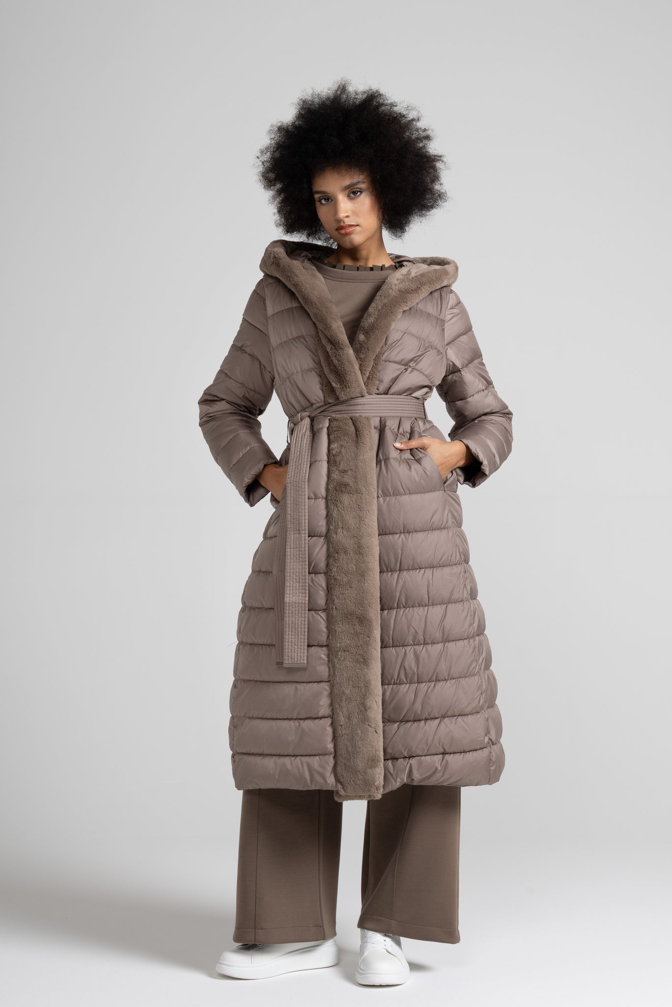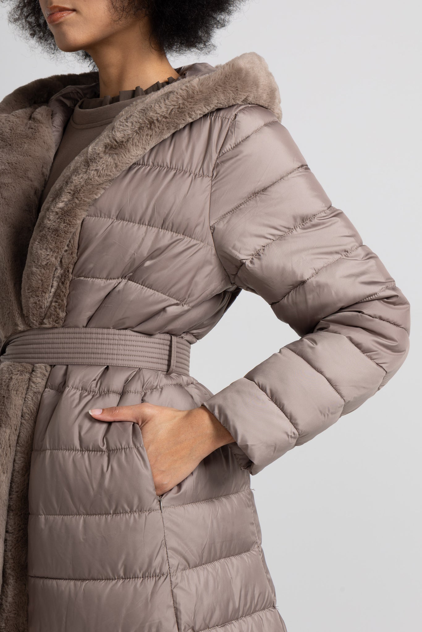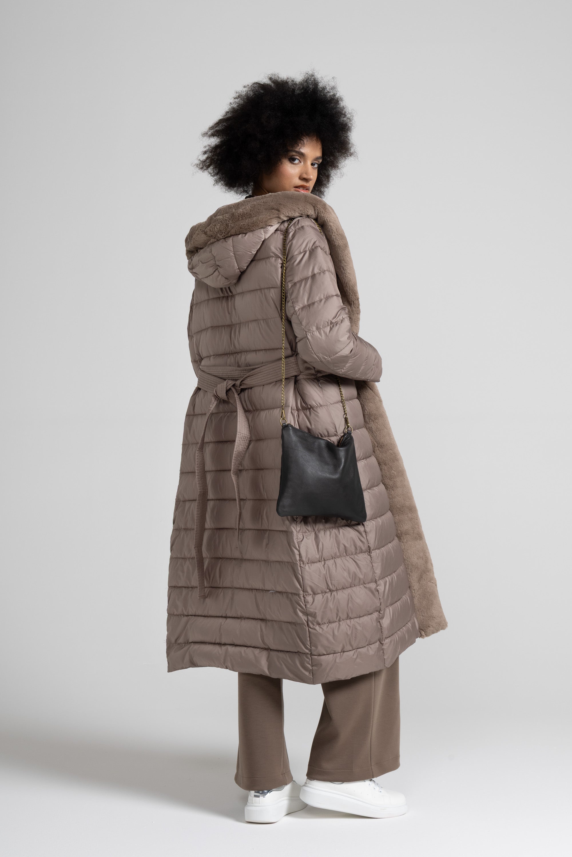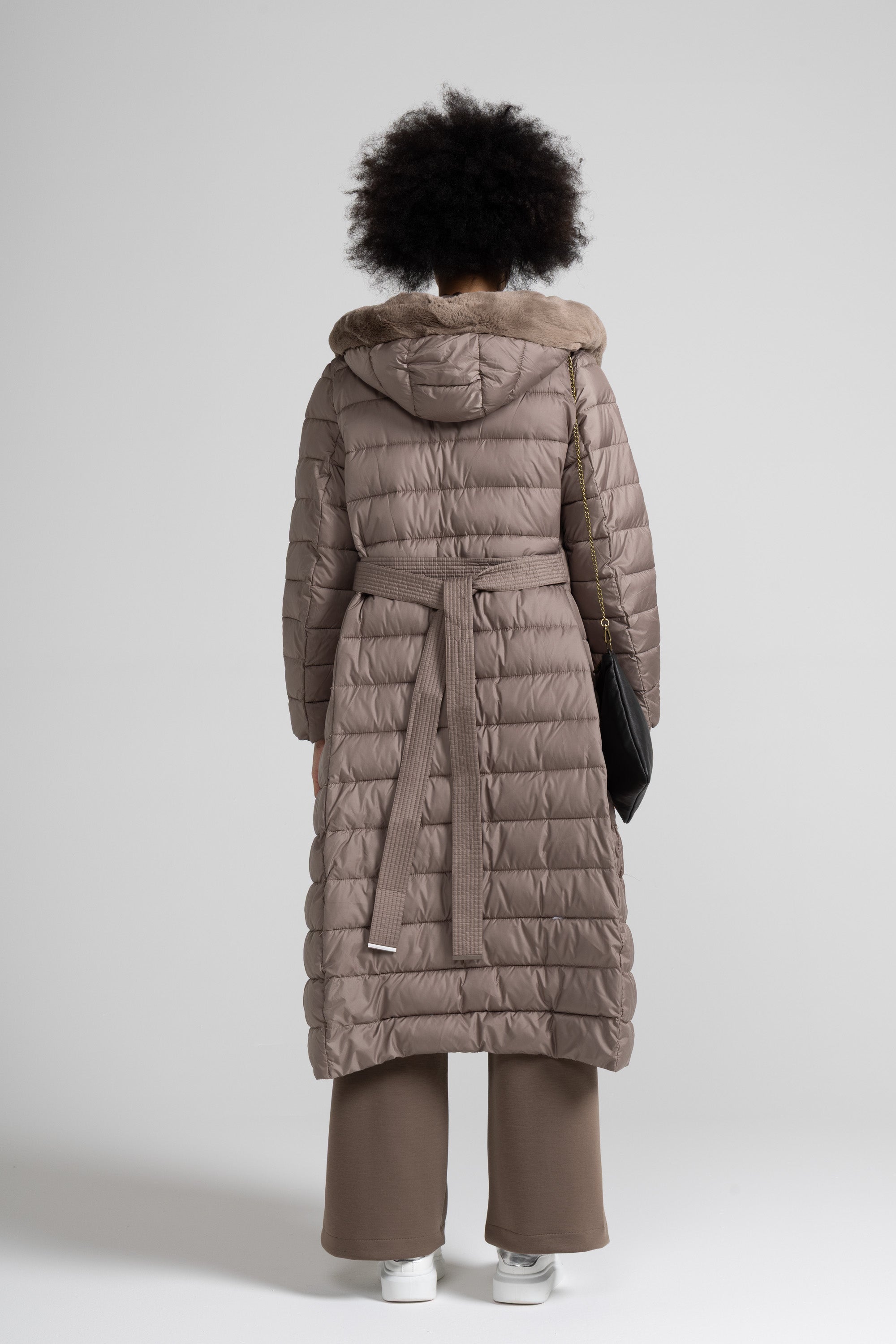 Piumino lungo con dettaglio in morbida eco pelliccia offre un’eleganza contemporanea che lo rende ideale sia per look urbani che più raffinati ,la trapuntatura orizzontale regolare valorizza la silhouette senza appesantire, mentre la cintura coordinata con impunture parallele permette di regolare la vestibilità e definire il punto vita, per un effetto femminile e slanciato.