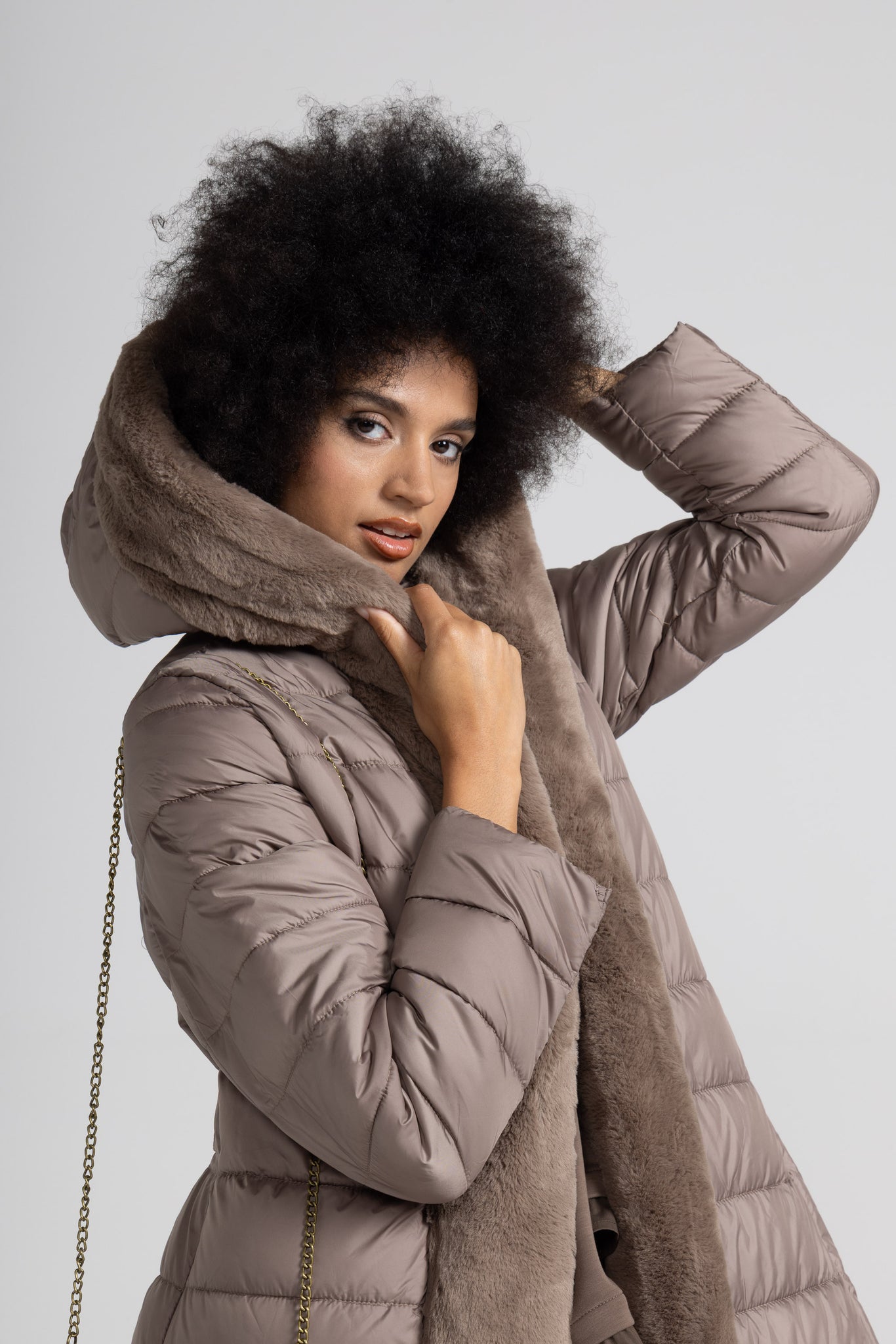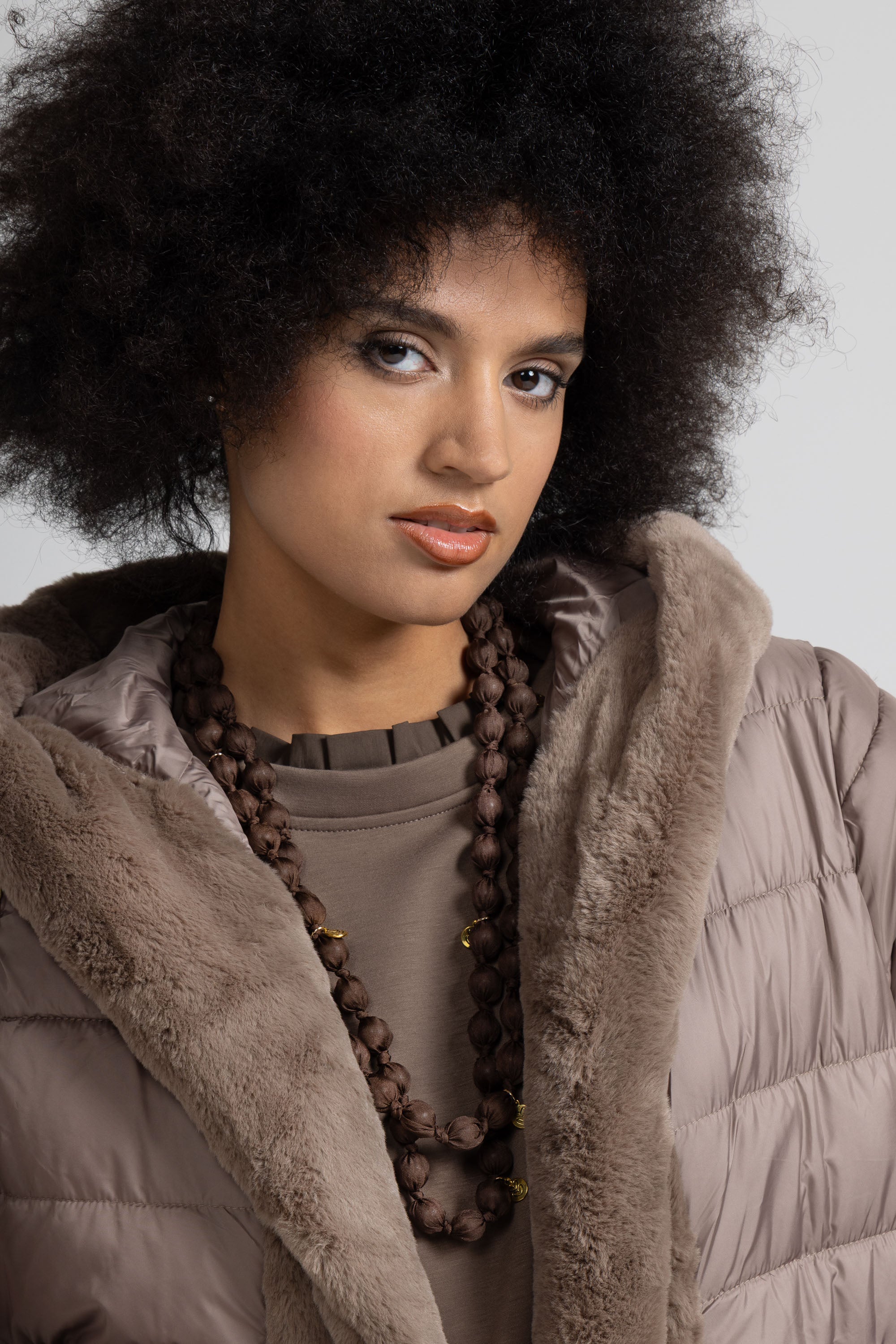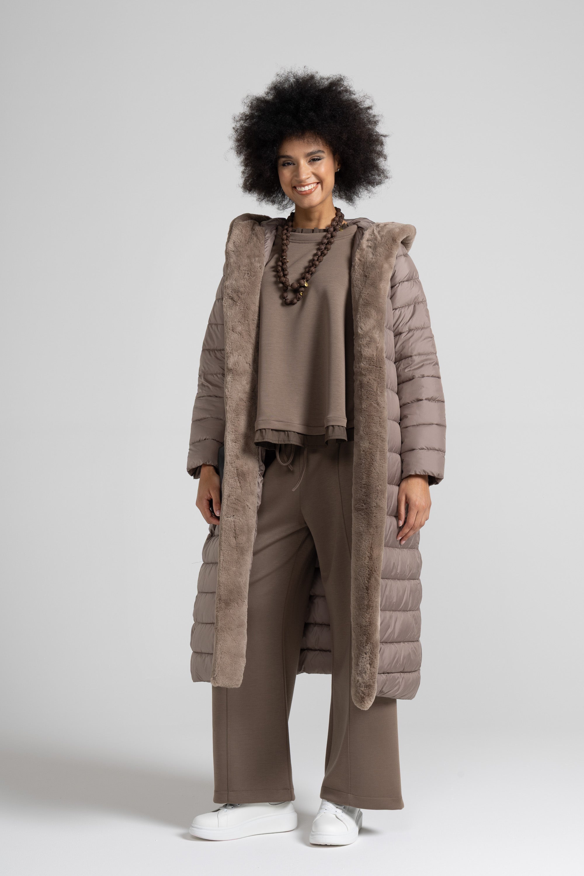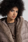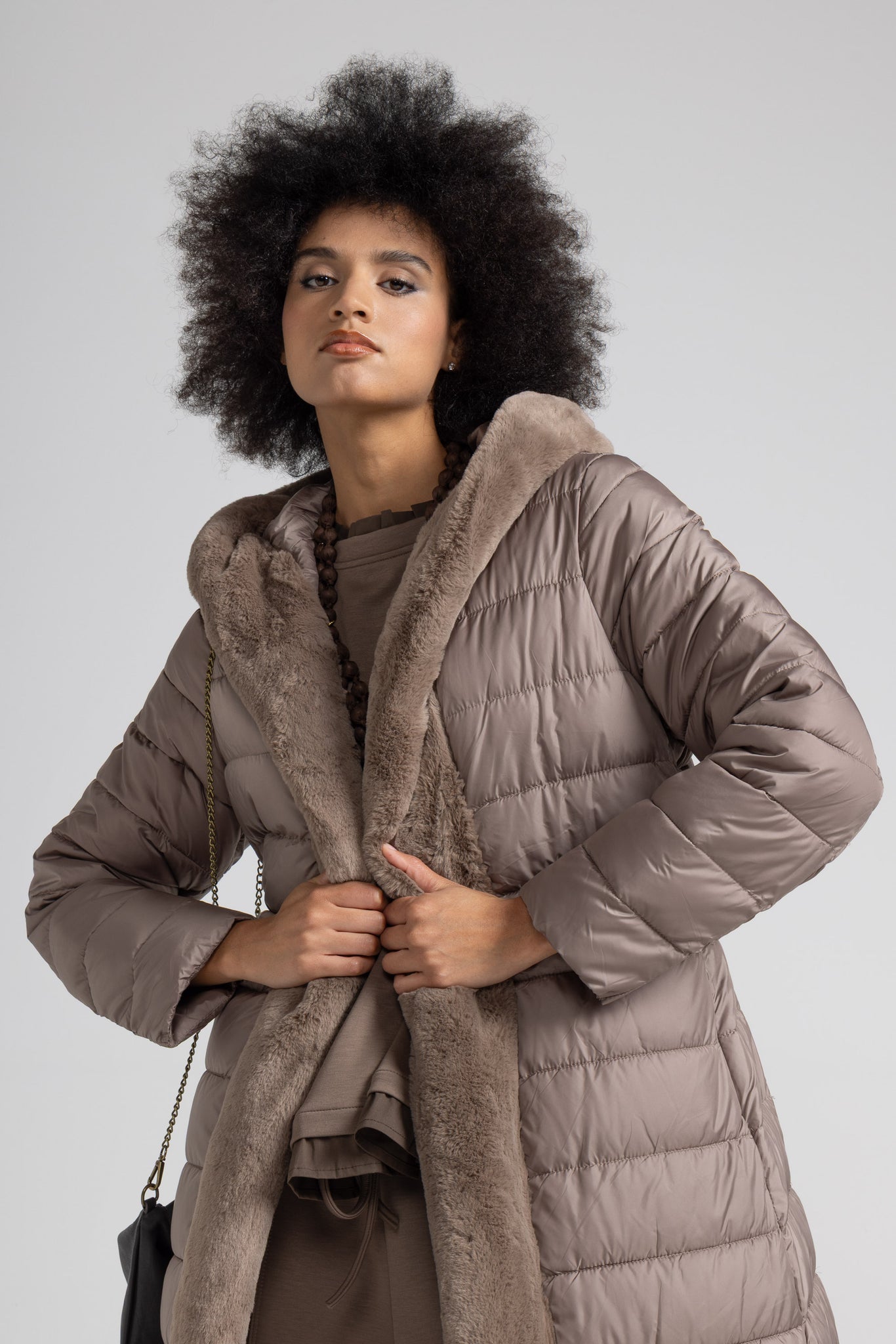Piumino lungo con dettaglio in morbida eco pelliccia offre un’eleganza contemporanea che lo rende ideale sia per look urbani che più raffinati ,la trapuntatura orizzontale regolare valorizza la silhouette senza appesantire, mentre la cintura coordinata con impunture parallele permette di regolare la vestibilità e definire il punto vita, per un effetto femminile e slanciato.