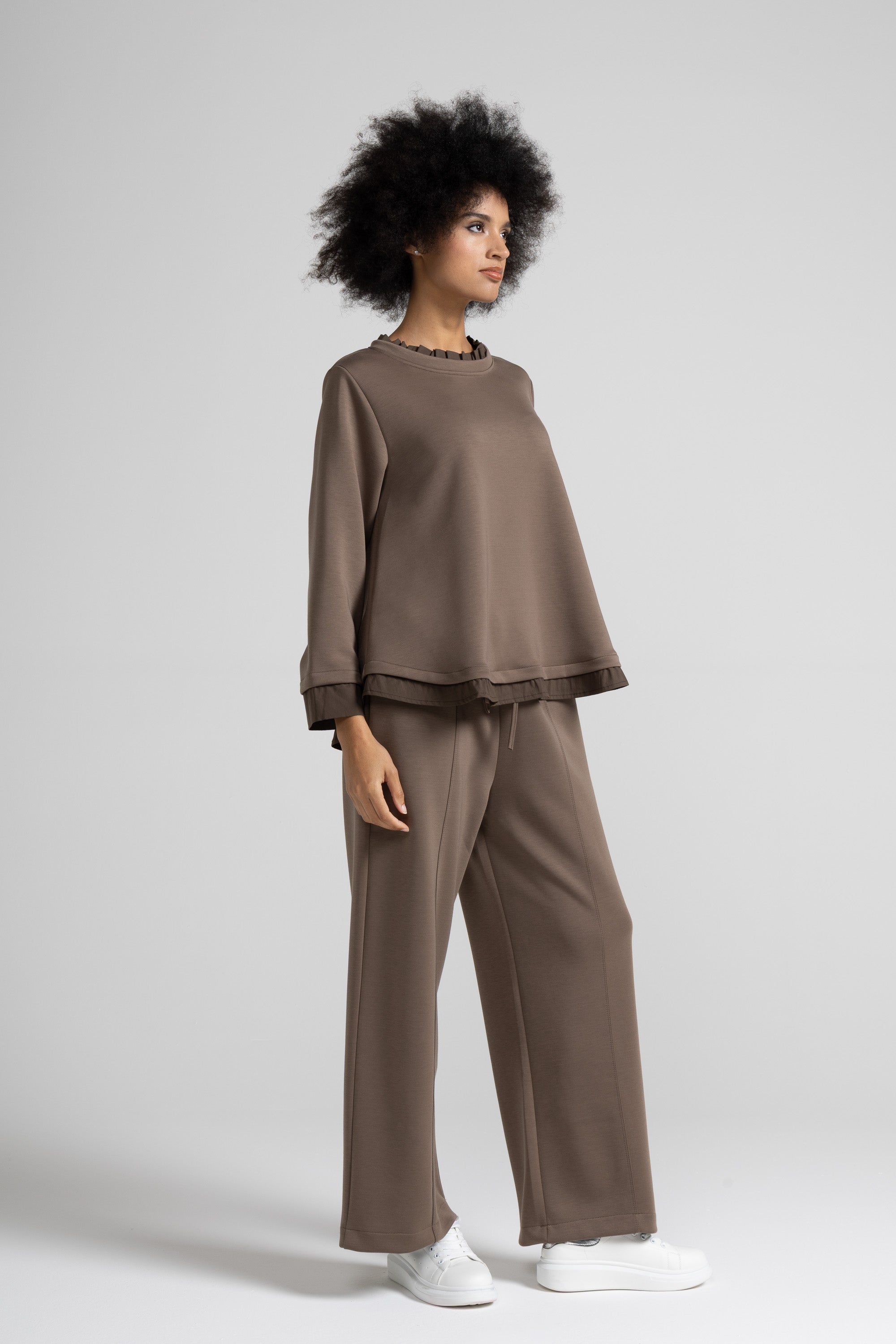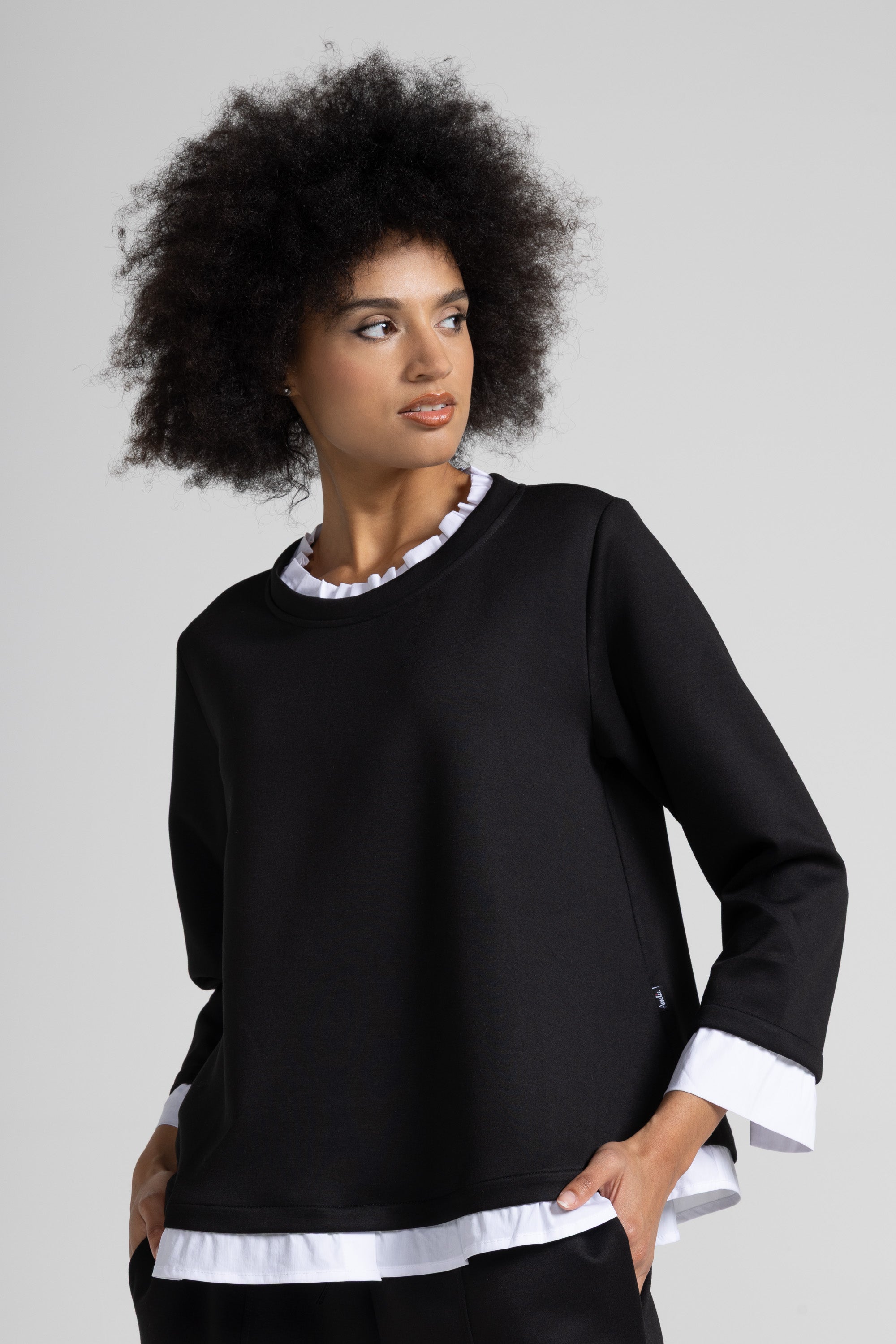 Top a trapezio in tessuto fluido di viscosa, scollo rotondo con dettaglio colletto in rouches in popeline, manica lunga, dettaglio popeline su manica e fondo.