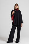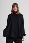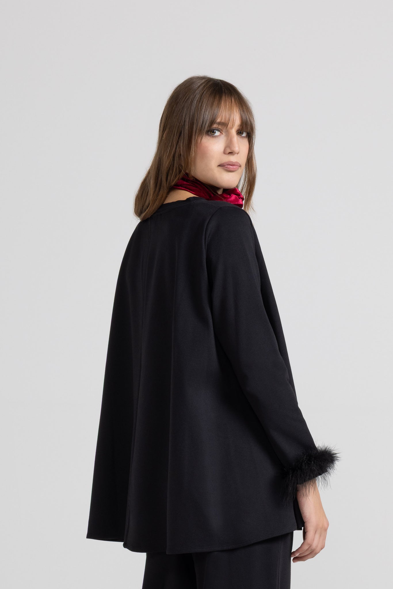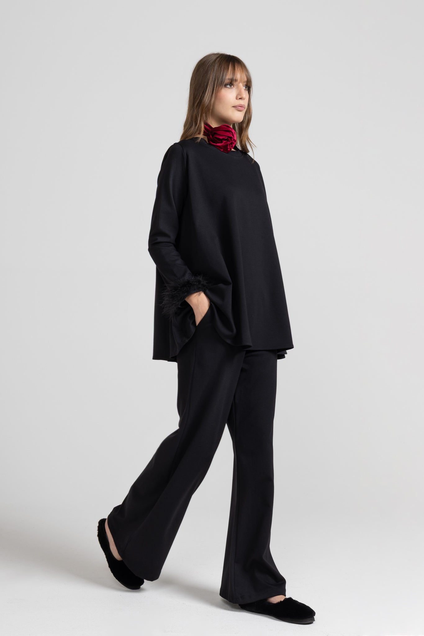 Top in tessuto punto Milano di viscosa, ampio girocollo ribattuto, linea a trapezio leggermente asimmetrico, manica lunga arricchite da un dettaglio in piuma sul fondo.