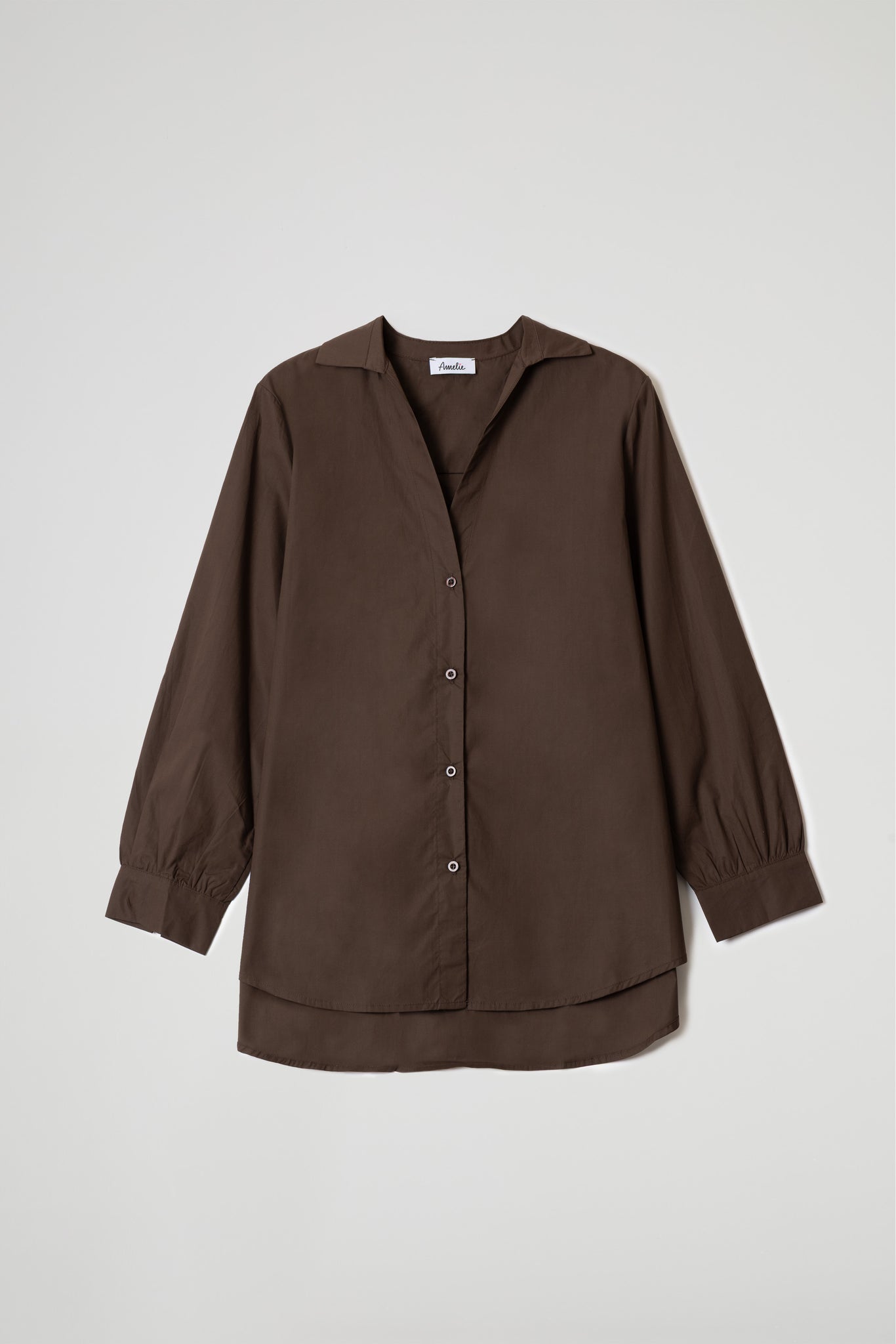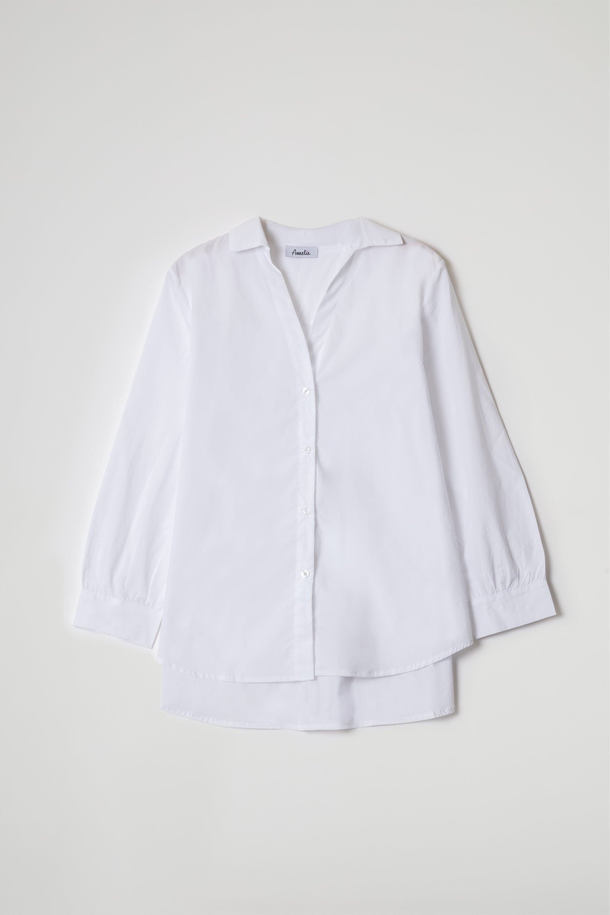 Camicia in popeline di cotone, scollo a V con colletto classico, maniche lunghe con polsino alto con bottone , chiusura frontale con botton sul davanti, taglio a carrè con piega sul retro, orlo a petalo sul fondo. Linea ampia.