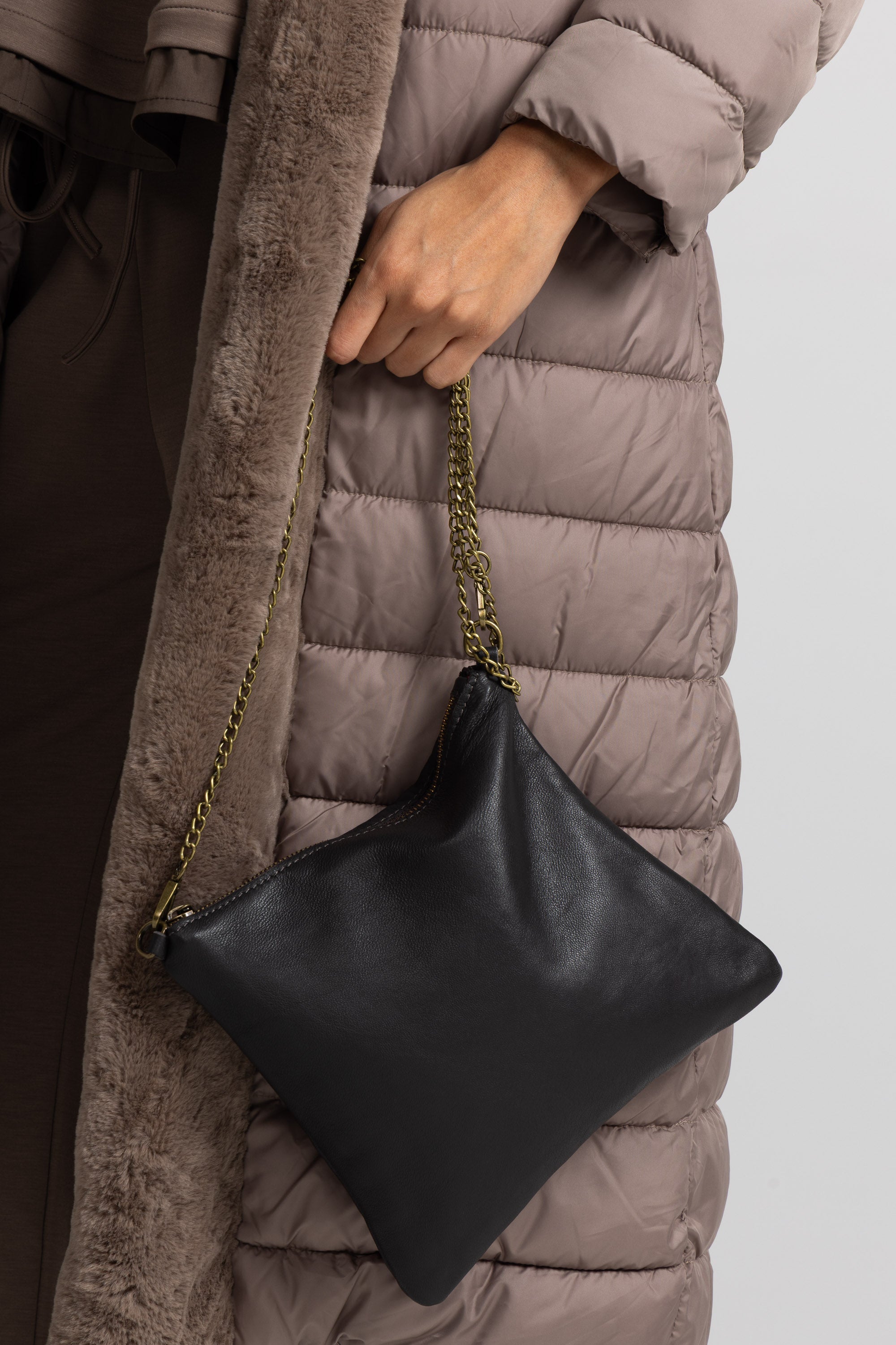 Elegante e raffinata, questa borsa è realizzata in vera pelle di montone garantendo resistenza e un tocco di classe. Il suo design compatto di 25x25 cm la rende perfetta per l'uso quotidiano adattandosi facilmente a qualsiasi outfit dal casual al più sofisticato. Dotata di chiusura con zip, l'interno è foderata in stoffa di cotone e presenta una tracolla in catena d'ottone.