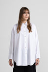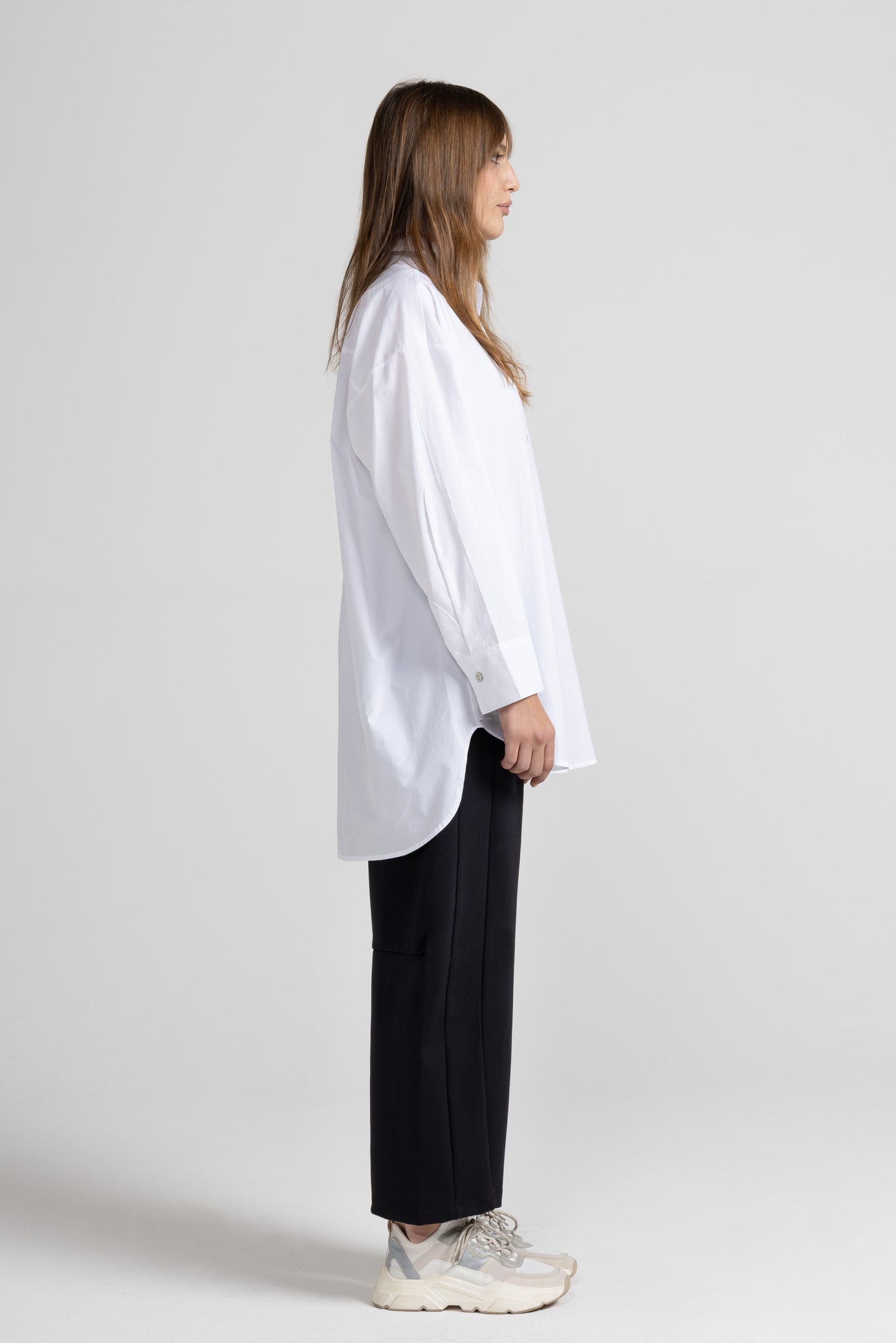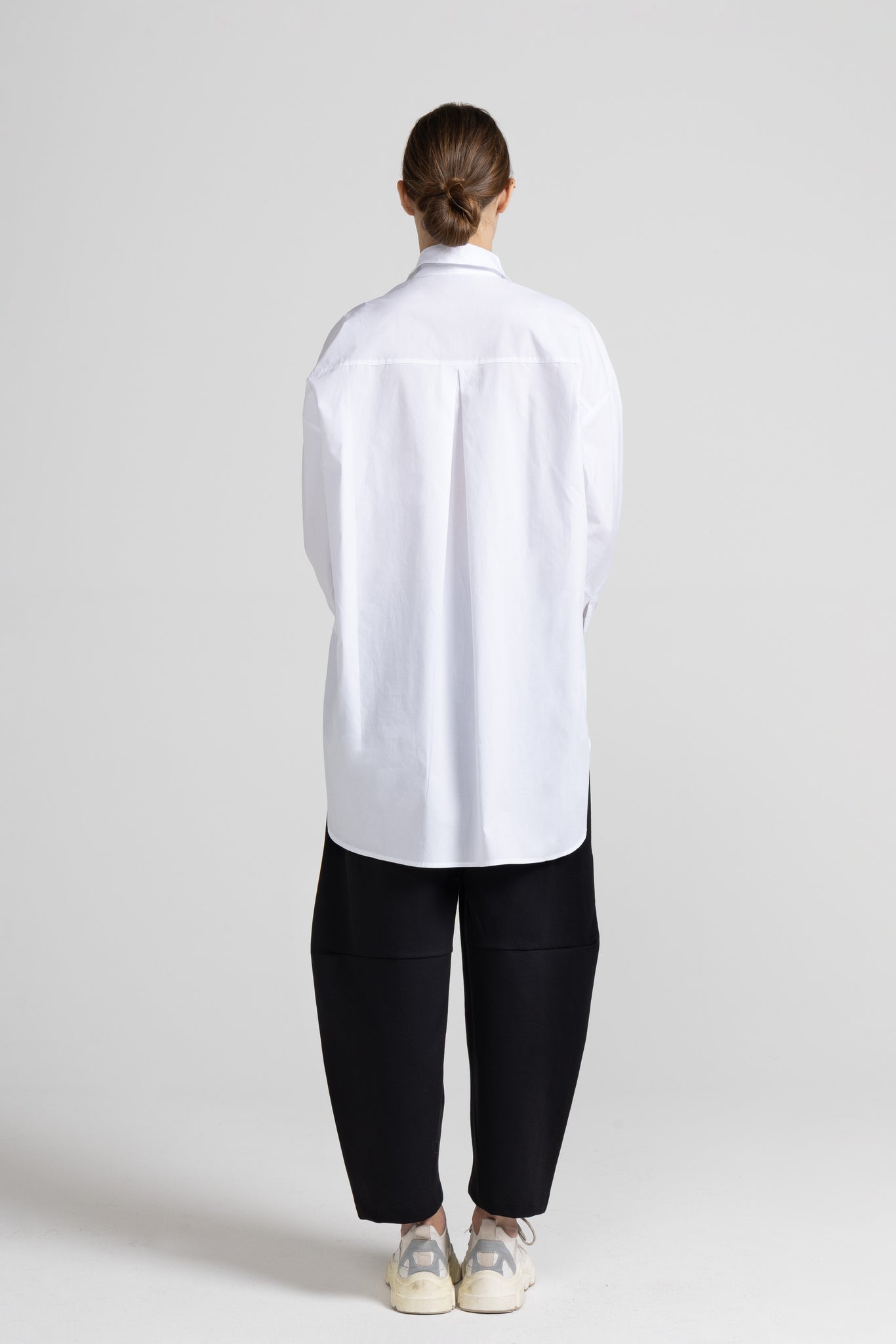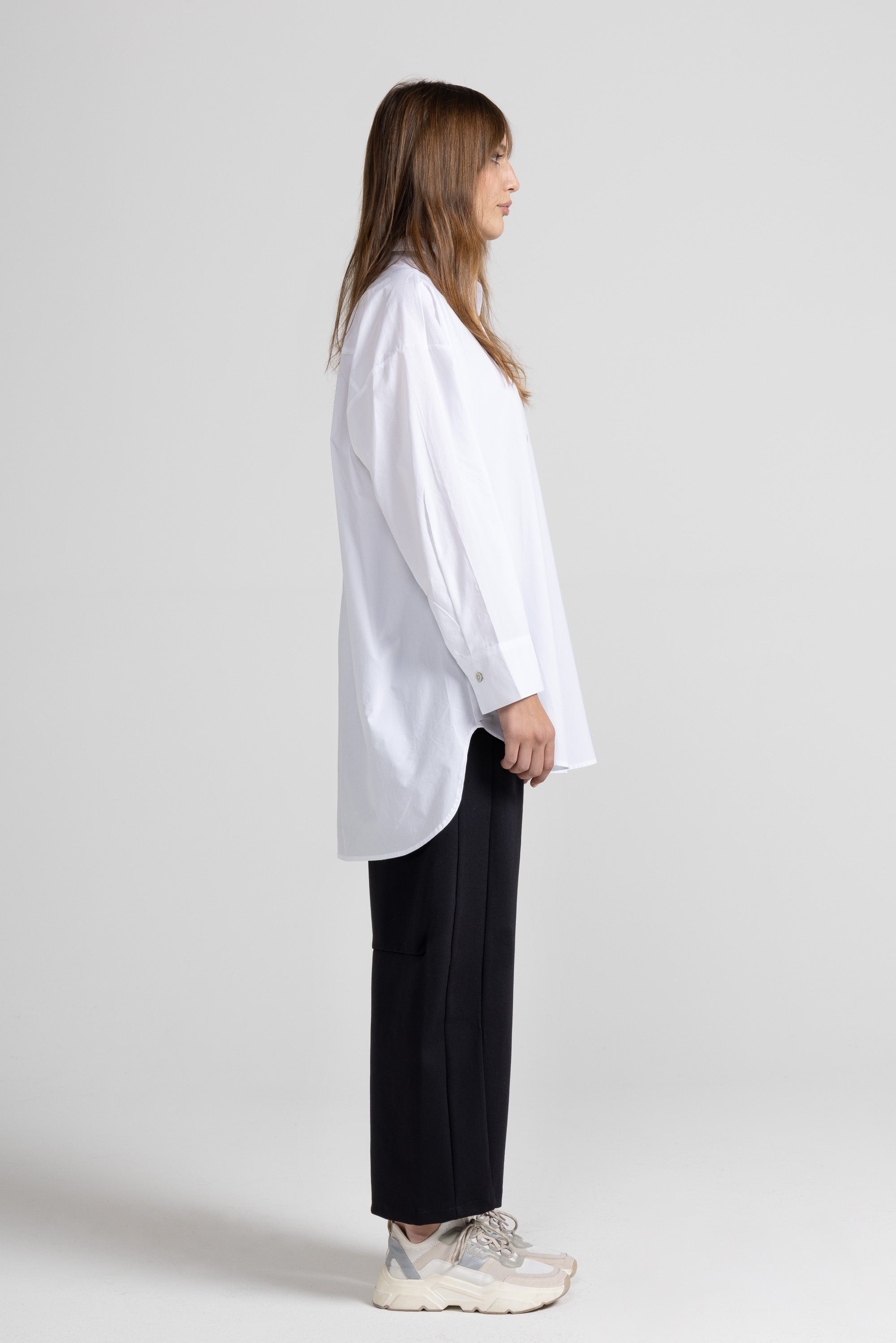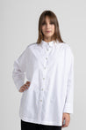 Camicia asimmetrica lunga in popeline di cotone, colletto alla francese, manica lunga con polso ribattuto alto con spacchetto e bottoncino per chiusura, chiusura sul davanti con bottoncini tono su tono, orlo a petalo sul fondo. Linea svasata.