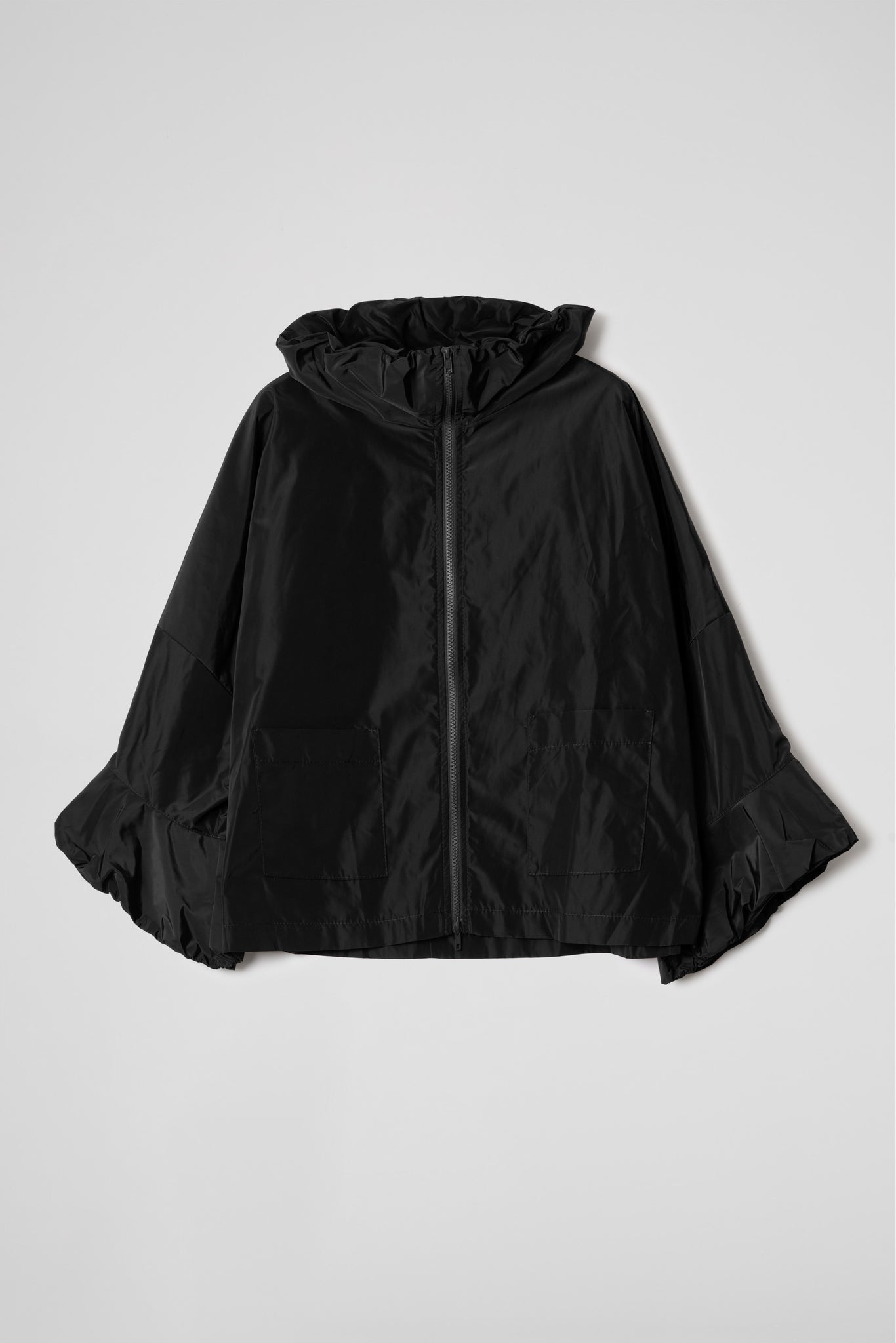 GIACCA CORTA IN TESSUTO TAFFETA’ EFFETTO NACRE’, COLLO E MANICA CON AMPIA ROUCHES,MANICA LUNGA, ZIP TONO SU TONO, TASCHE A TOPPA SUL FRONTE. LINEA BOXY ADATTA A TUTTE LE FISICITA’.