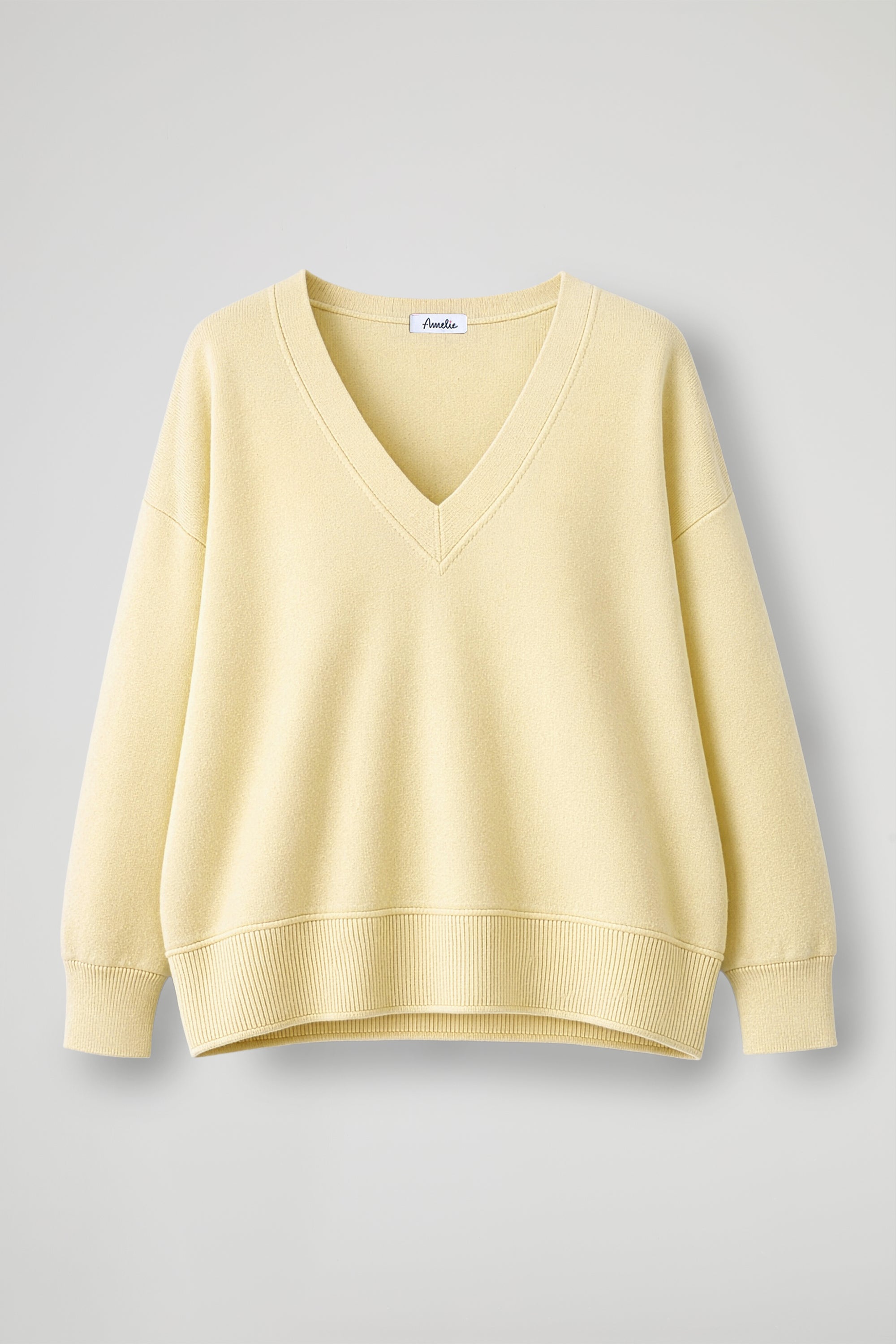 Maglia Over, scollo a V rifinito a coste, spalla scesa, manica lunga con dettaglio polsino alto a costine elasticizzato, fondo stondato con orlo alto a costine. Linea ampia.