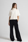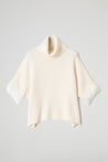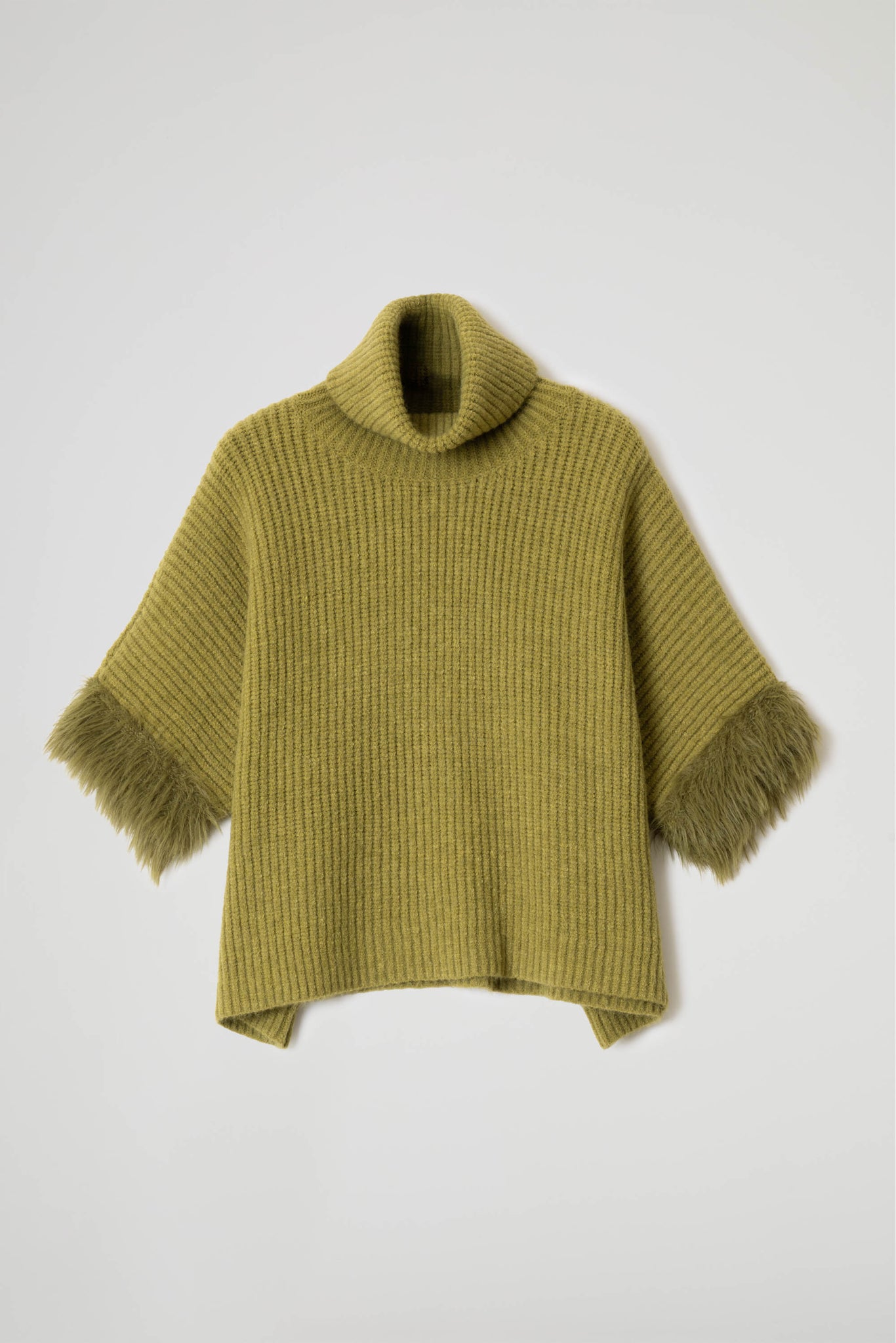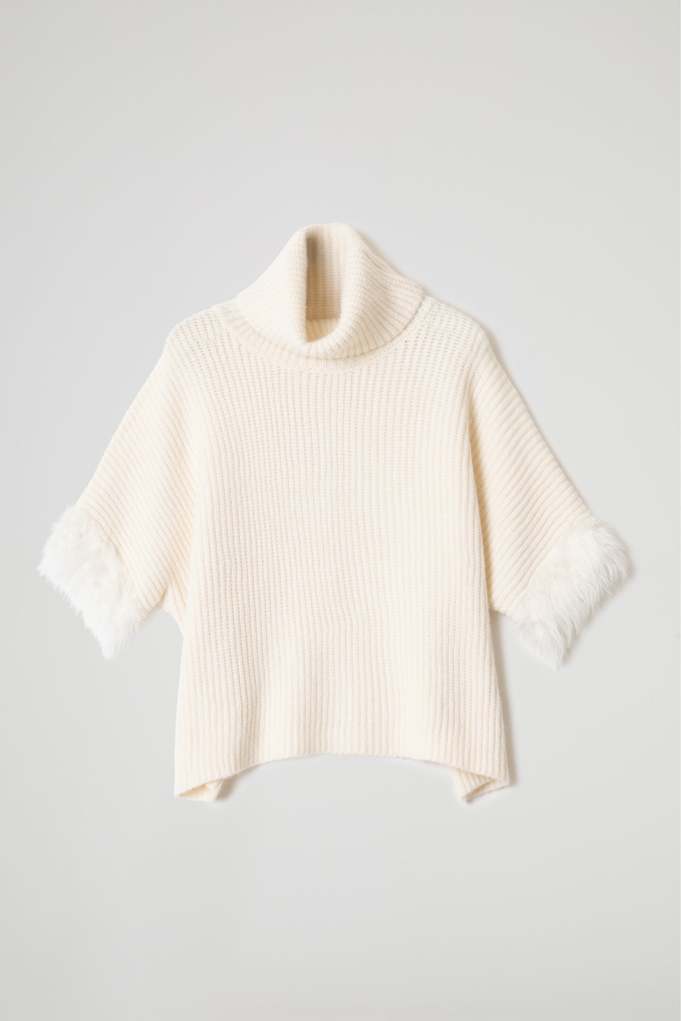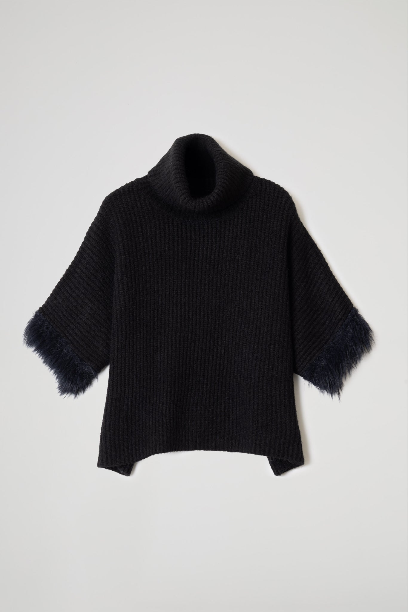Maglia dolcevita lavorata a coste, taglio boxy, collo risvoltato, spalle scese, maniche a 3/4 ampie a pipistrello arricchite da inserto in eco pelliccia .Linea ampia