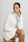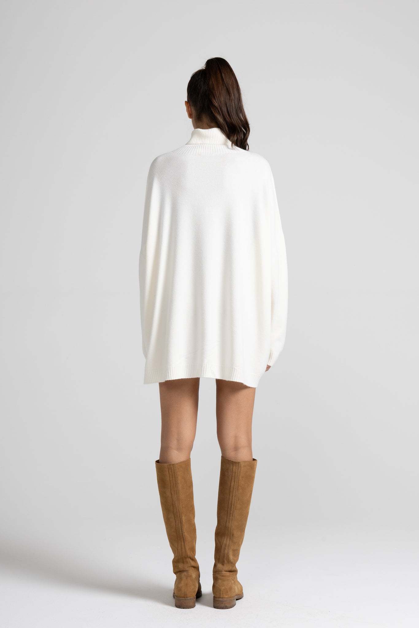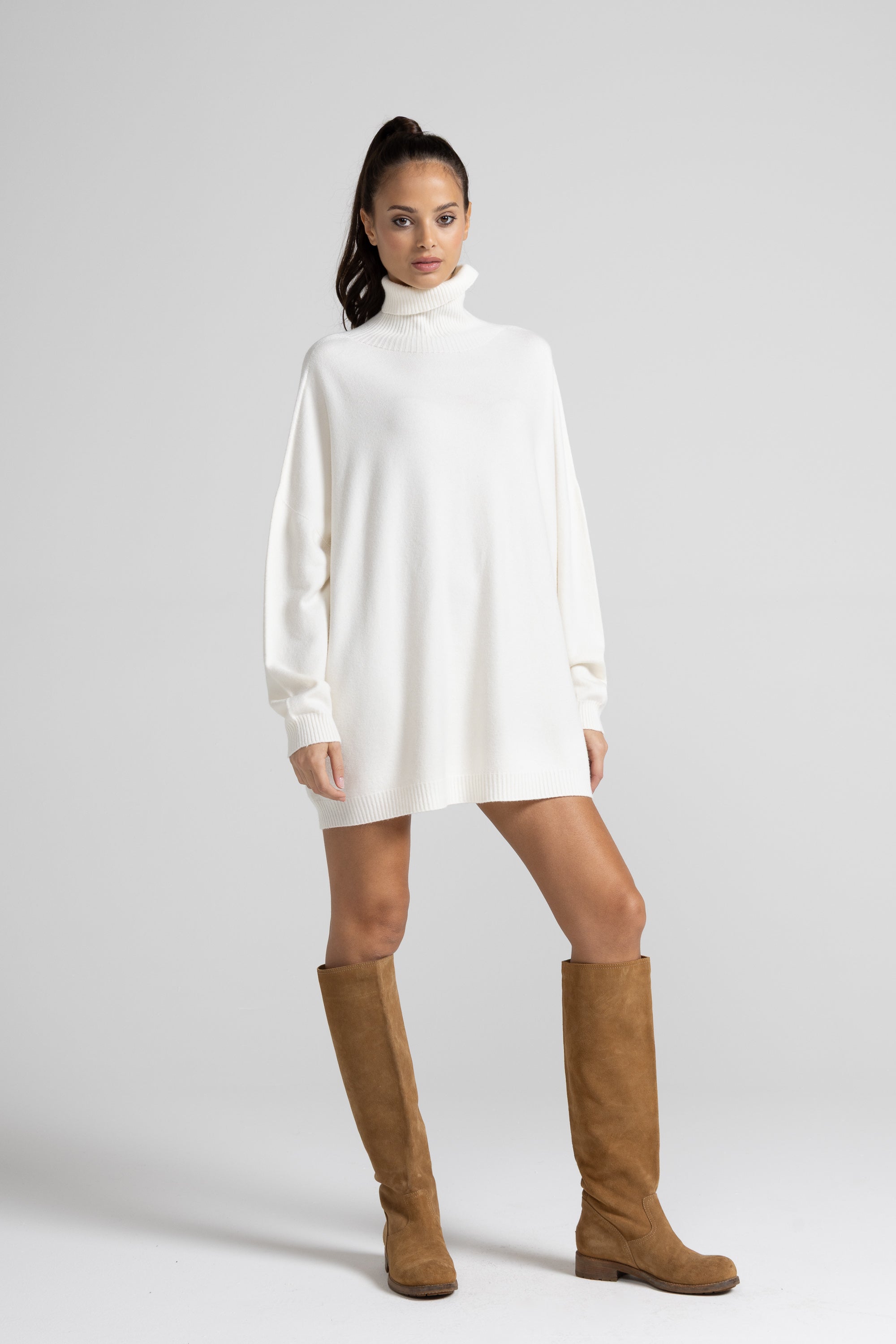 Collo alto e avvolgente a coste elasticizzate, spalle scese, maniche lunghe con polsini a costine fini elasticizzate, leggermente asimmetrico, lavorazione a bordo alto a costine compatte sul fondo. Linea ampia