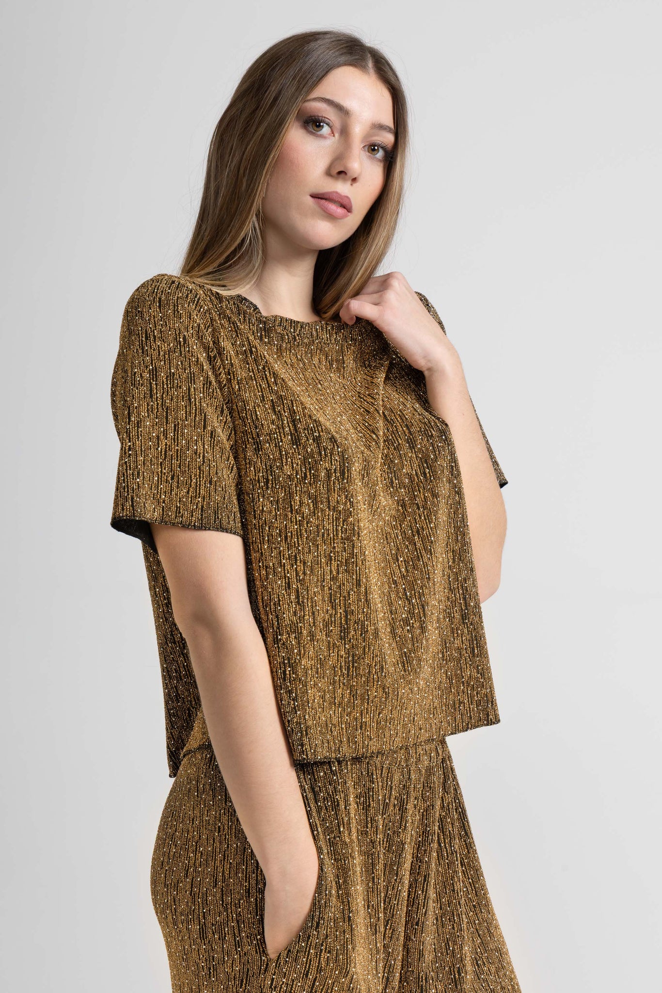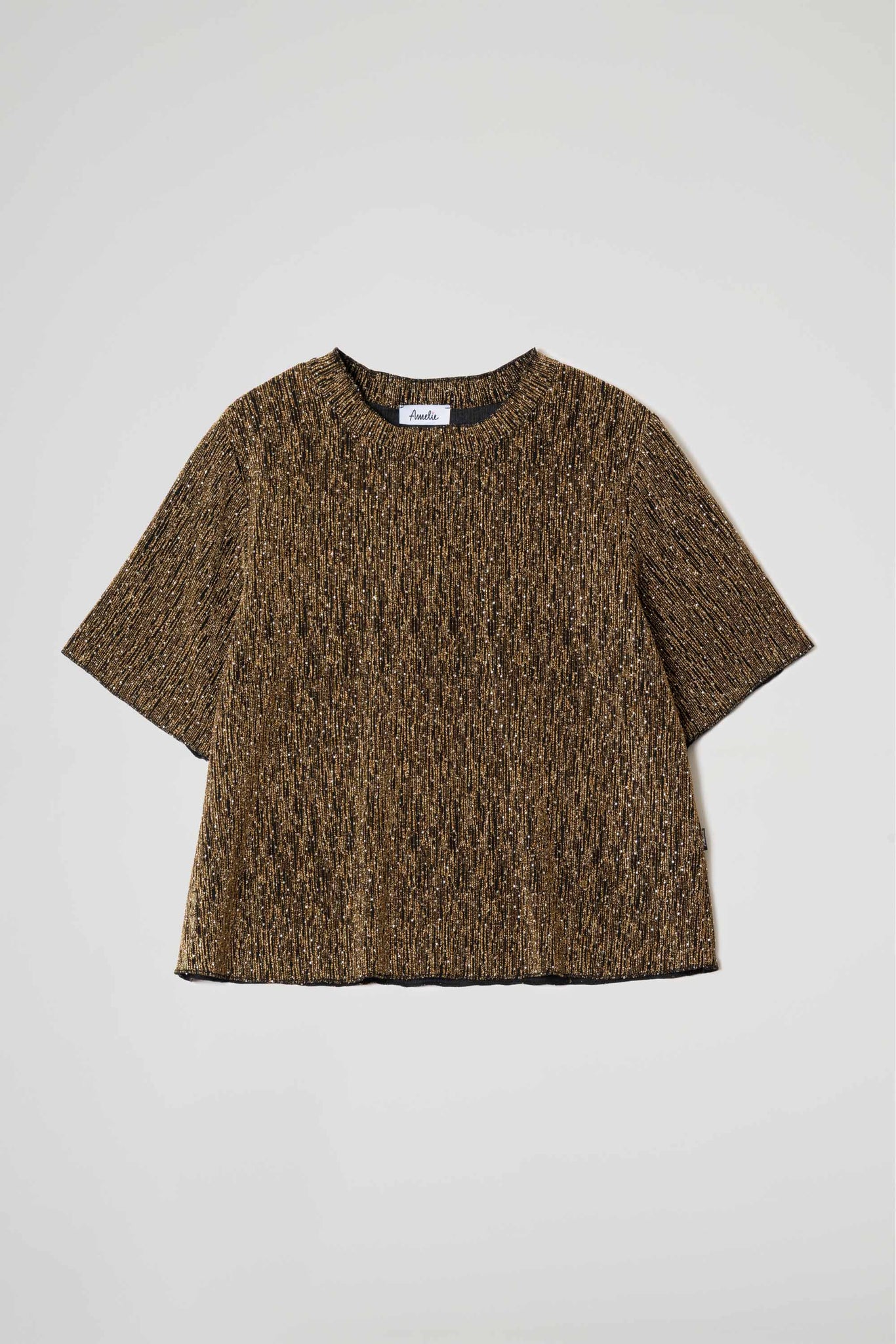 Realizzata in un tessuto leggero e brillante, la maglia unisce il comfort di una vestibilità morbida alla raffinatezza del filato lurex che cattura la luce con eleganza.