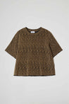 T-Shirt taglio boxy leggermente asimmetrica, tessuto elasticizzato, collo con orlo ribattuto, manica corta. Linea ampia