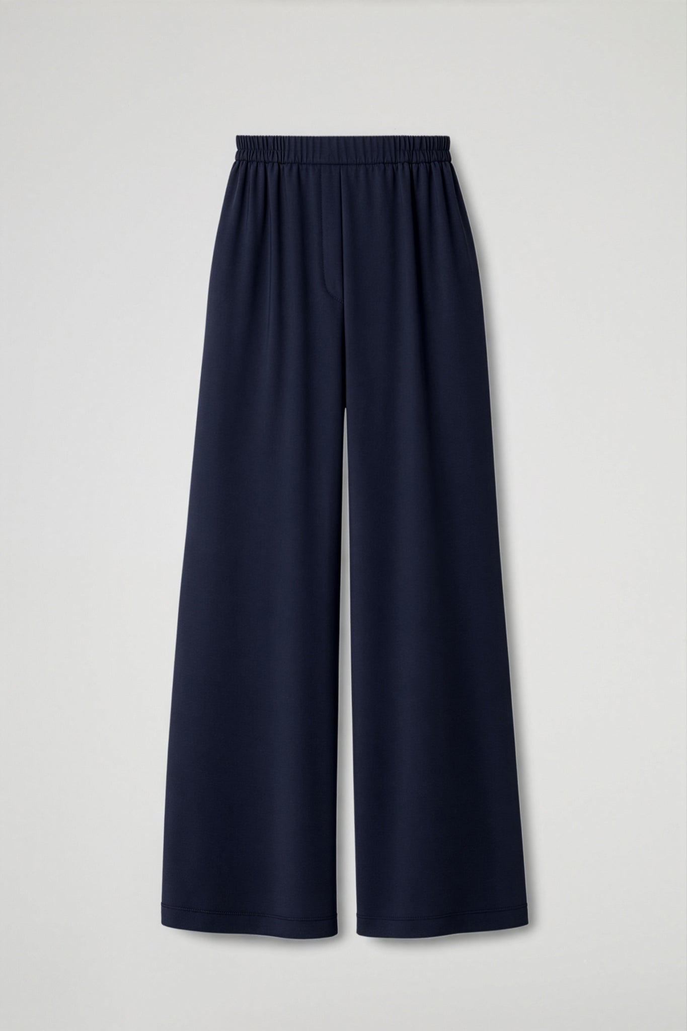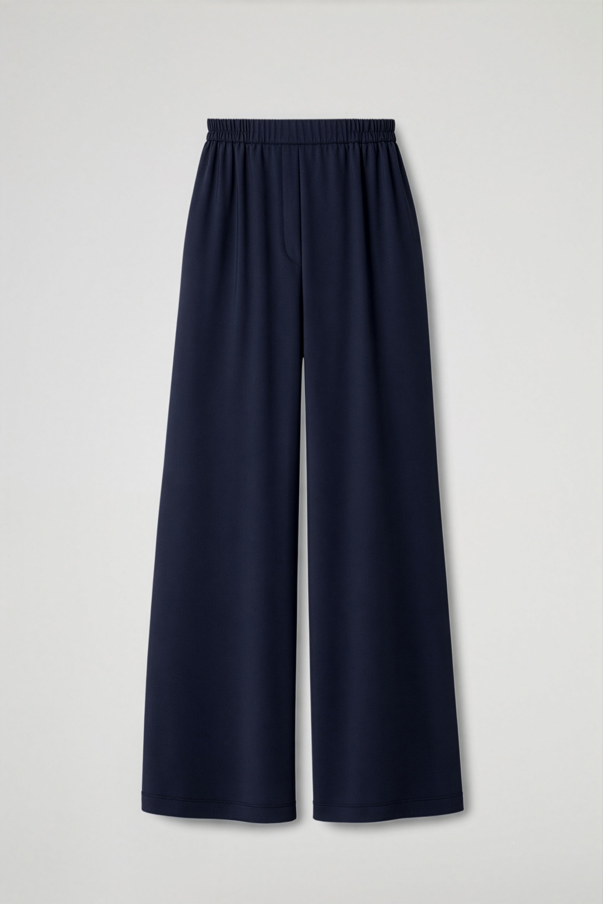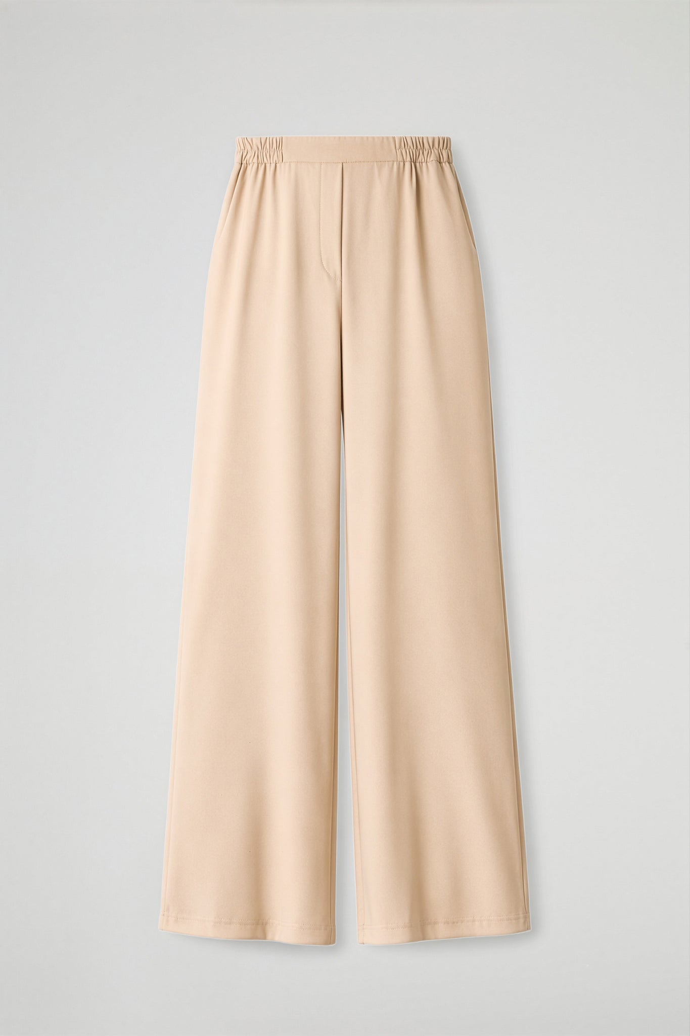 Pantalone a palazzo in tessuto fluido, vita elasticizzata, tasche alla americana. Linea ampia
