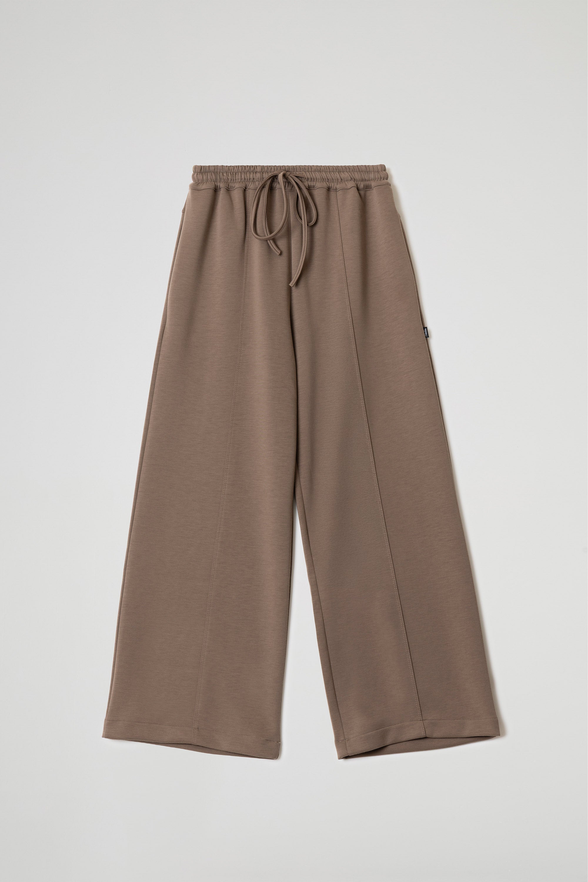Pantalone a palazzo, elastico e coulisse regolabile in vita, tasche a filo, taglio a V sul retro, impuntura su gamba.