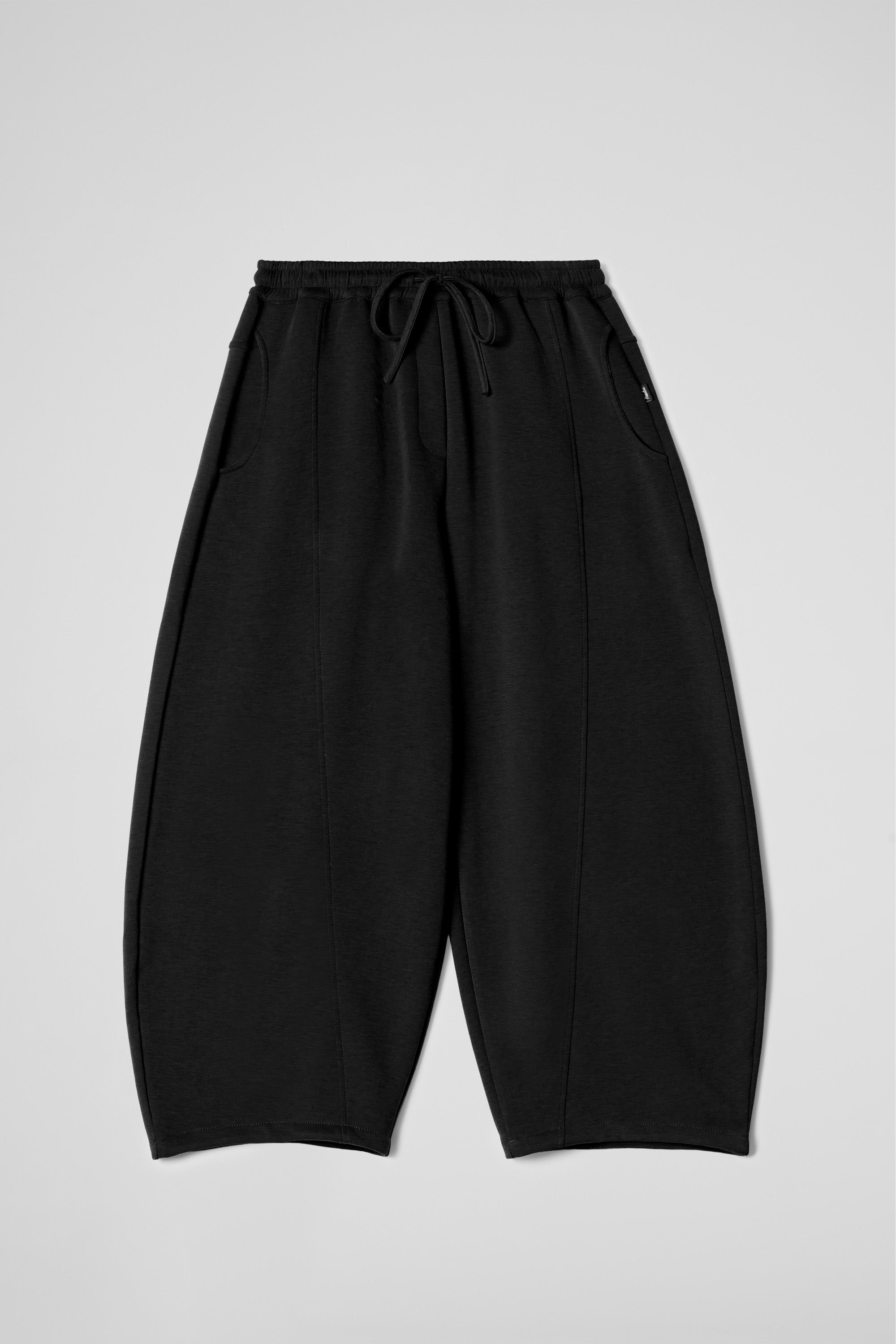 Taglio baggy, vita elastica con coulisse regolabile in tono, due tasche laterali, cucitura centrale frontale, orlo ribattuto sul fondo. Linea ampia.