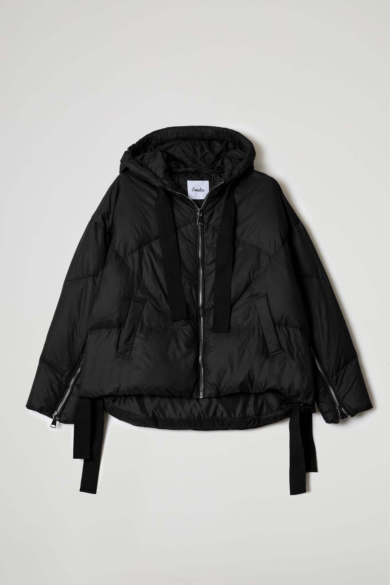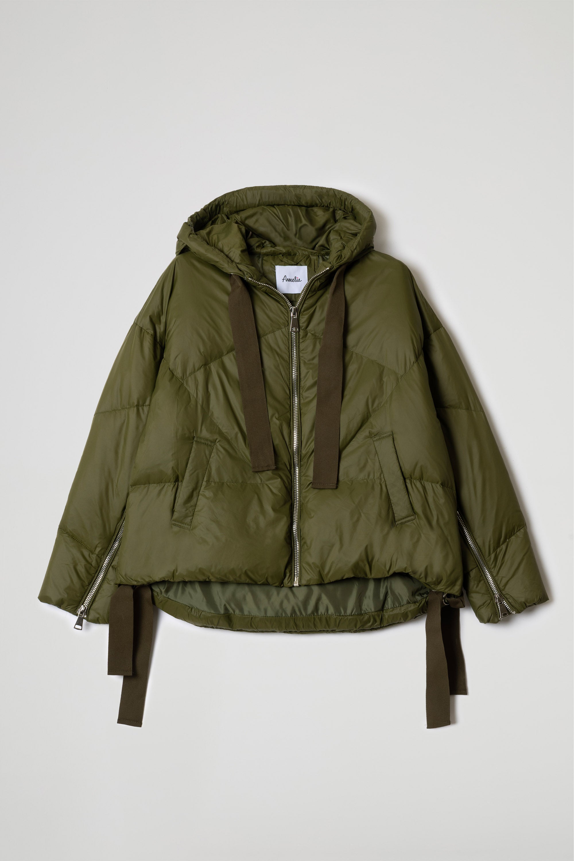 Piumino corto trapuntato, cappuccio regolabile con nastro nero, manica lunga con apertura zip sul fondo, chiusura frontale con zip, tasche laterali con patta inclinata, coulisse a nastri regolabile sul fondo. Linea ampia