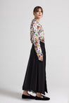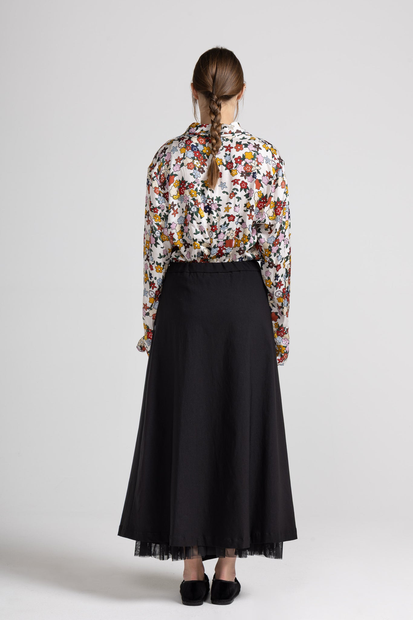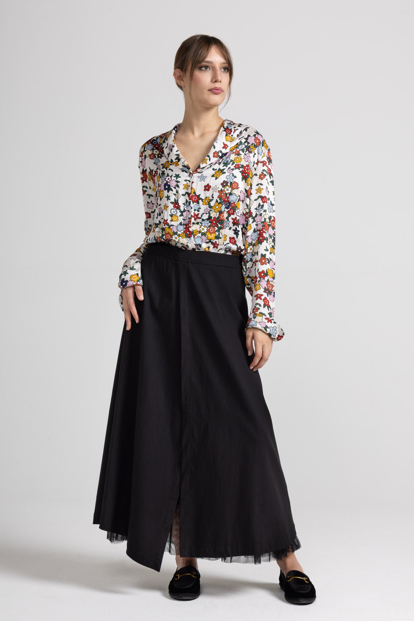 Blusa in raso di viscosa, un capo che unisce stile romantico e comfort moderno. Realizzata in tessuto leggero e fluido, avvolge la silhouette con grazia, offrendo una vestibilità morbida e raffinata, la stampa floreale multicolore su fondo chiaro dona un tocco di allegria e femminilità.