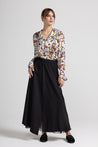 Blusa asimmetrica, scollo a V con piccolo revers, maniche lunghe con dettaglio spacchetto e orlo alto su polsi, chiusura frontale con bottoni. Linea morbida