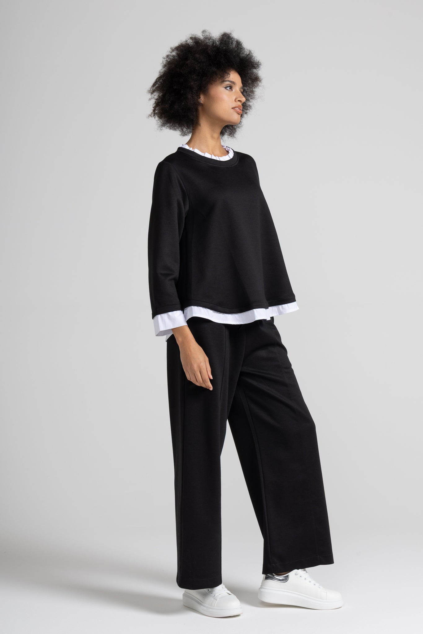 Pantalone a palazzo, elastico e coulisse regolabile in vita, tasche a filo, taglio a V sul retro, impuntura su gamba.