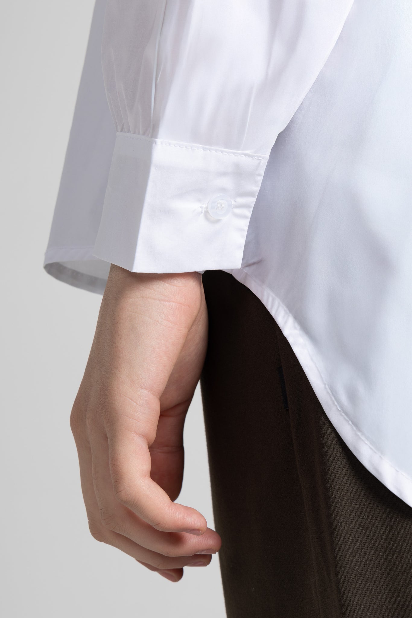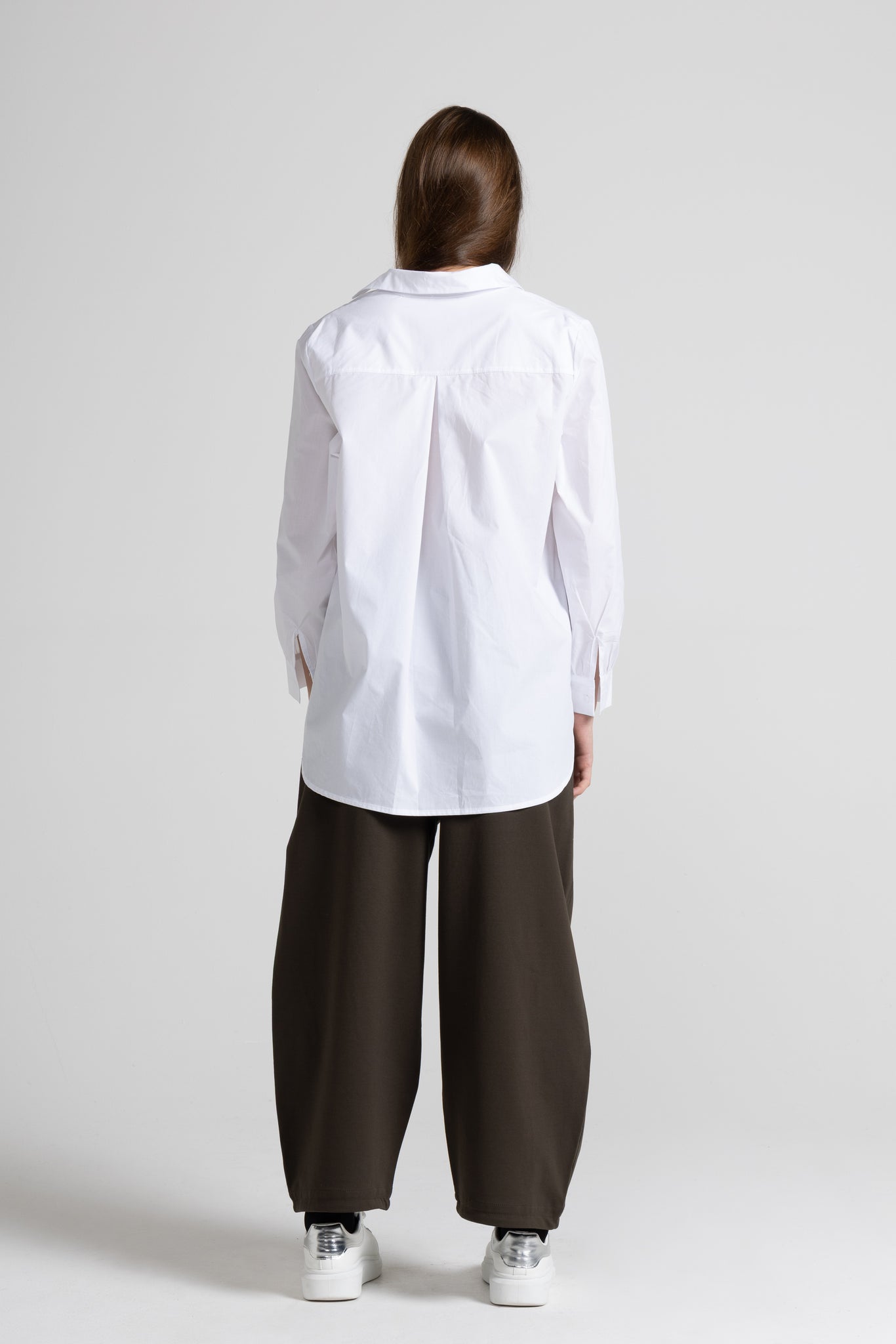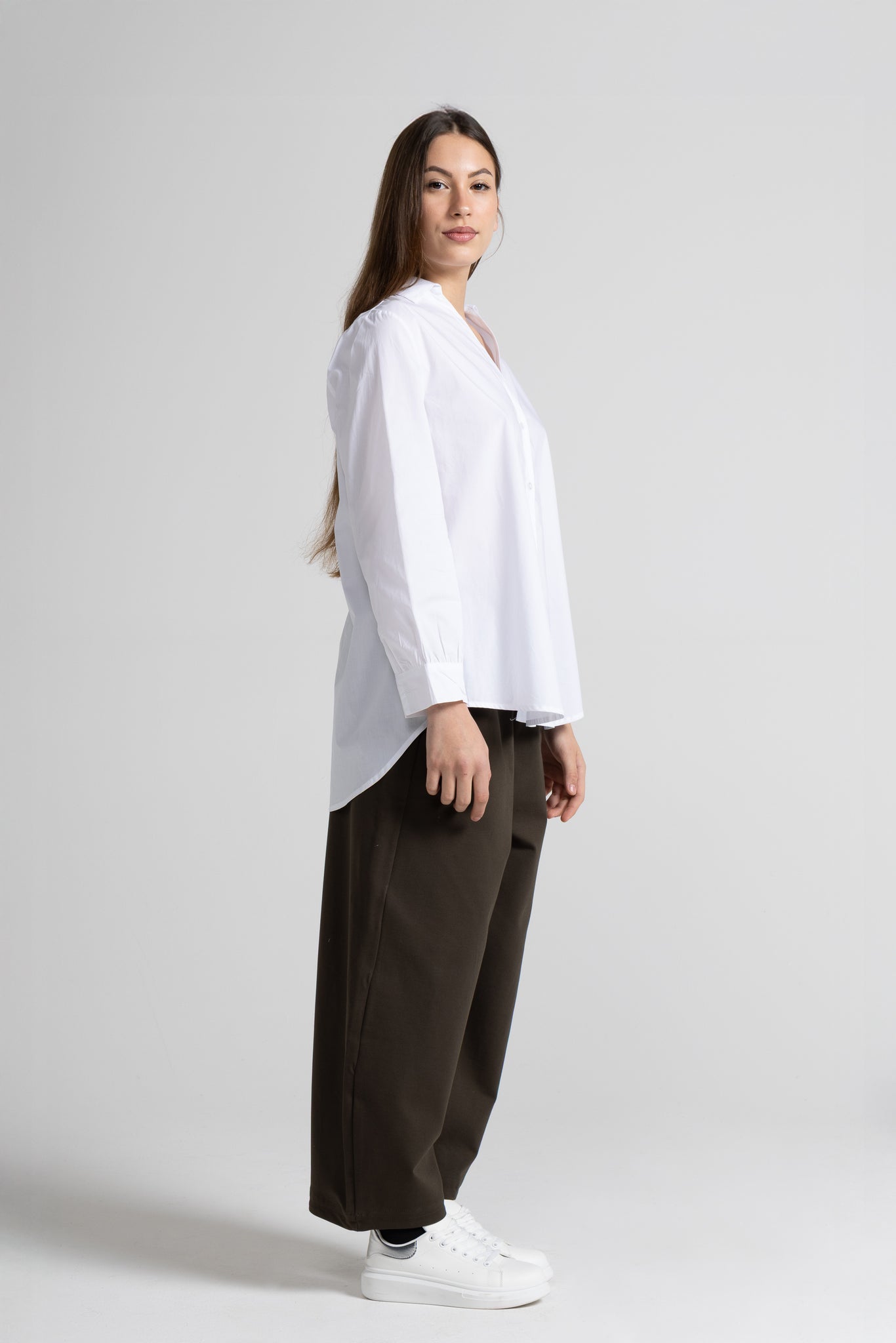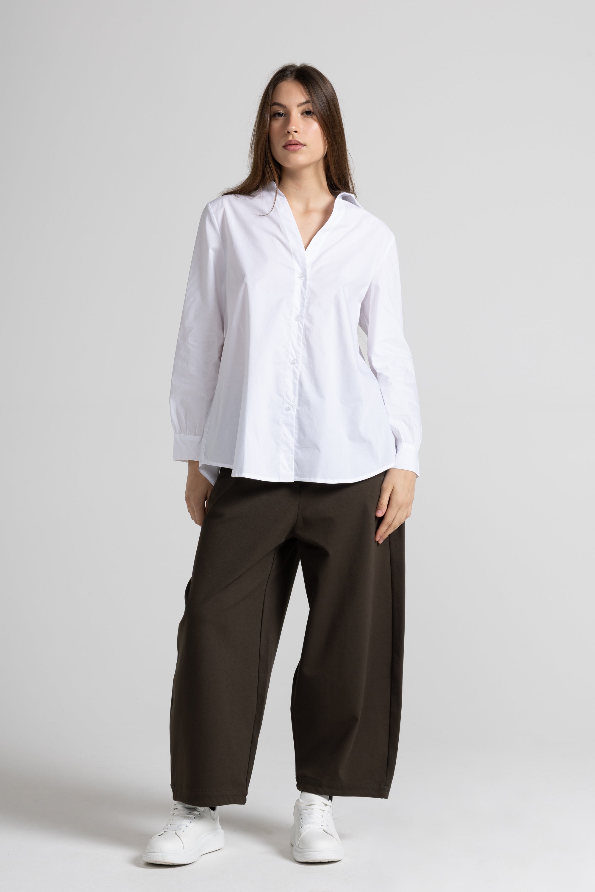 Camicia in popeline di cotone, scollo a V con colletto classico, maniche lunghe con polsino alto con bottone , chiusura frontale con botton sul davanti, taglio a carrè con piega sul retro, orlo a petalo sul fondo. Linea ampia.