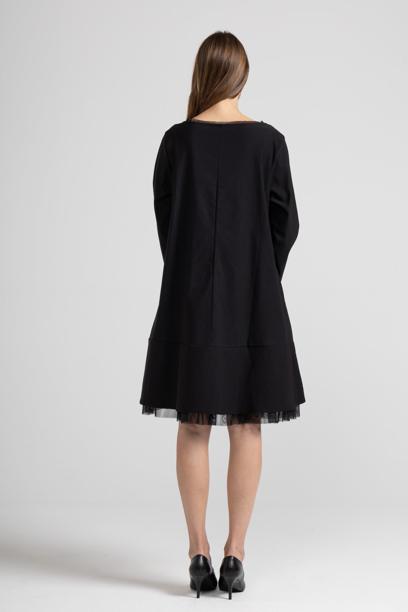 Midi dress in stretch viscose bengaline fabric, crew neck finished with tulle insert, long sleeves, welt pockets, flared line with slightly asymmetrical hem, decorative stitching at the bottom, tulle detail at the hem that adds a touch of lightness and refinement to the dress, giving it a feminine and modern look.