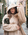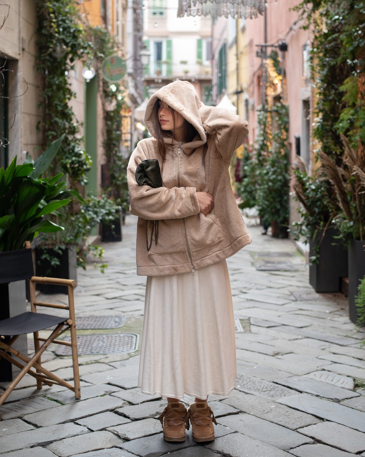 Cappuccio ampio e fisso, spalle scese, manica lunga, chiusura frontale con zip a doppio cursore, due tasche applicate con apertura diagonale rinforzata, orlo leggermente stondato.