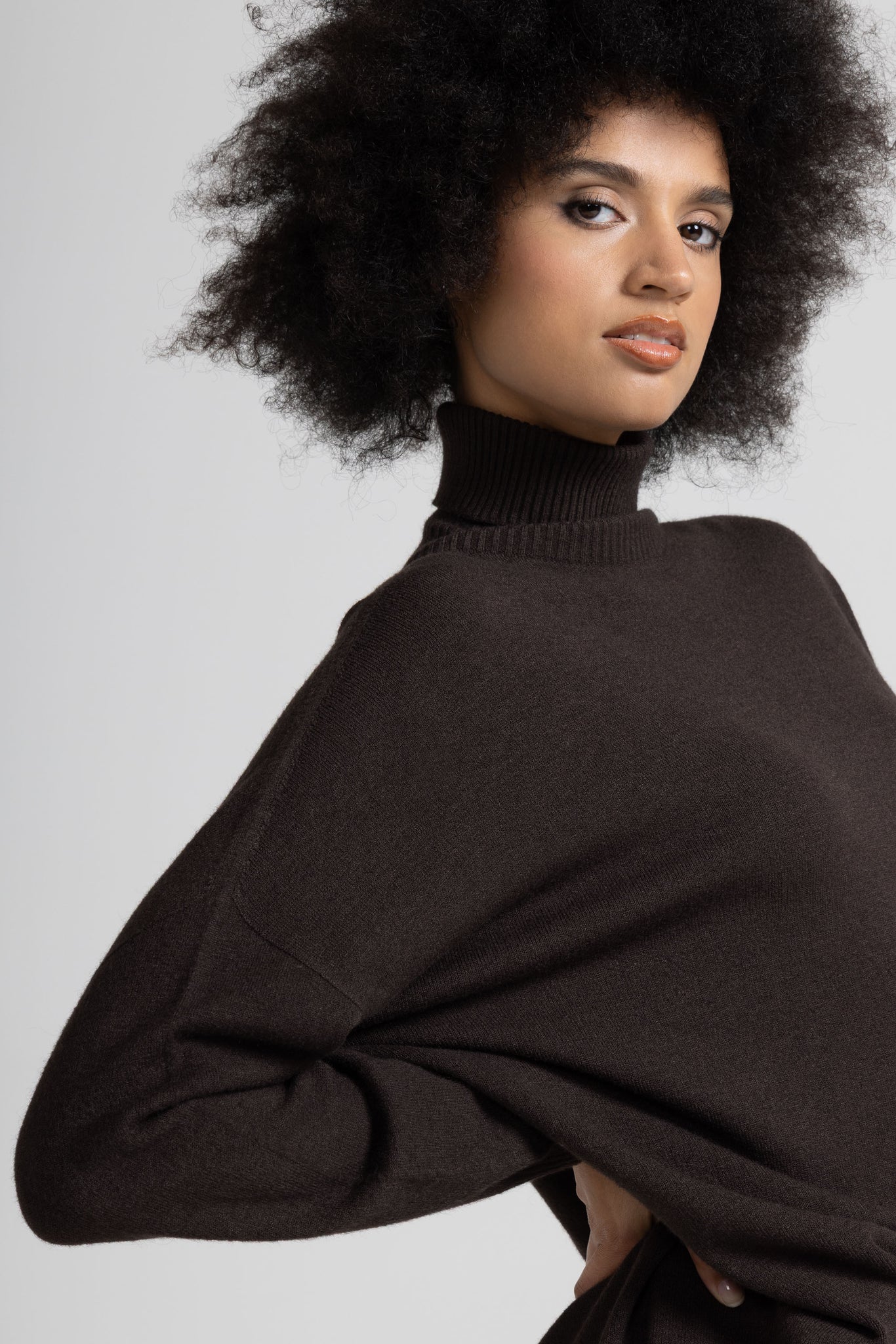 Maglia Over asimmetrica in morbida maglina di viscosa, eleganza essenziale e comfort assoluto si incontrano in questo dolcevita a collo alto, Il suo taglio morbido e la lavorazione pulita lo rendono un must-have trasversale: dalla quotidianità urbana al look più ricercato.