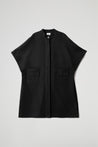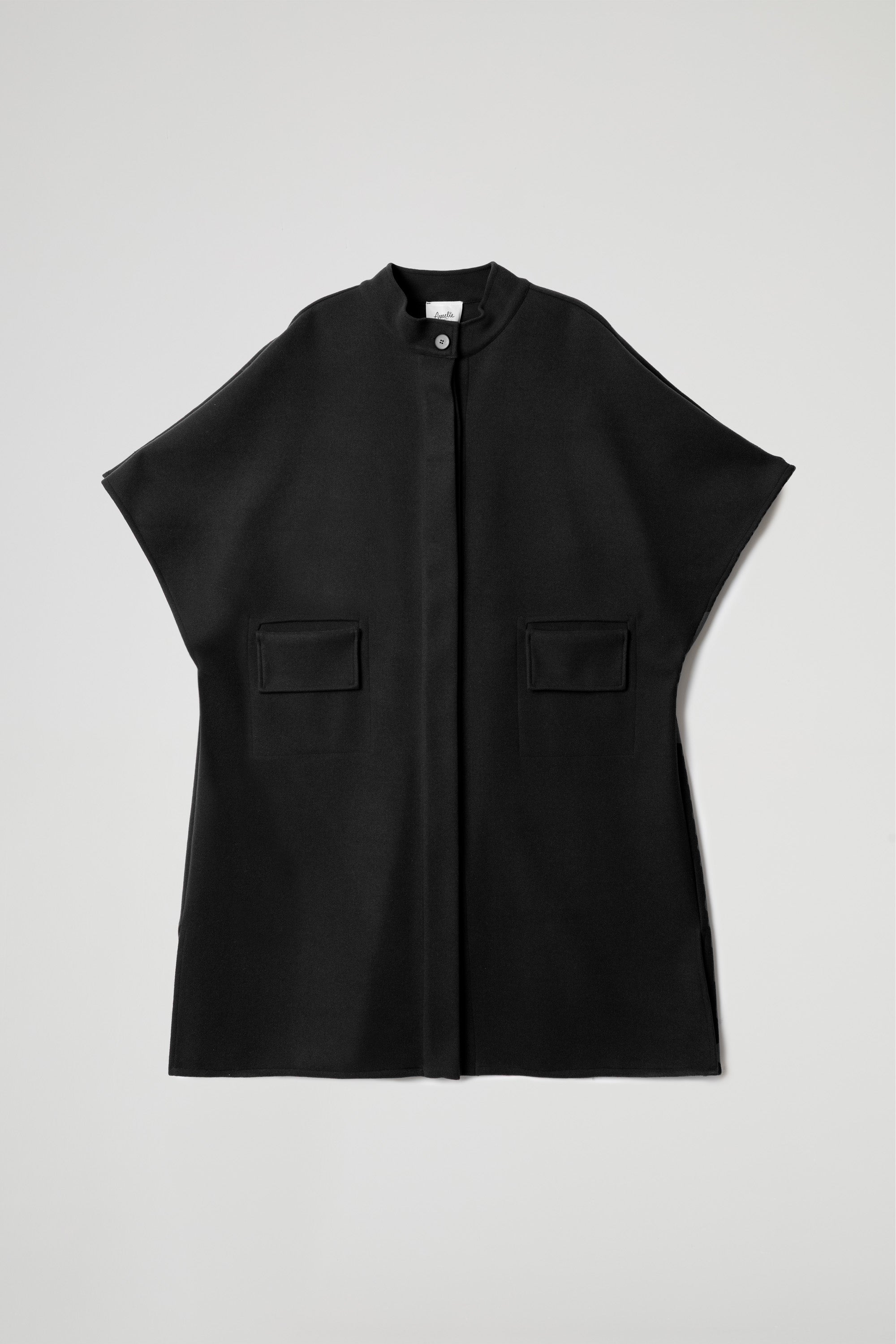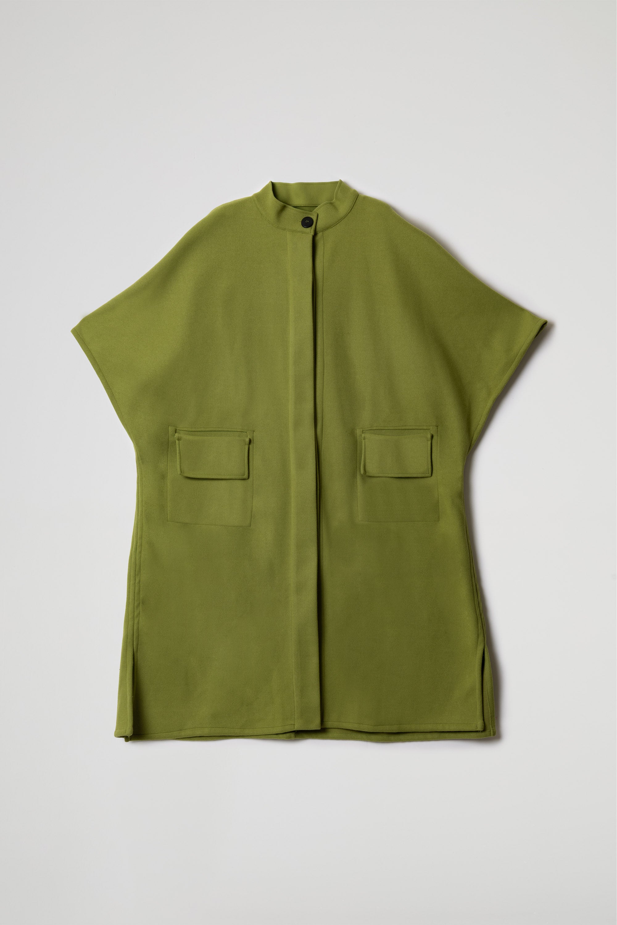 MAXI COAT IN WOOL CLOTH FABRIC, PATCH POCKETS WITH REVERSED FLAP, CAPE-SHAPED SLEEVES WITH BUTTON DETAIL THAT OPENS TO ALLOW FOR EVEN MORE VOLUME, SIDE SLITS, SLIGHTLY EGG-SHAPED LINE, BUTTON CLOSURE AND COVER-UP SHOW, HIGH COLLAR. OVER LINE