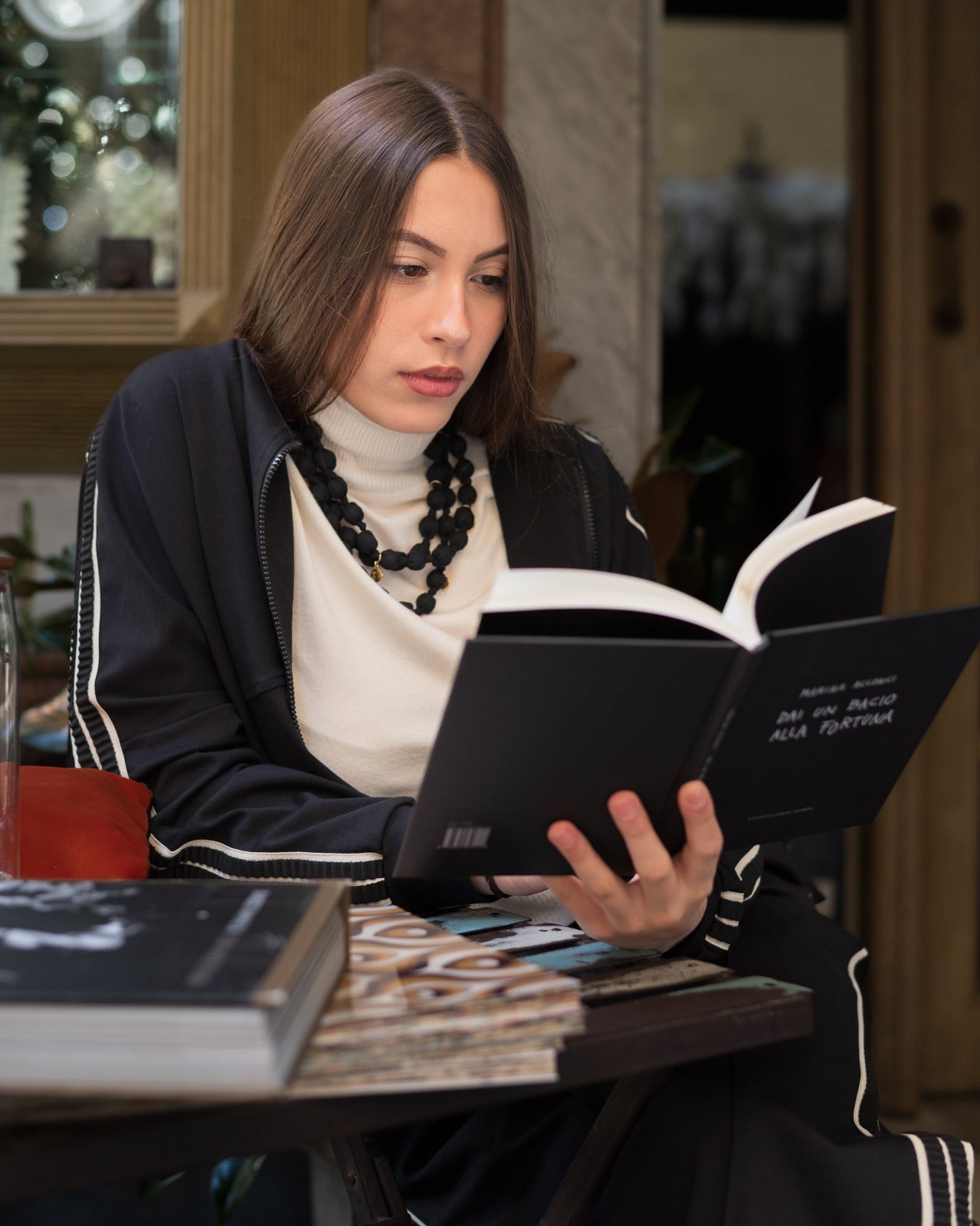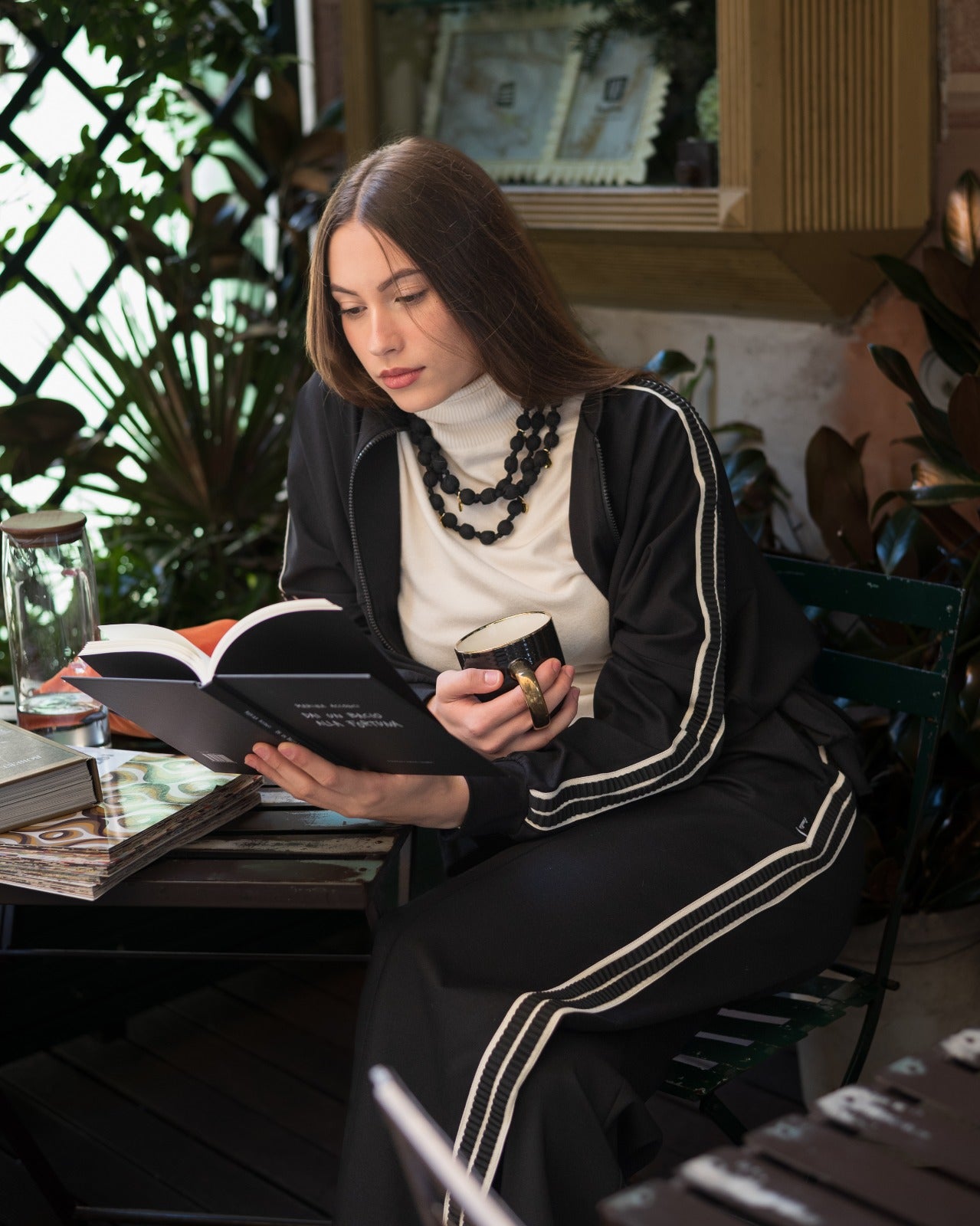 BOMBER JACKET IN MILAN STITCH IN VISCOSE, CENTRAL FOLDED CUT DETAIL, LONG SLEEVES, HIGH FOLDED CUFFS AND BOTTOM, PASSMANDER DETAIL ALONG THE LENGTH OF THE SLEEVE.
