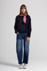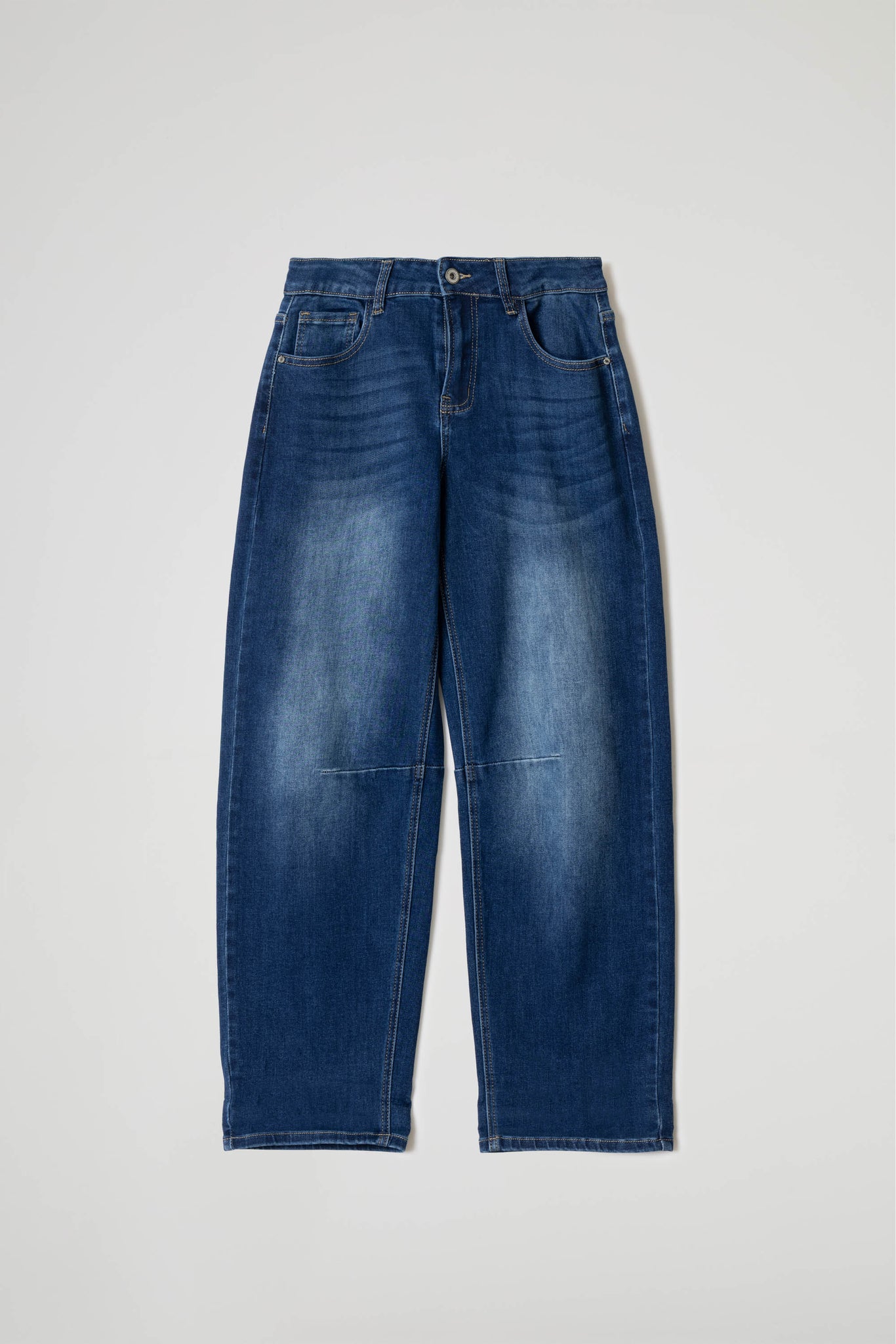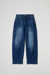 Slightly cropped stretch denim, faded wash, metal button and hidden zip fastening, five classic pockets including one coin pocket, horizontal stitching detail at the knees that gives a modern and structured touch.