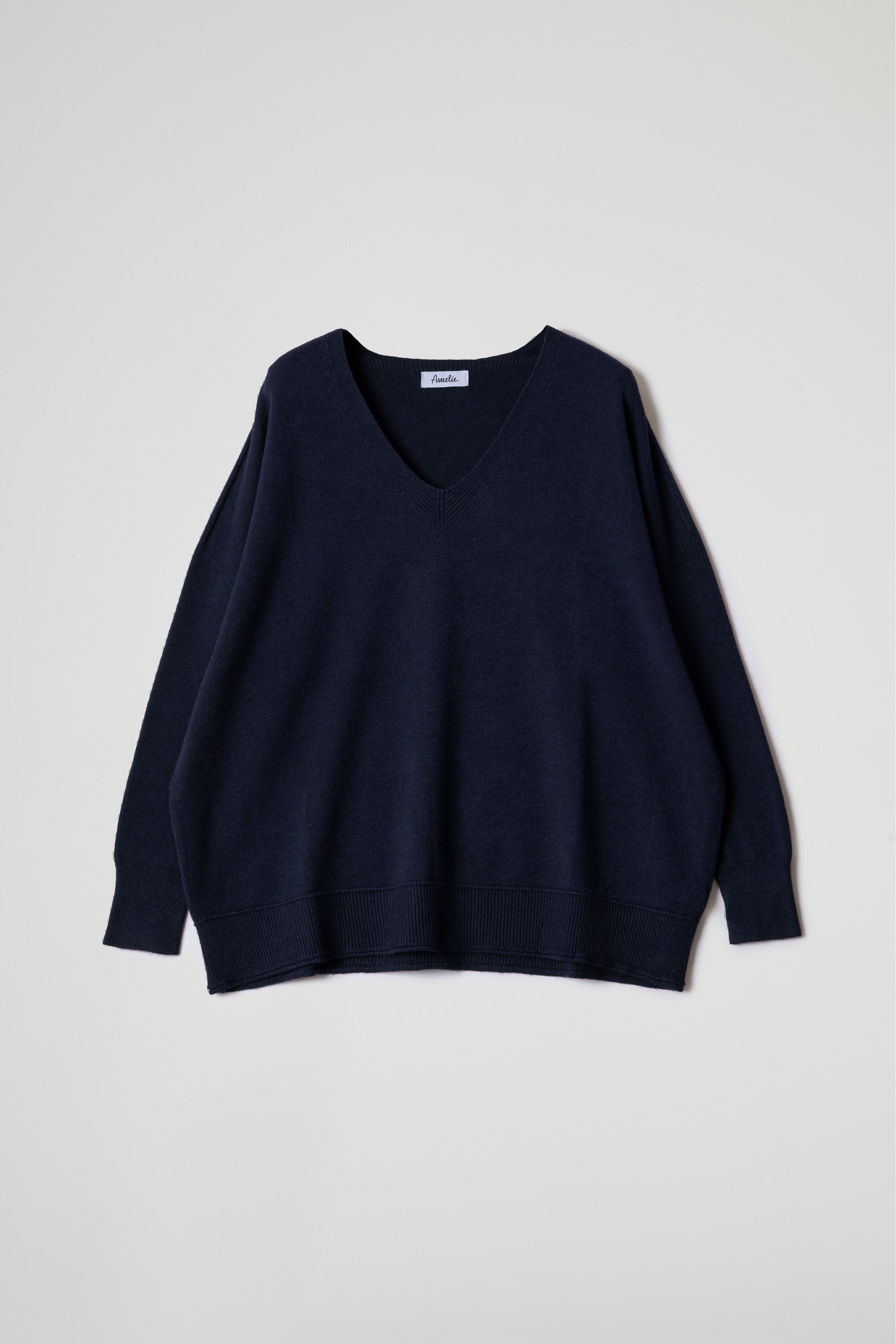 Oversized sweater, ribbed V-neck, dropped shoulders, long sleeves with high elastic ribbed cuffs, rounded hem with high ribbed hem. Loose fit.