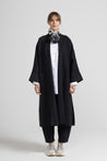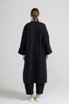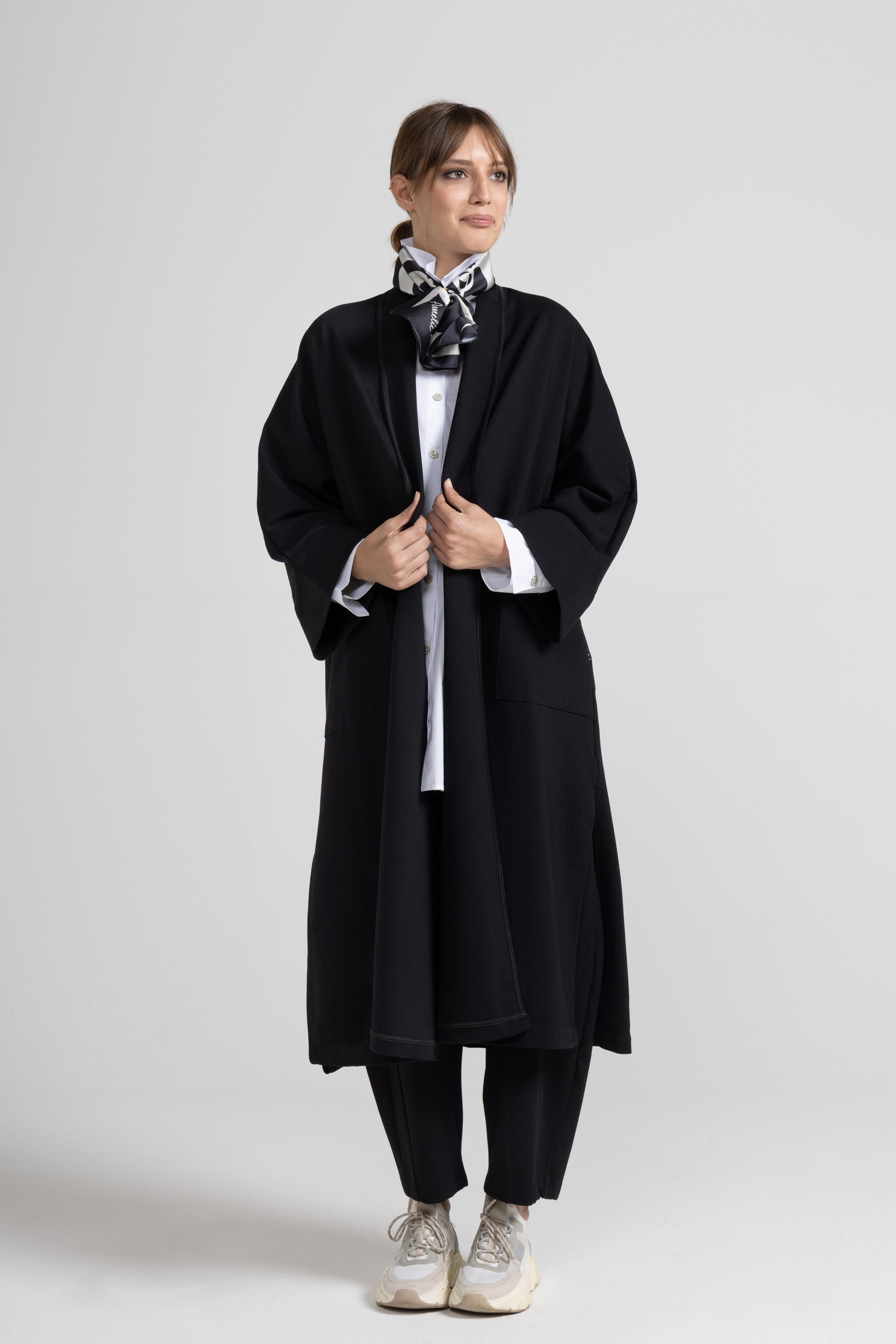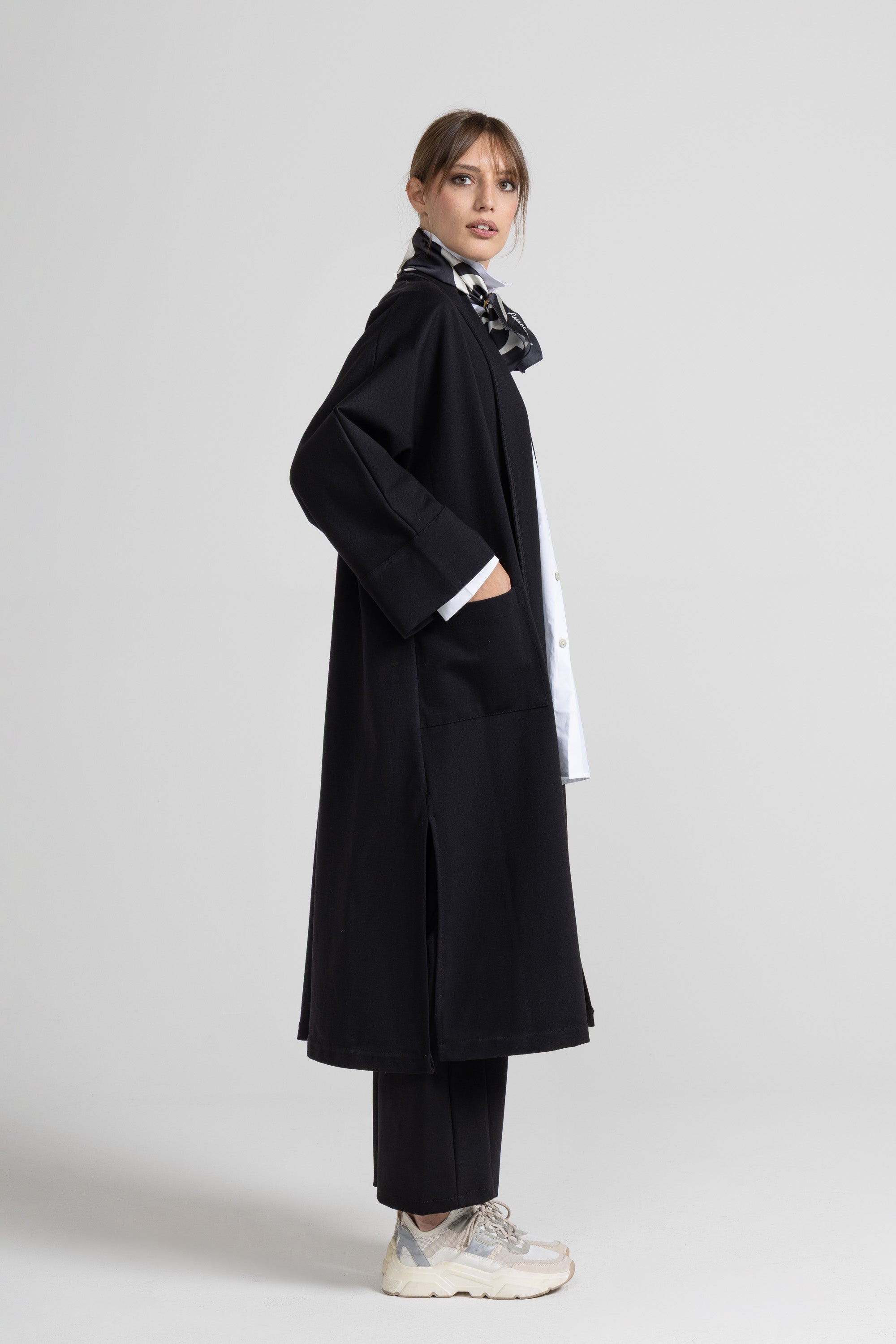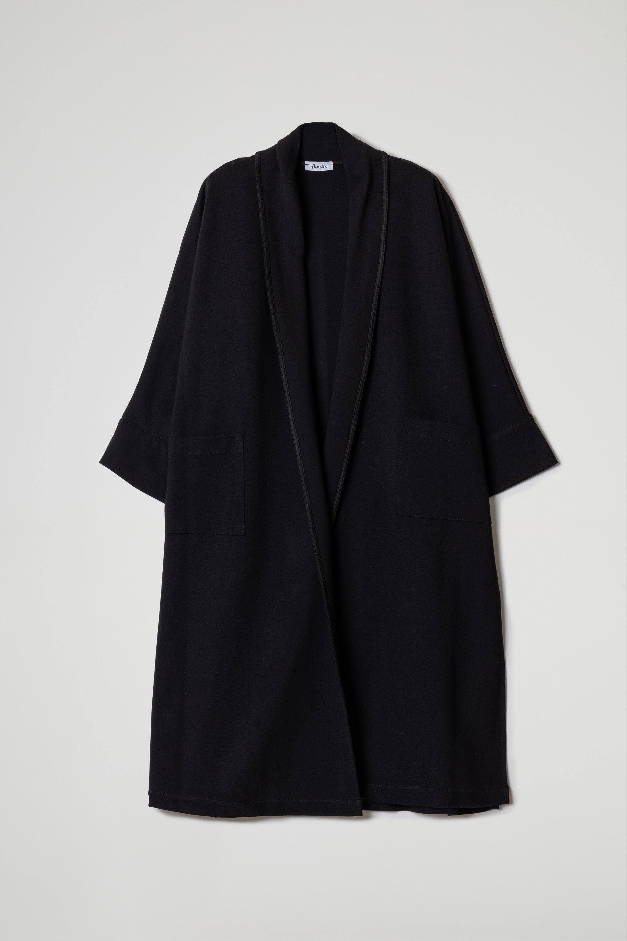 Long duster coat with an open front, a wide, dropped lapel collar with a trim detail for an elegant yet casual look, long, wide sleeves with high-folded hems, large patch pockets, and slits at the hem. Loose, comfortable fit.