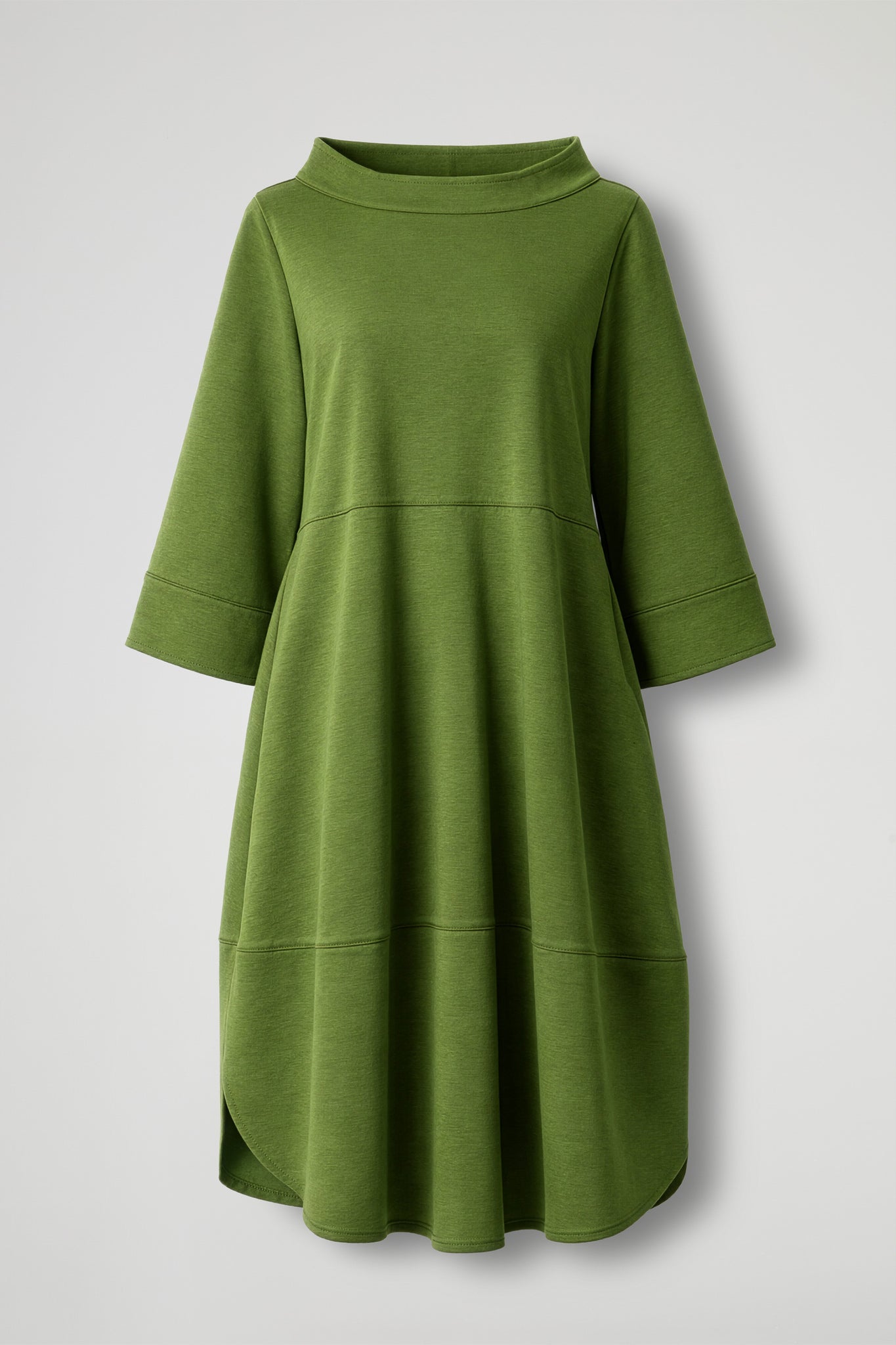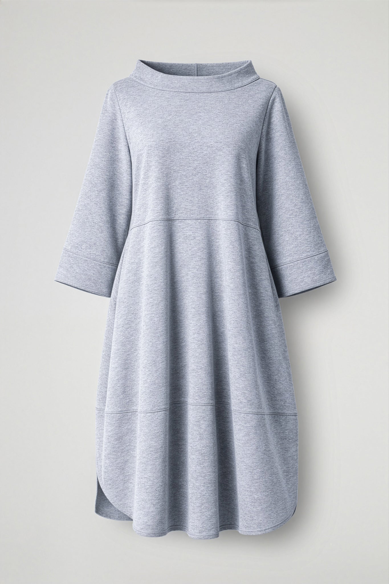 Long dress, wide, round stand-up collar with high-felt hem, ¾-length sleeves with high-felt hem, welt pockets, decorative horizontal seams, and a petal hem at the bottom. Loose fit.