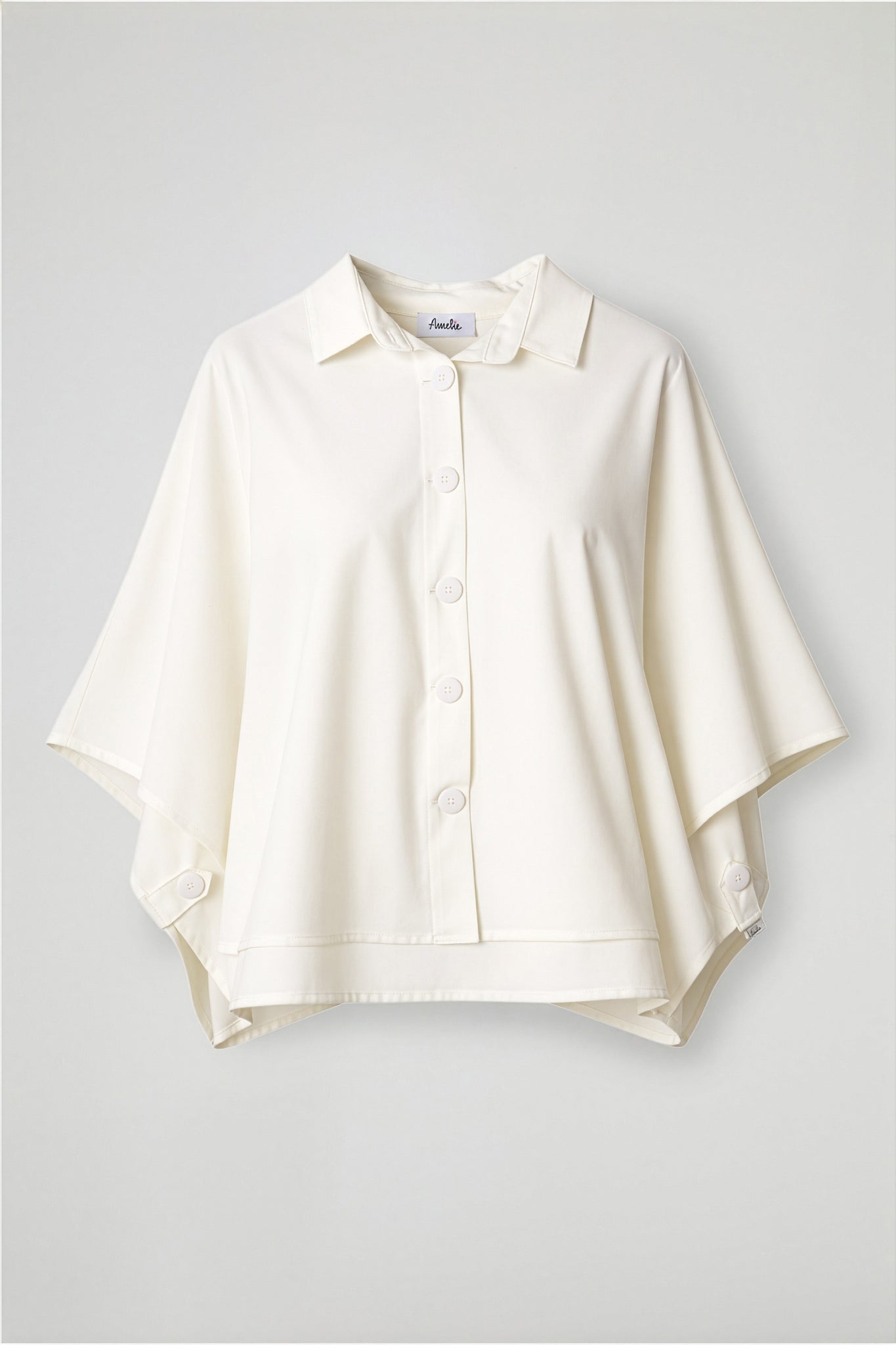 Cape shirt with a wide and asymmetrical line, classic French collar, wide sleeves ¾, front fastening with tone-on-tone buttons, side slits at the bottom with button fastening flap. Wide fit