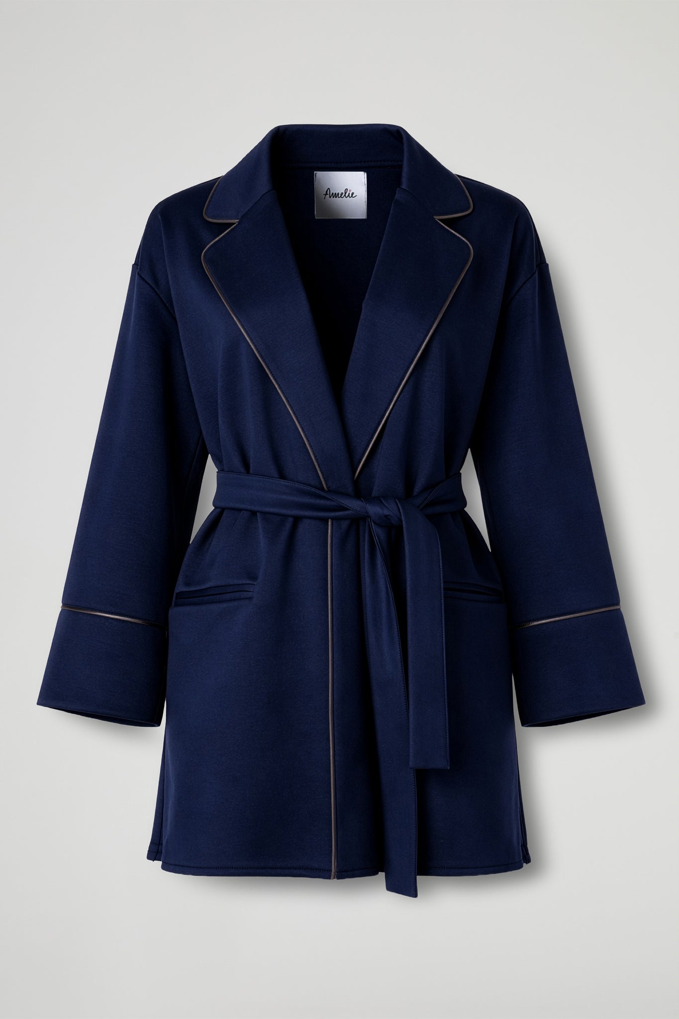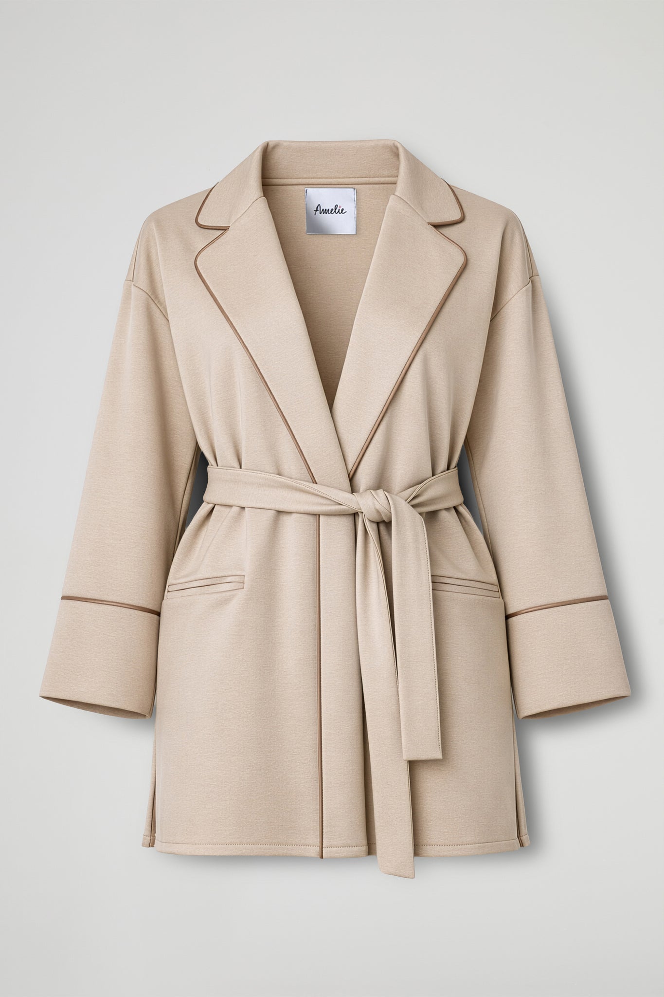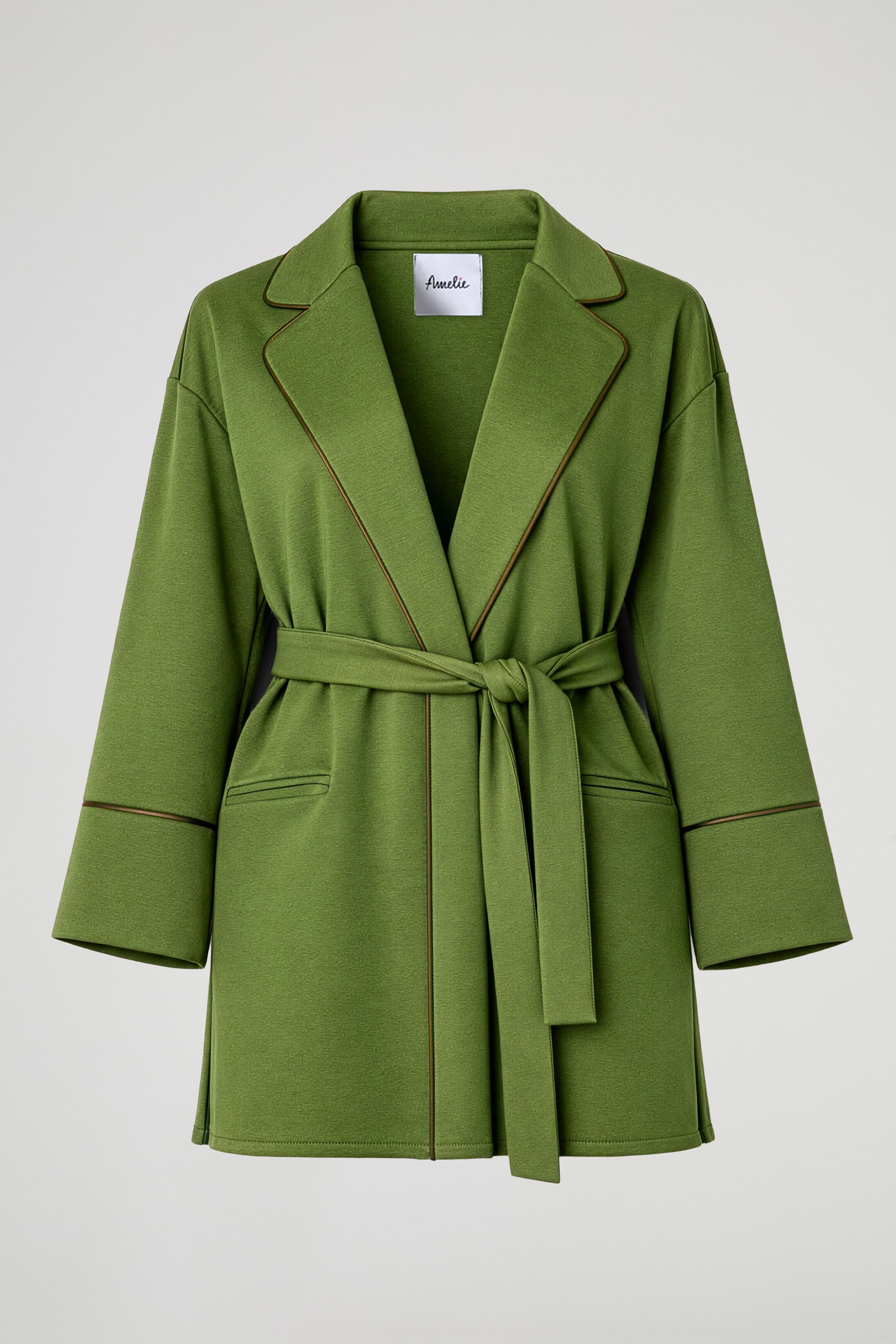 A contemporary jacket, perfect for instantly adding character to even the simplest looks. The fit is soft and slightly oversized , with wide lapels and a refined finish thanks to the contrasting trims that define the edges and sleeves. Wear open or cinched at the waist with the matching sash to accentuate the silhouette.