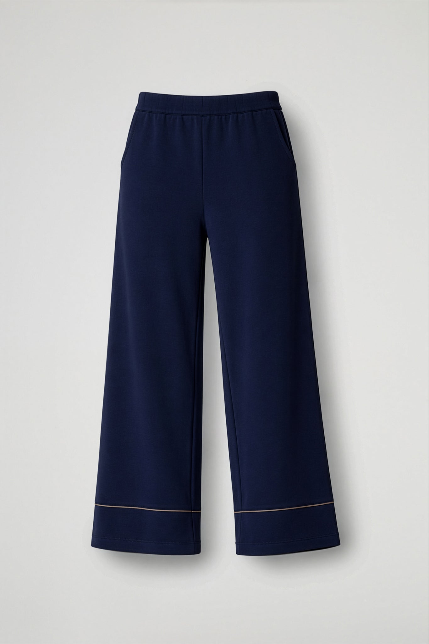 Viscose trousers with an elastic waistband, slightly rounded slant pockets, a wide, straight leg, and a contrasting horizontal trim at the bottom. Relaxed fit.
