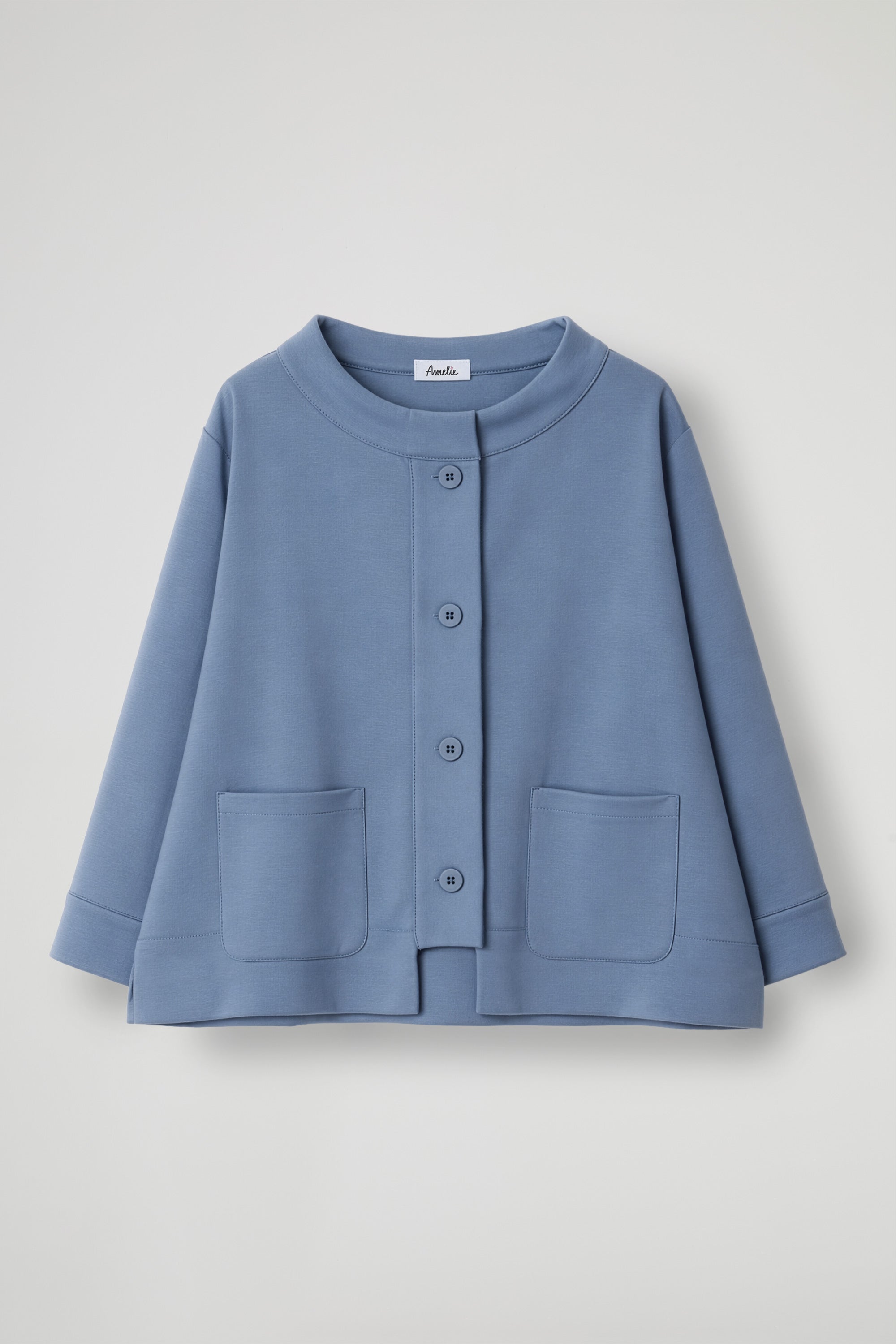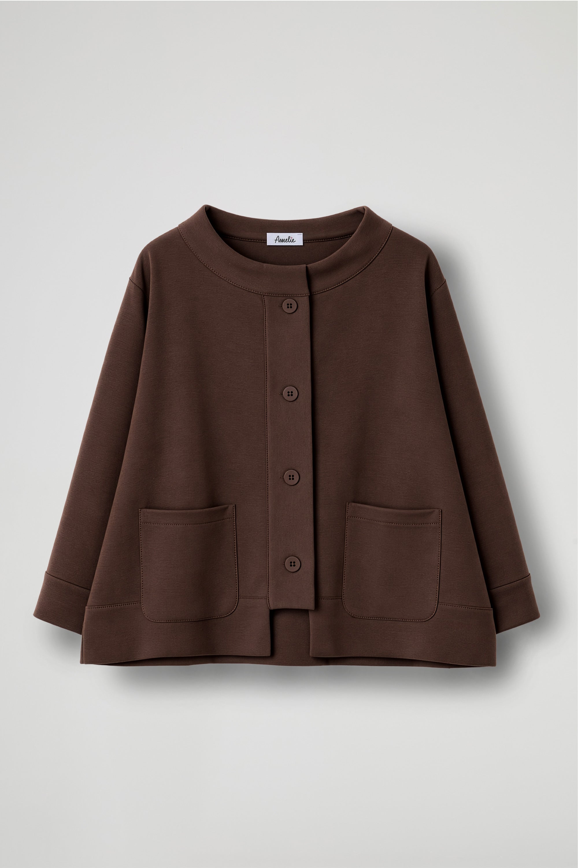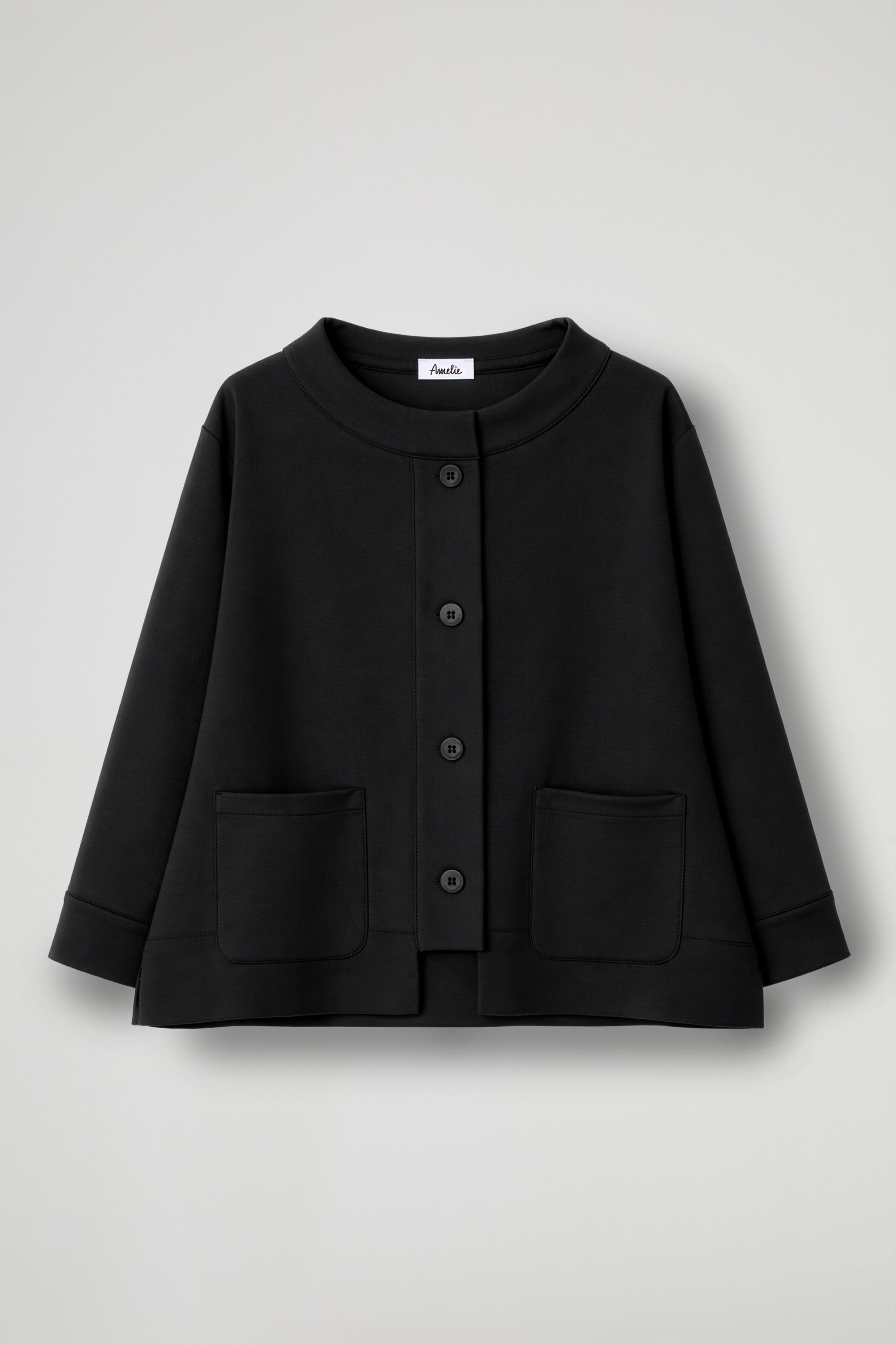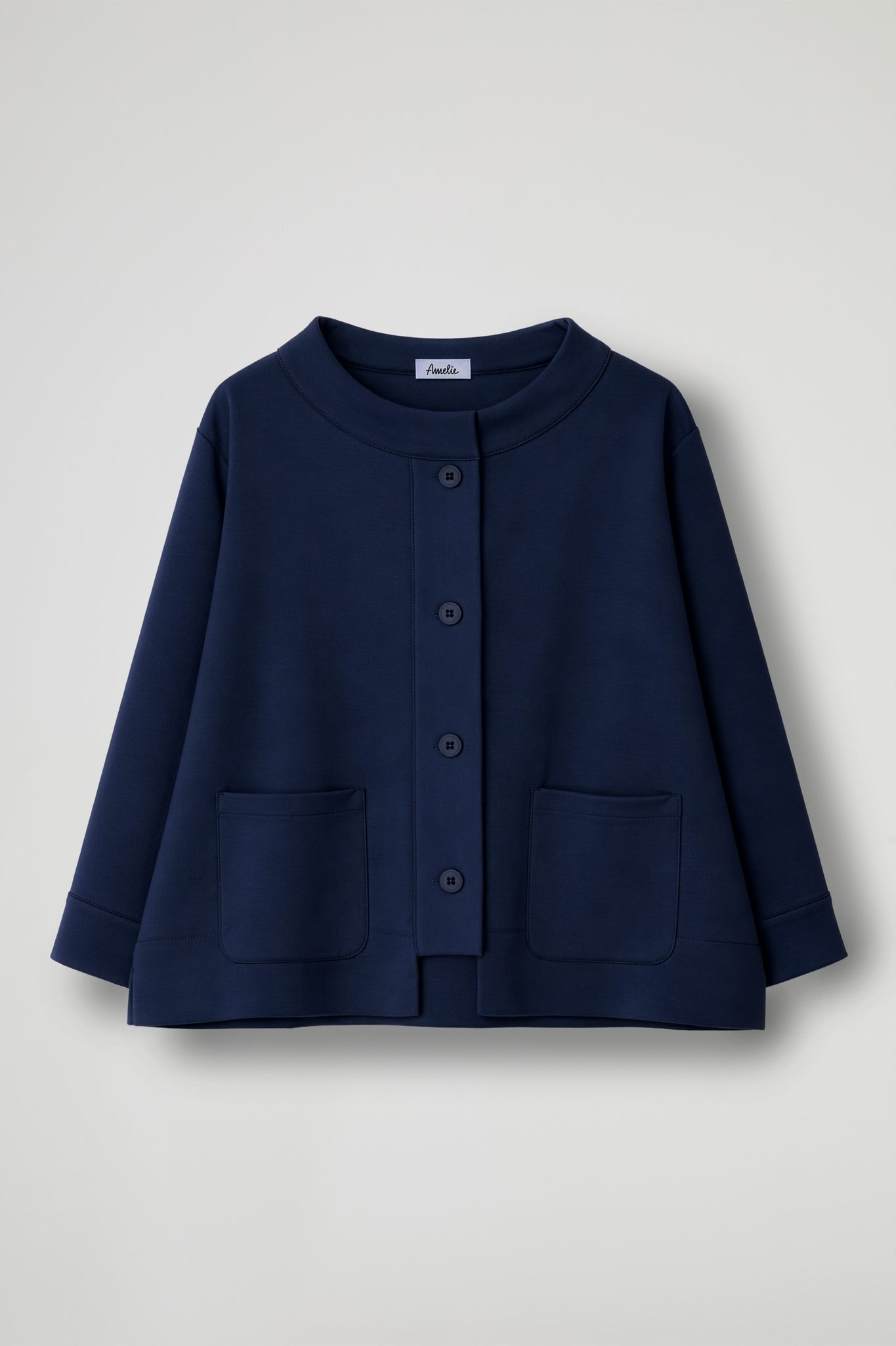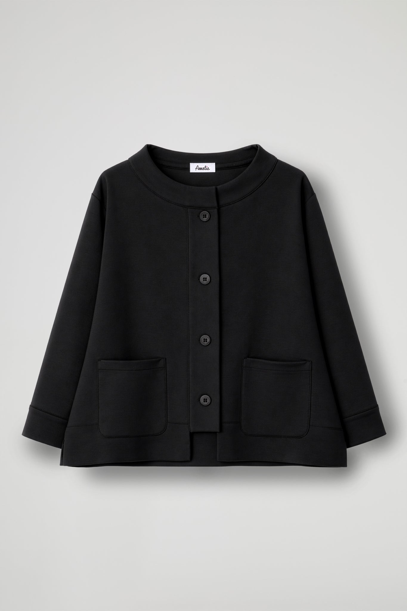 A short jacket with a refined and contemporary character, perfect for completing any outfit with style. Made from a structured yet comfortable fabric, it features a slightly flared line that adds movement and enhances the silhouette. The wide, clean-cut neckline adds a sophisticated touch, while the front closure with visible buttons creates an elegant graphic interplay. The large patch pockets on the front combine aesthetics and functionality, making the garment practical as well as refined.