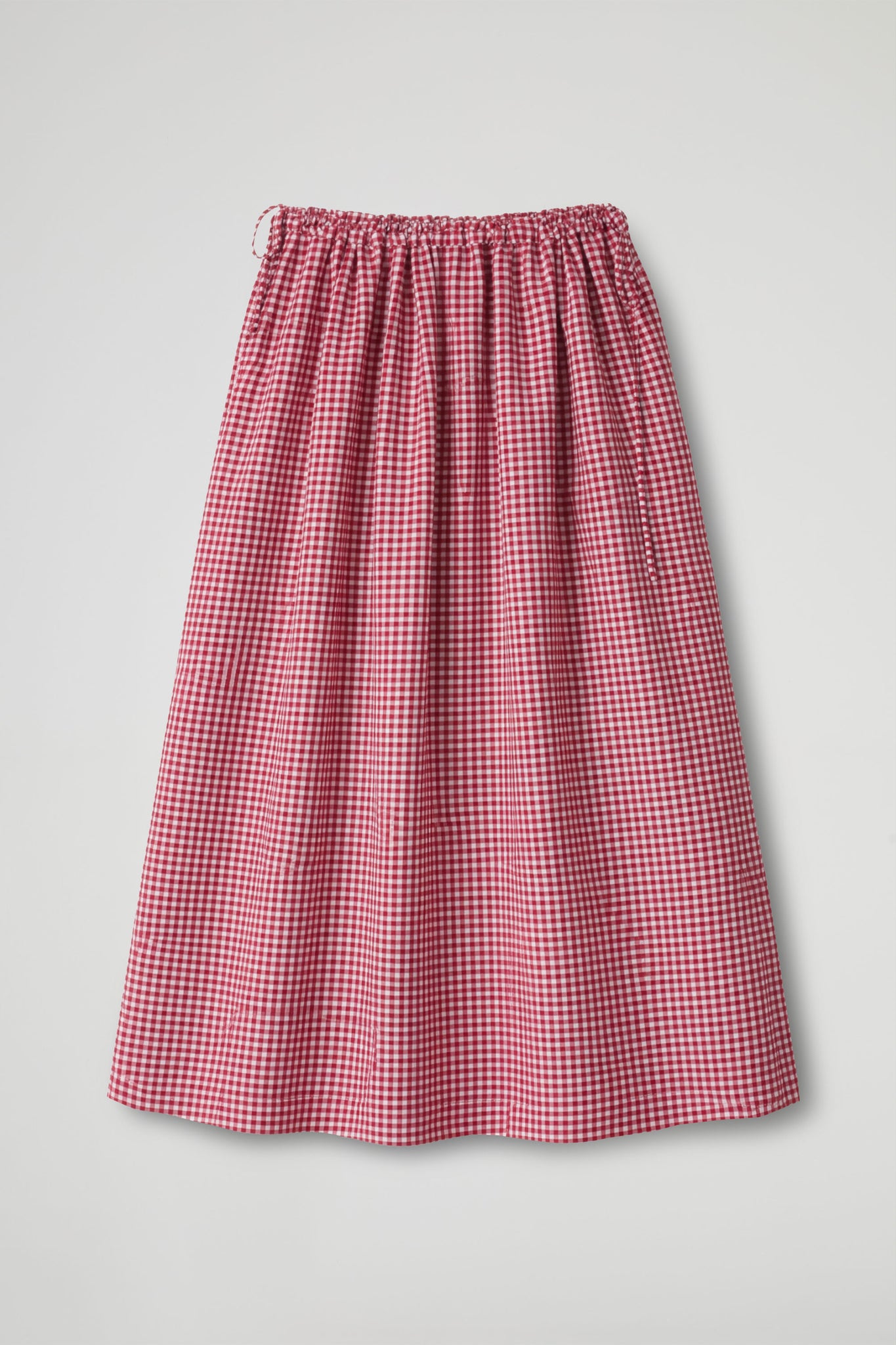 Long wrap skirt, made of checked gingham print, hugs the silhouette, enhancing the figure; the adjustable closure with ties allows for a customized fit, and the line is soft and flared.
