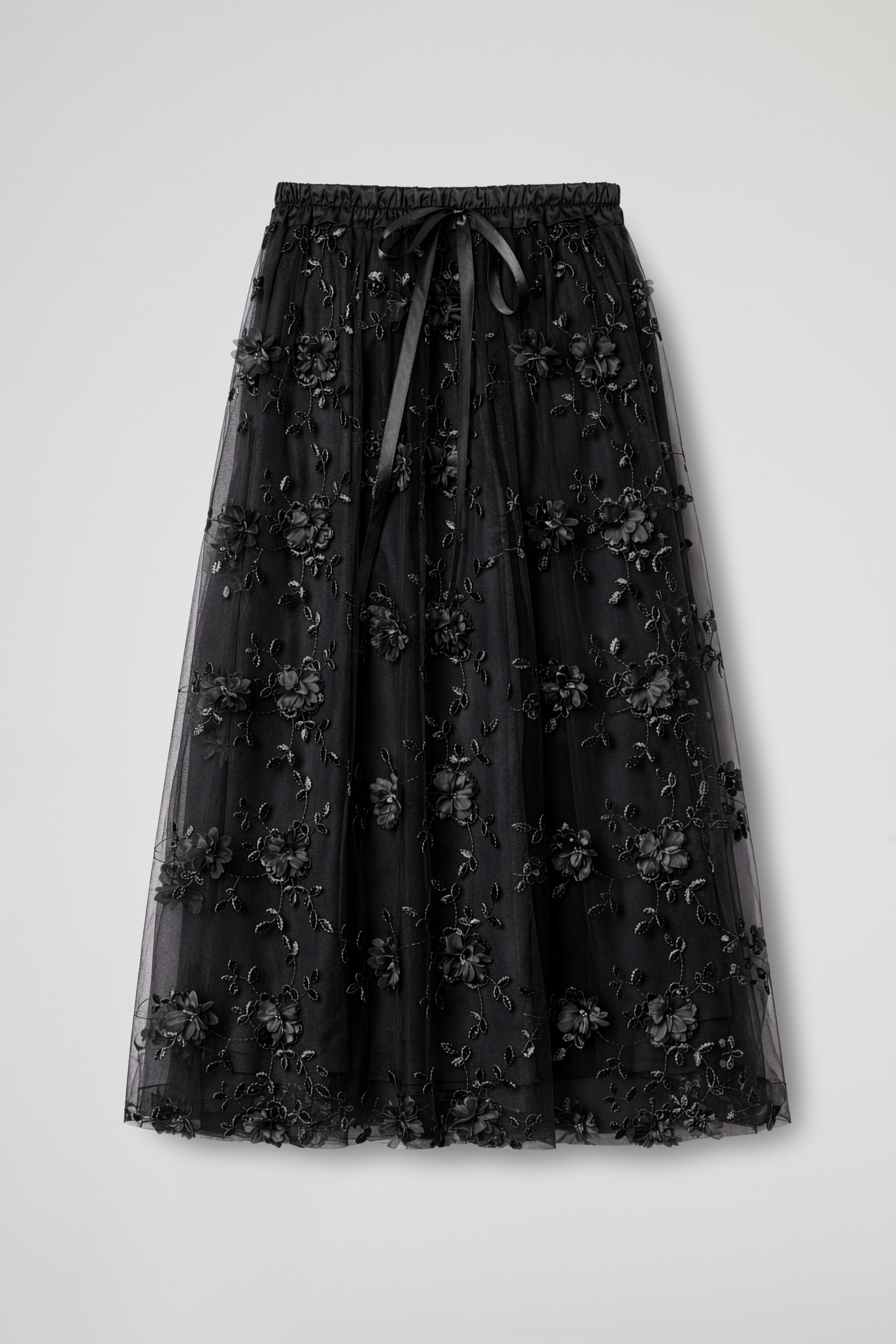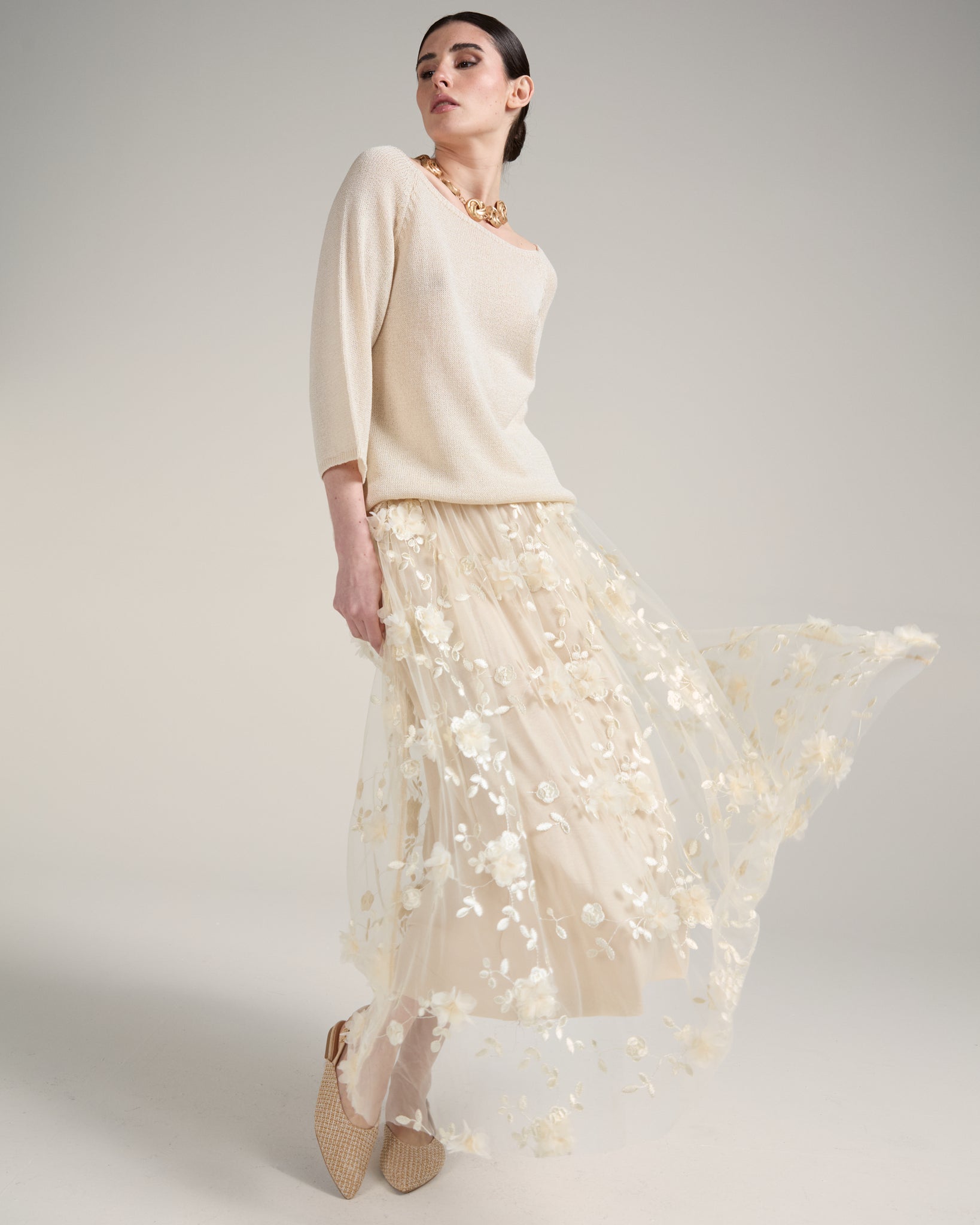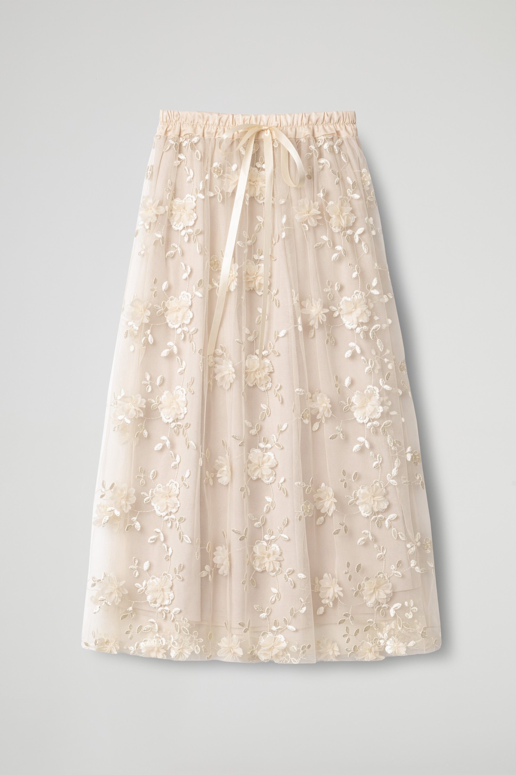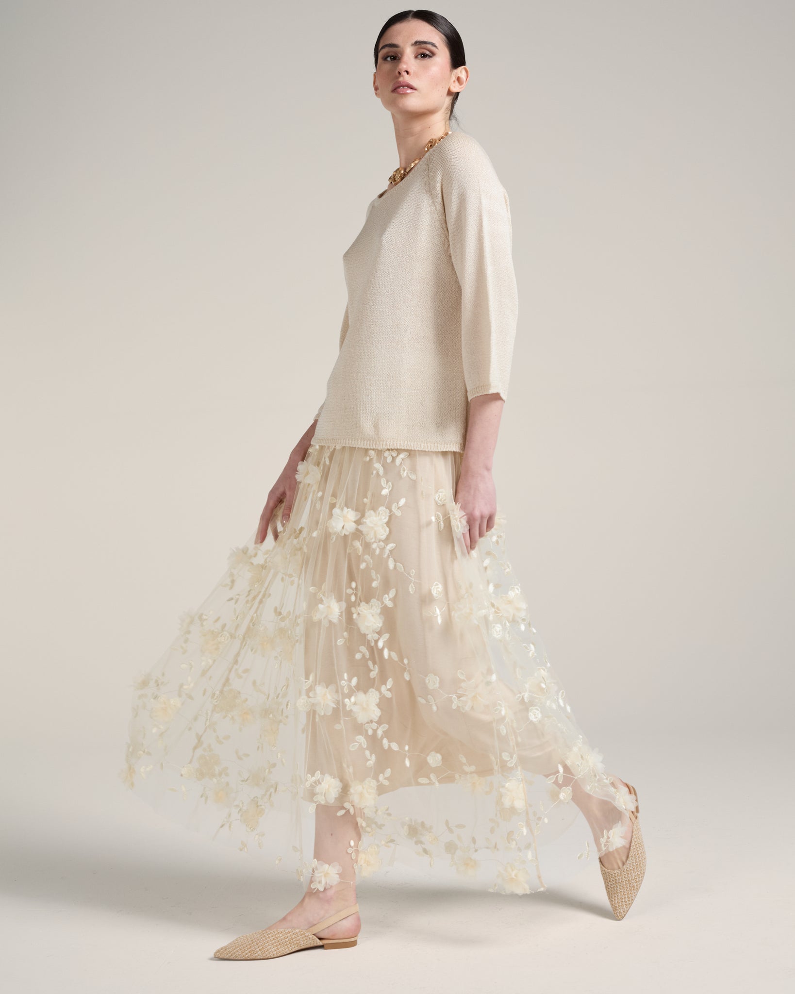 Long skirt with a romantic and elegant design, made of lightweight fabric; The model is wide and fluid, with a tulle base decorated with delicate three-dimensional floral embroidery that adds movement and sophistication. It features an elastic waistband with an adjustable drawstring, finished with a tone-on-tone ribbon. The midi/long length and the transparency of the fabric make it ideal for feminine and sophisticated looks, perfect for special occasions and more refined daytime outfits.