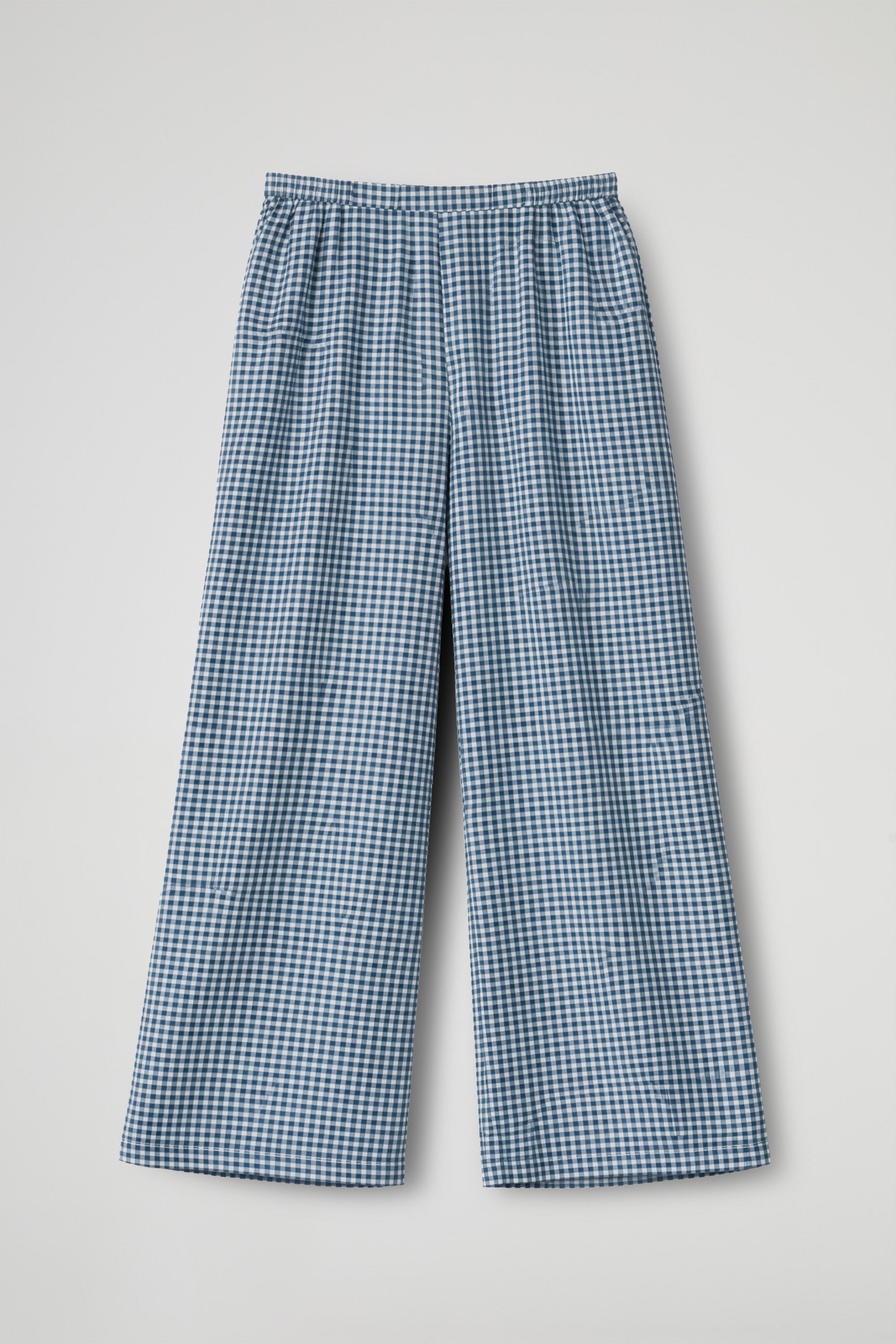 Pantalone dalla linea morbida con una linea morbida e fluida, la gamba ampia scende dritta dalla vita fino al fondo, creando un effetto elegante e slanciato che dona movimento ad ogni passo. La fantasia Vichy, caratterizzata da piccoli quadretti regolari conferisce al pantalone un aspetto vivace, leggermente rétro e molto estivo.