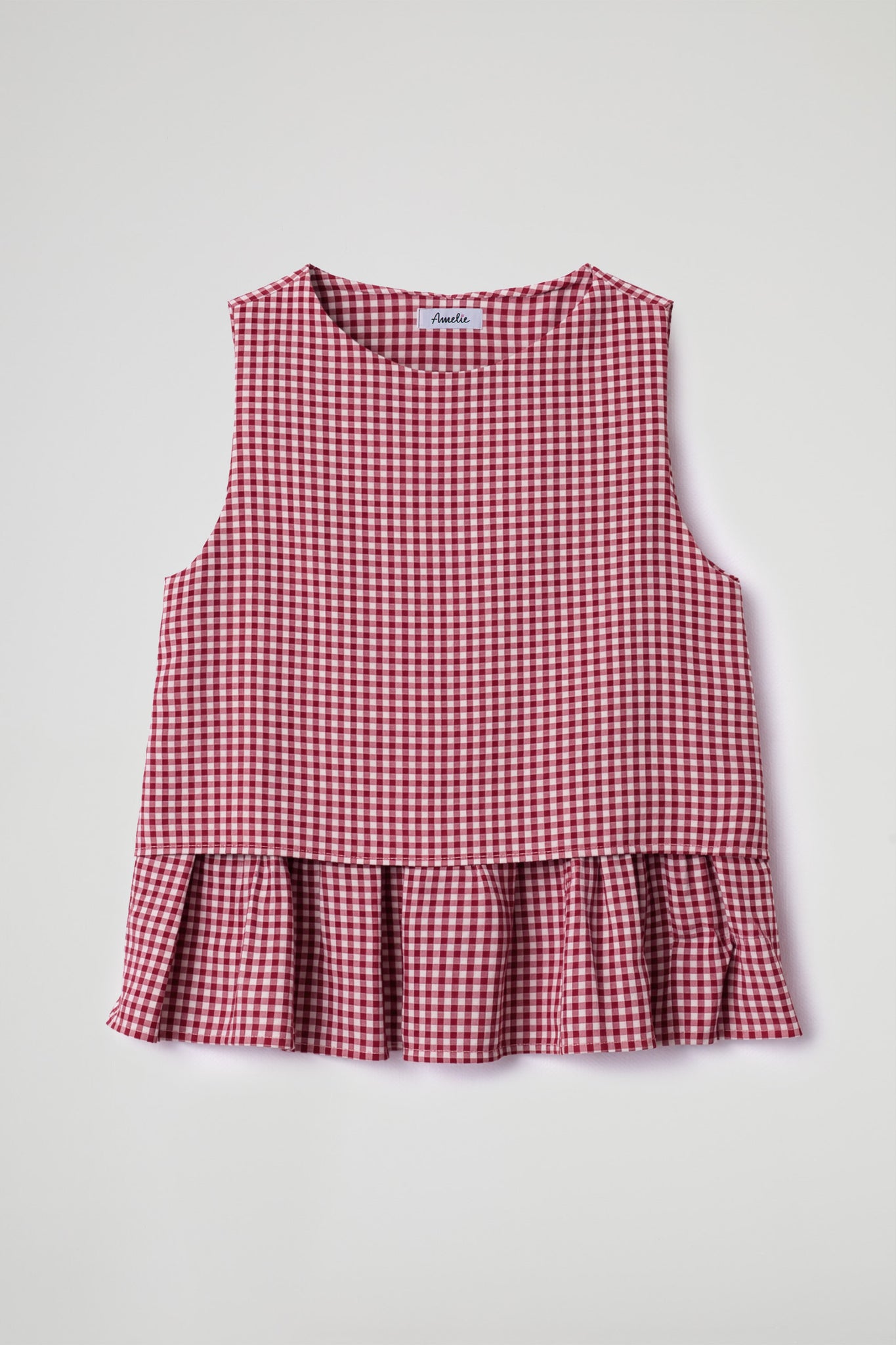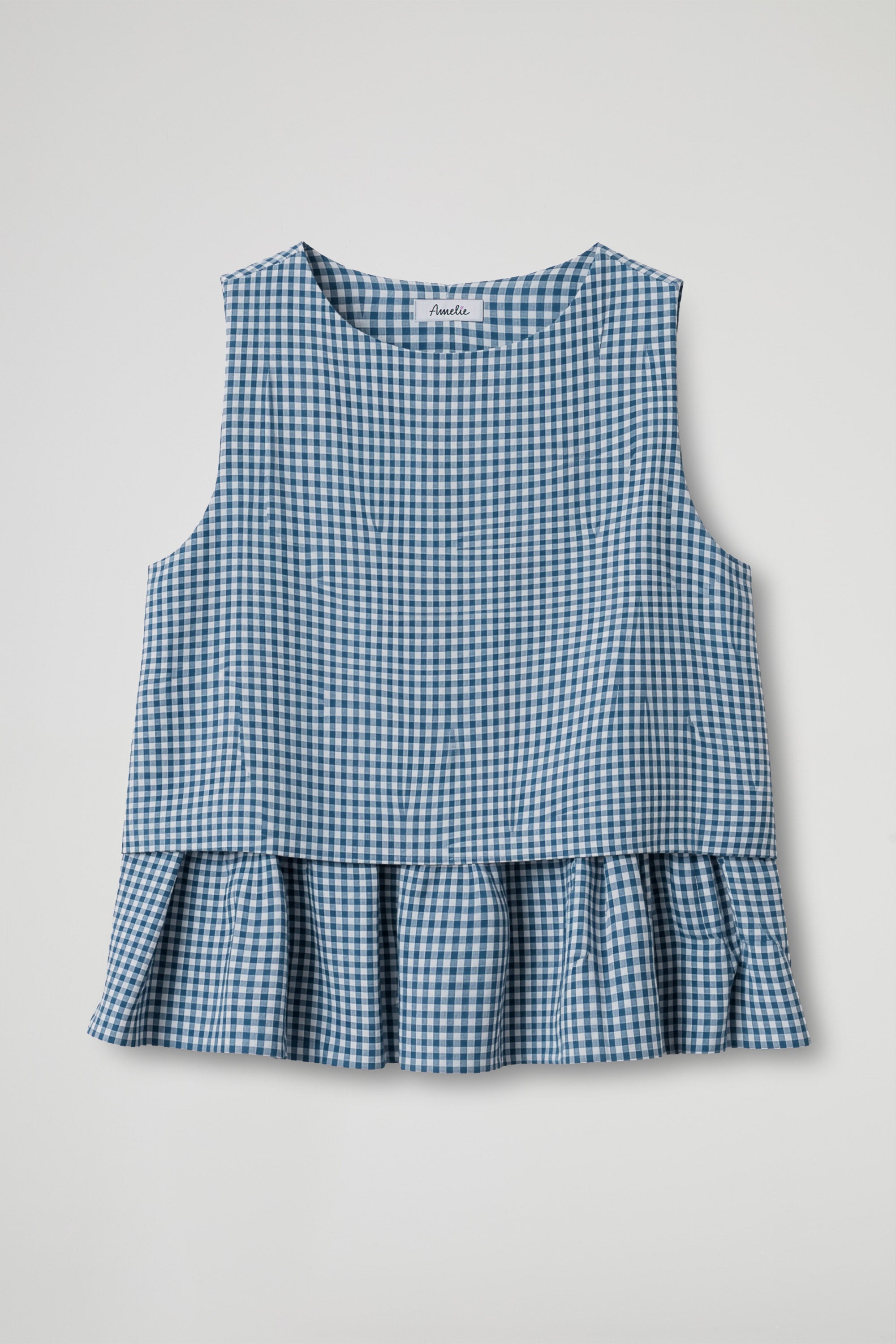 Top smanicato realizzato in leggero cotone a quadretti Vichy; la fascia arricciata sul fondo rende il capo morbido e femminile, donando movimento e un tocco di freschezza al design, si distingue per il suo stile leggero e versatile, perfetto da abbinare sia a pantaloni che a gonne per un look casual ma curato.