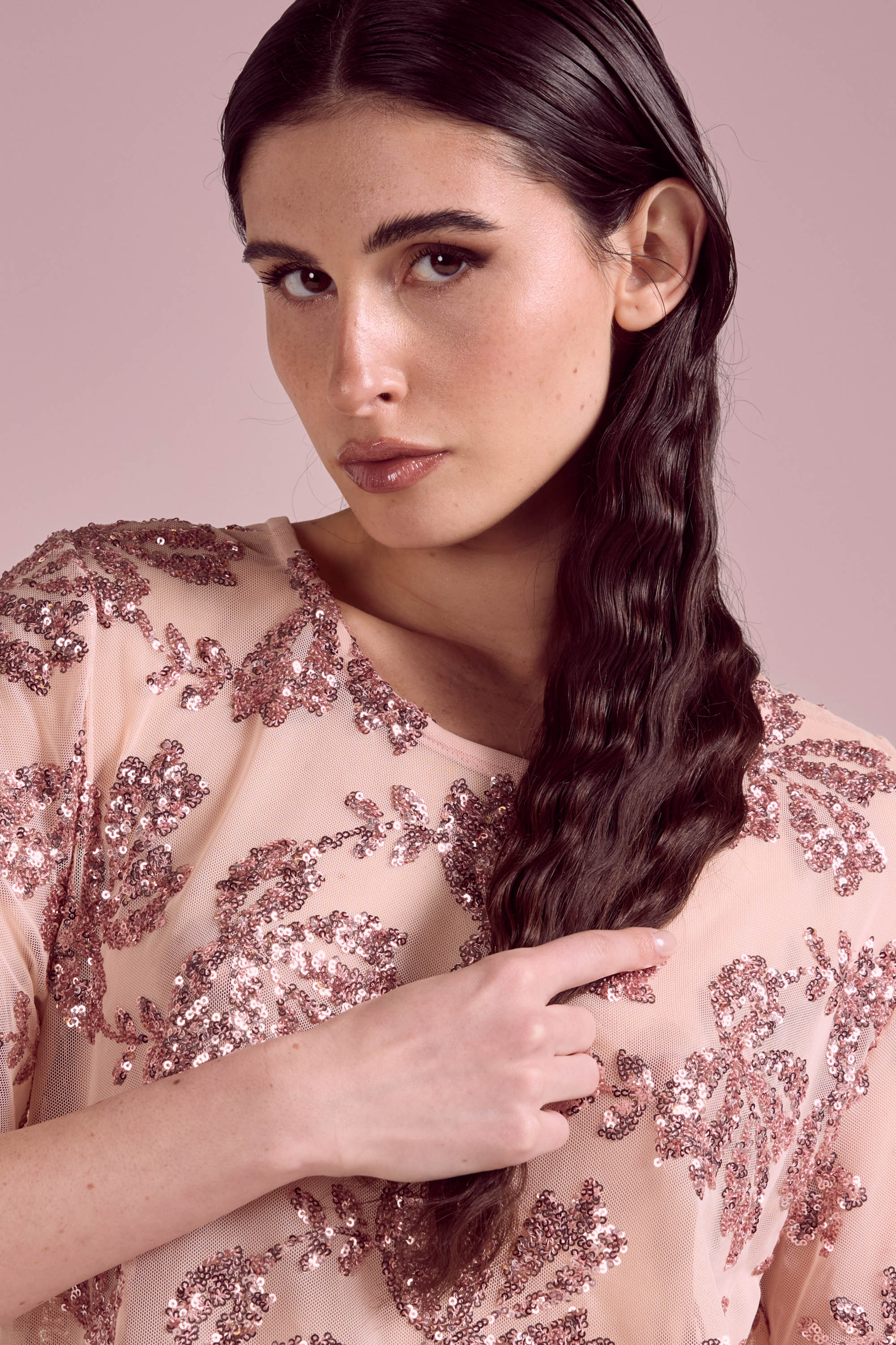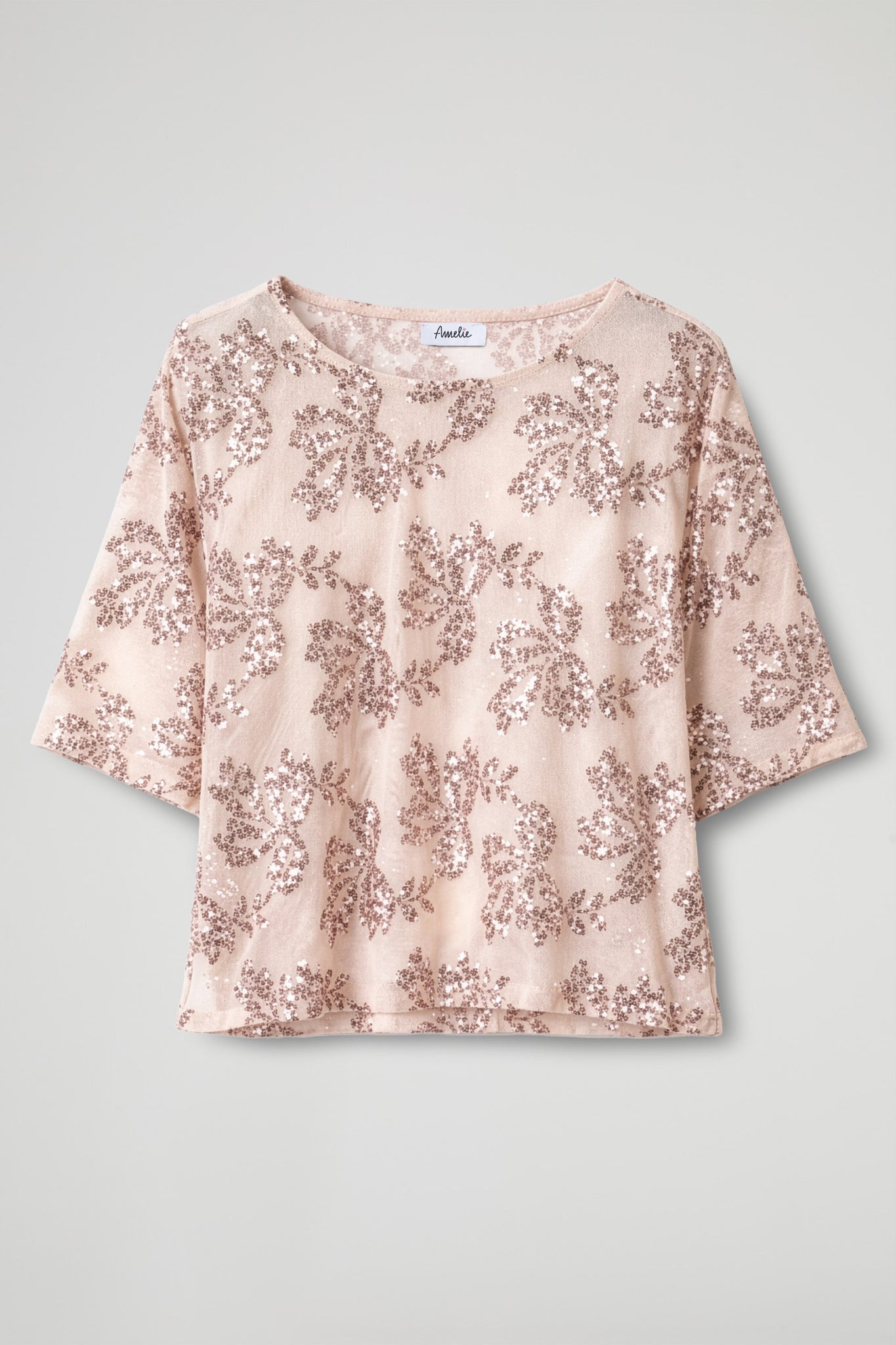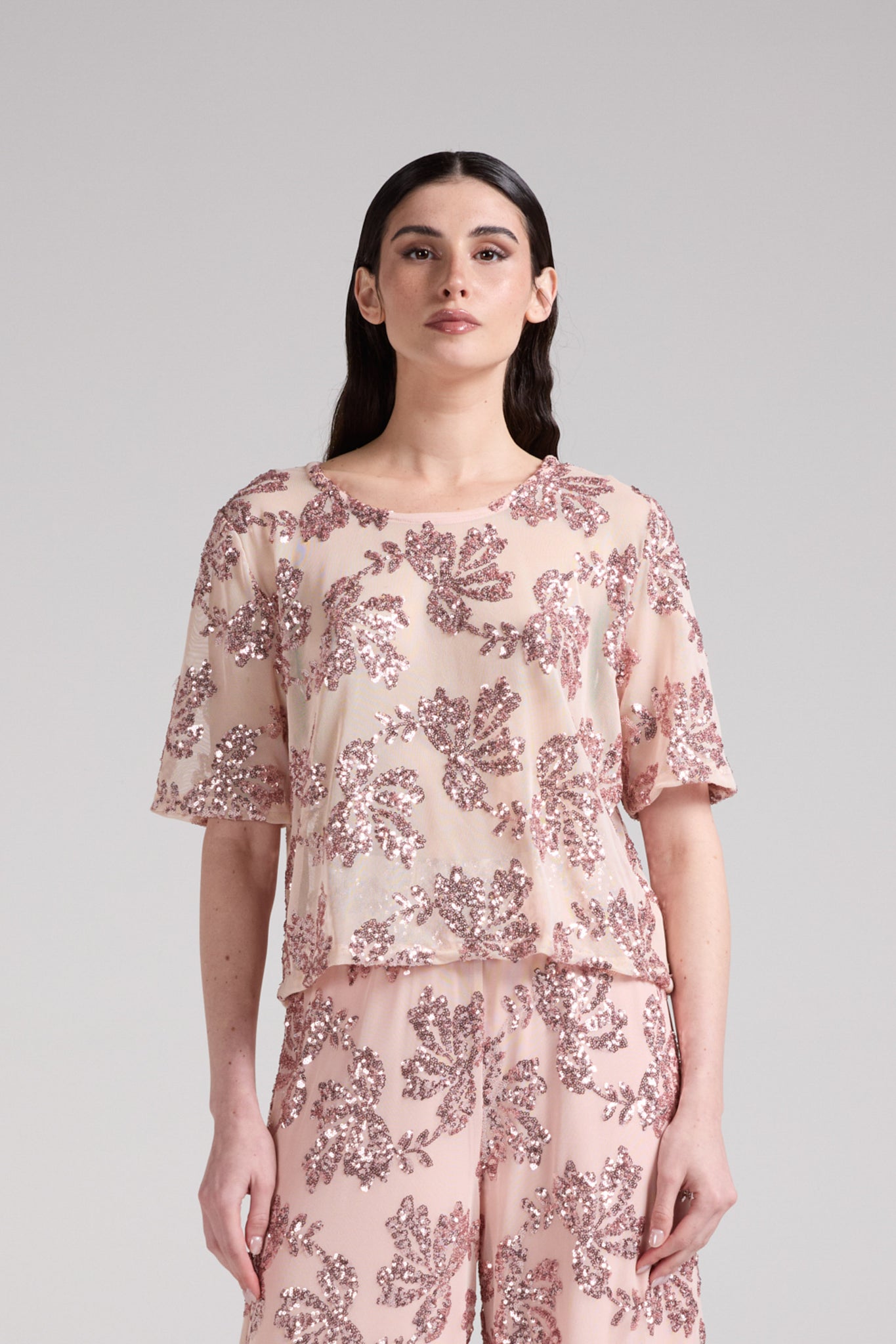 Elegant top with a luminous and refined design, made from lightweight fabric embellished with all-over floral sequin embroidery. The model features a soft and slightly boxy silhouette, with short sleeves and a crew neck, for a comfortable and contemporary fit. The intricate workmanship adds sparkle and makes the garment ideal for special occasions or for creating sophisticated outfits.