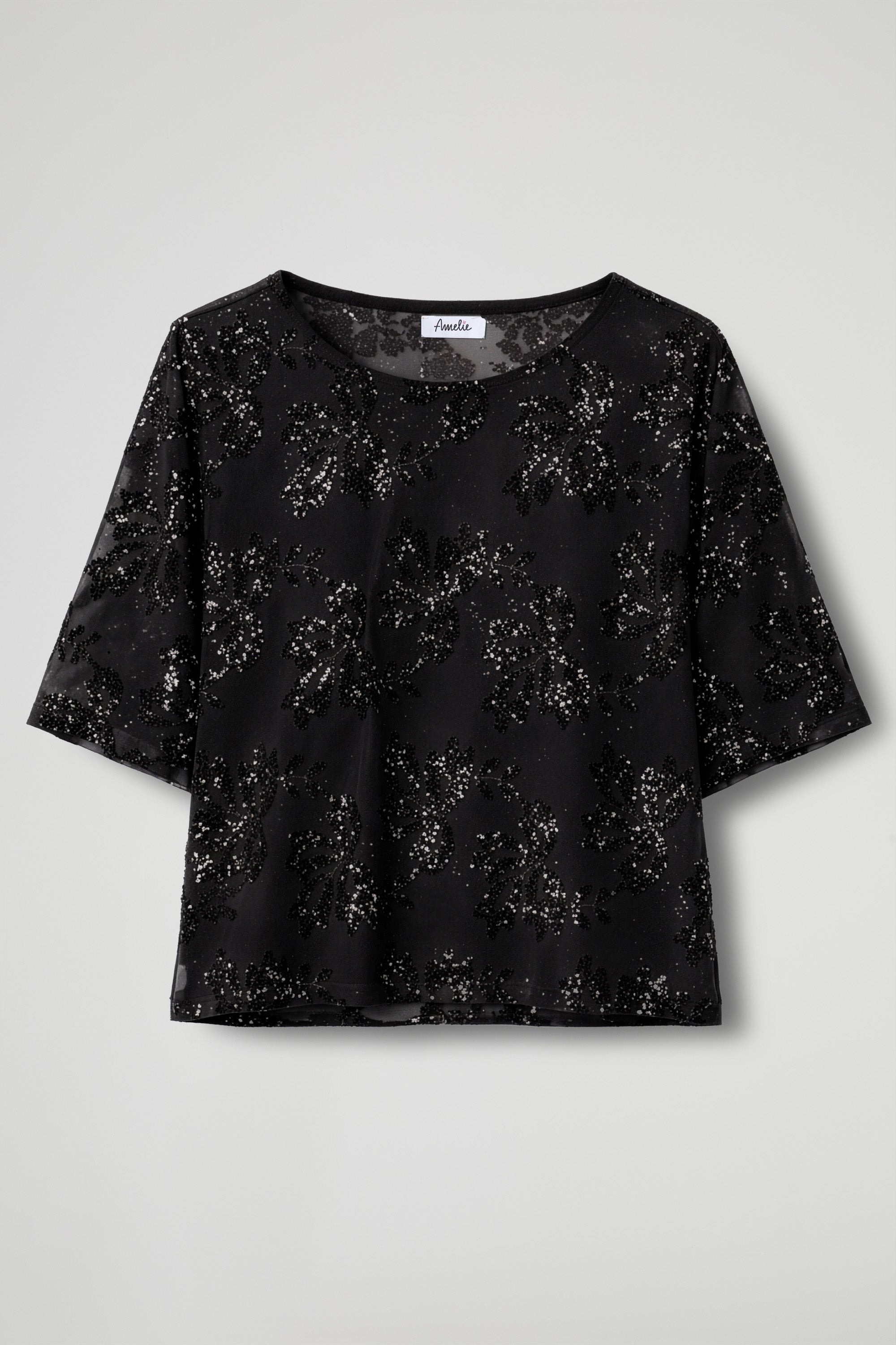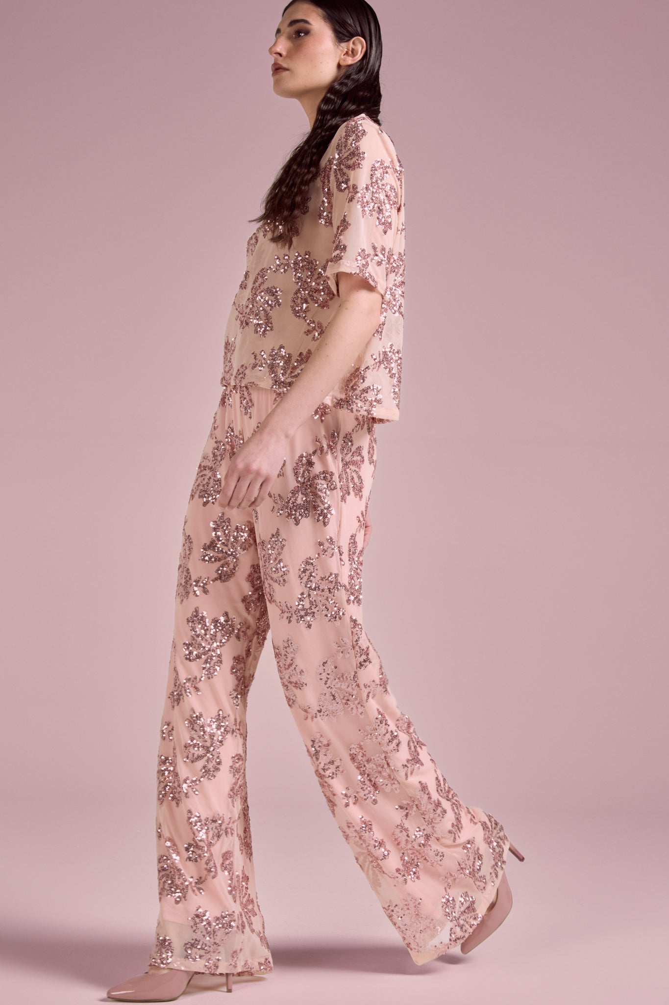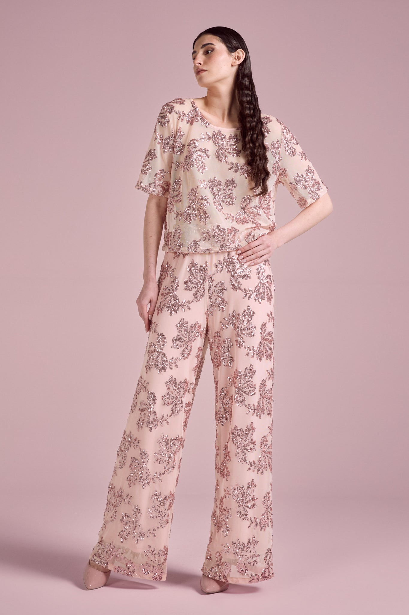 Elegant top with a luminous and refined design, made from lightweight fabric embellished with all-over floral sequin embroidery. The model features a soft and slightly boxy silhouette, with short sleeves and a crew neck, for a comfortable and contemporary fit. The intricate workmanship adds sparkle and makes the garment ideal for special occasions or for creating sophisticated outfits.