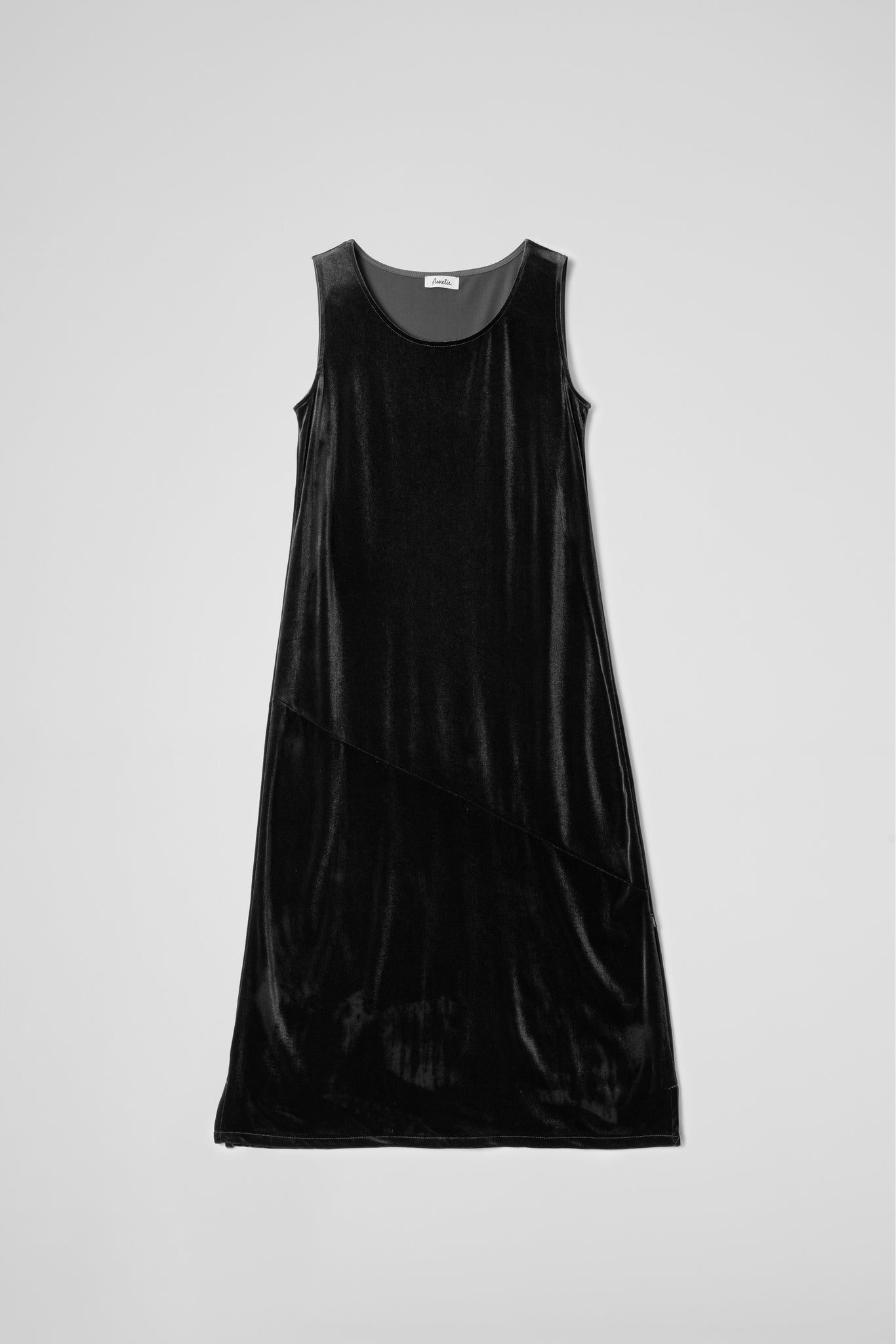 Long sleeveless dress in soft velvet, classic crew neck, slightly wide, decorative oblique cut that crosses the garment, straight fit, with a slight flare towards the hem, slits at the bottom.