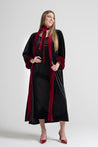 This soft, shimmering velvet dress captures the light with every step, creating a play of reflections that enhances the depth of the color. Its clean, flowing lines caress the silhouette with natural elegance, while the diagonal cut at the front adds movement and modernity, a piece that combines simplicity and sophisticated charm.