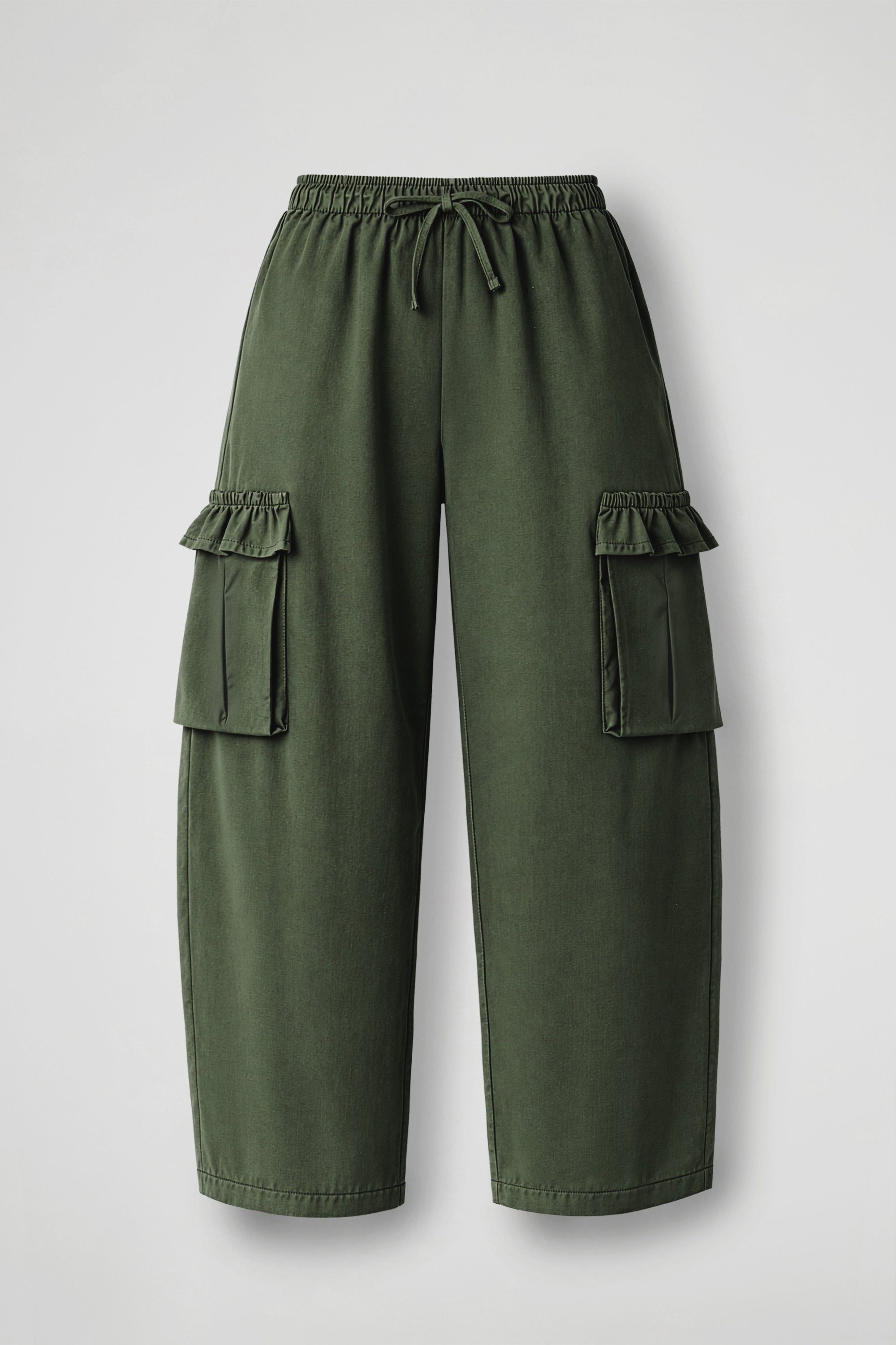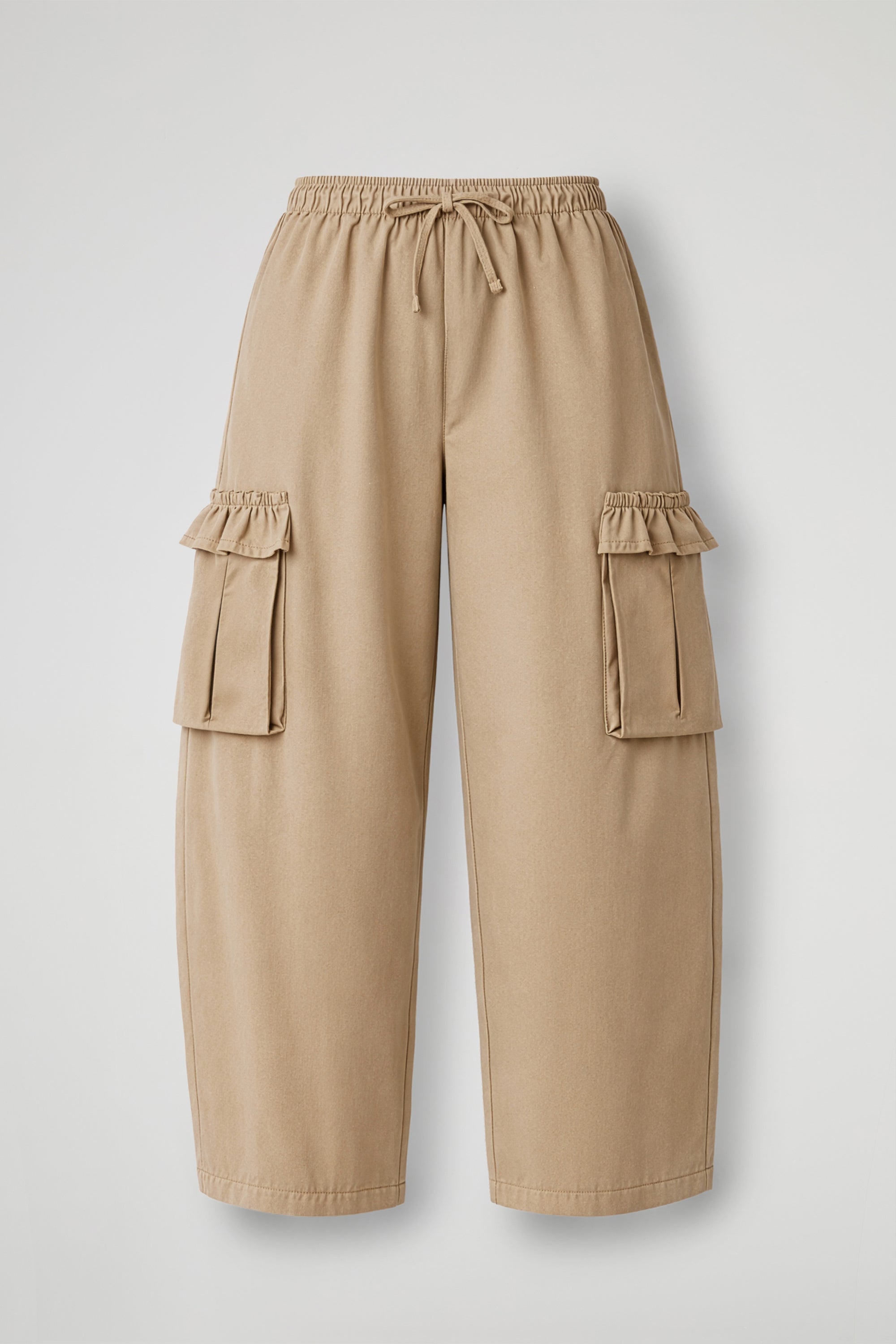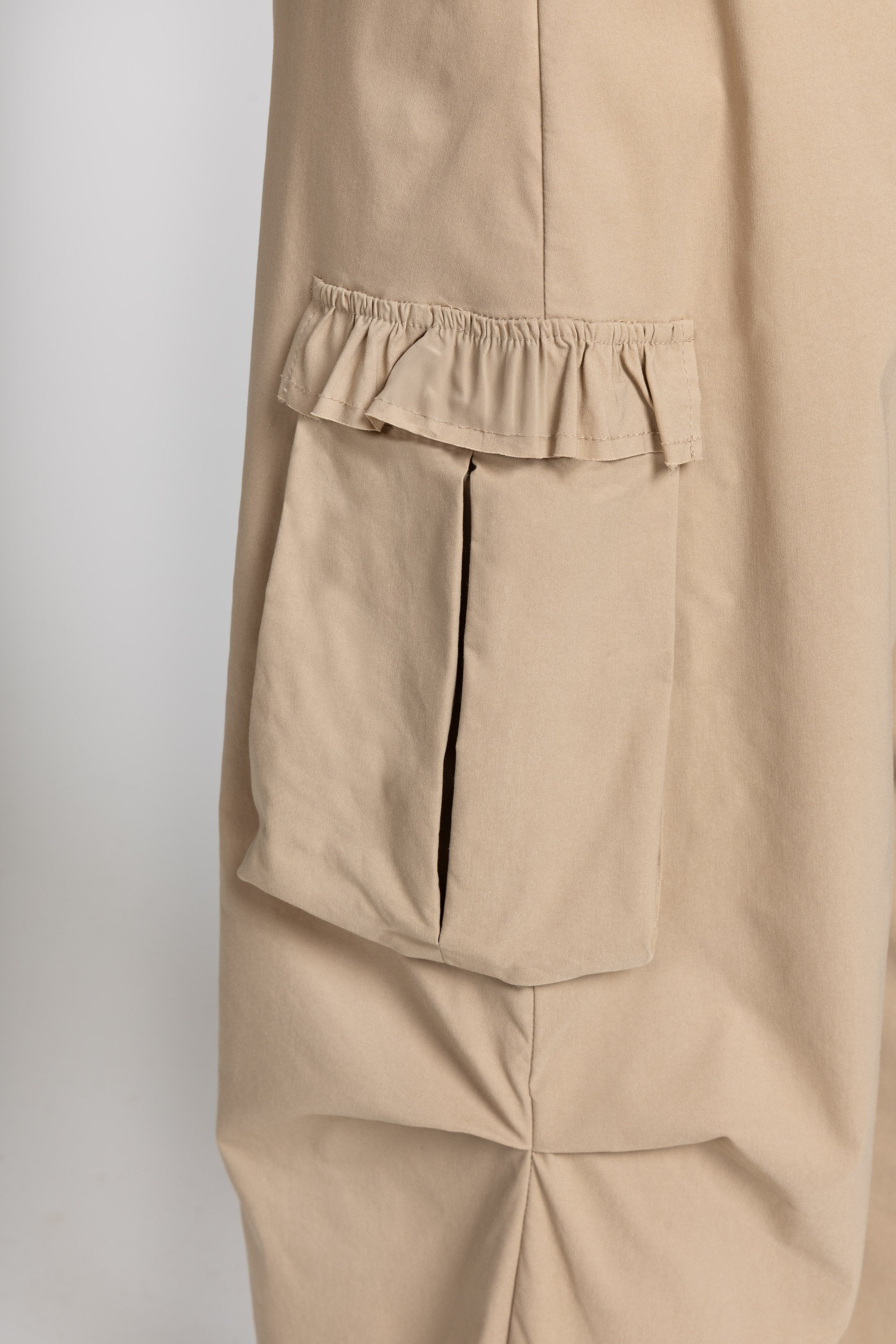 Pantalone lungo d’ispirazione utility, con linea ampia e caduta morbida. La vita è elasticizzata e regolabile grazie al laccetto tono su tono, per una vestibilità comoda e personalizzabile. Sui lati sono presenti due maxi tasche cargo applicate, rifinite da un dettaglio rouche/volant che aggiunge un tocco femminile al design. Gamba dritta e larga, con fondo rifinito a impuntura.