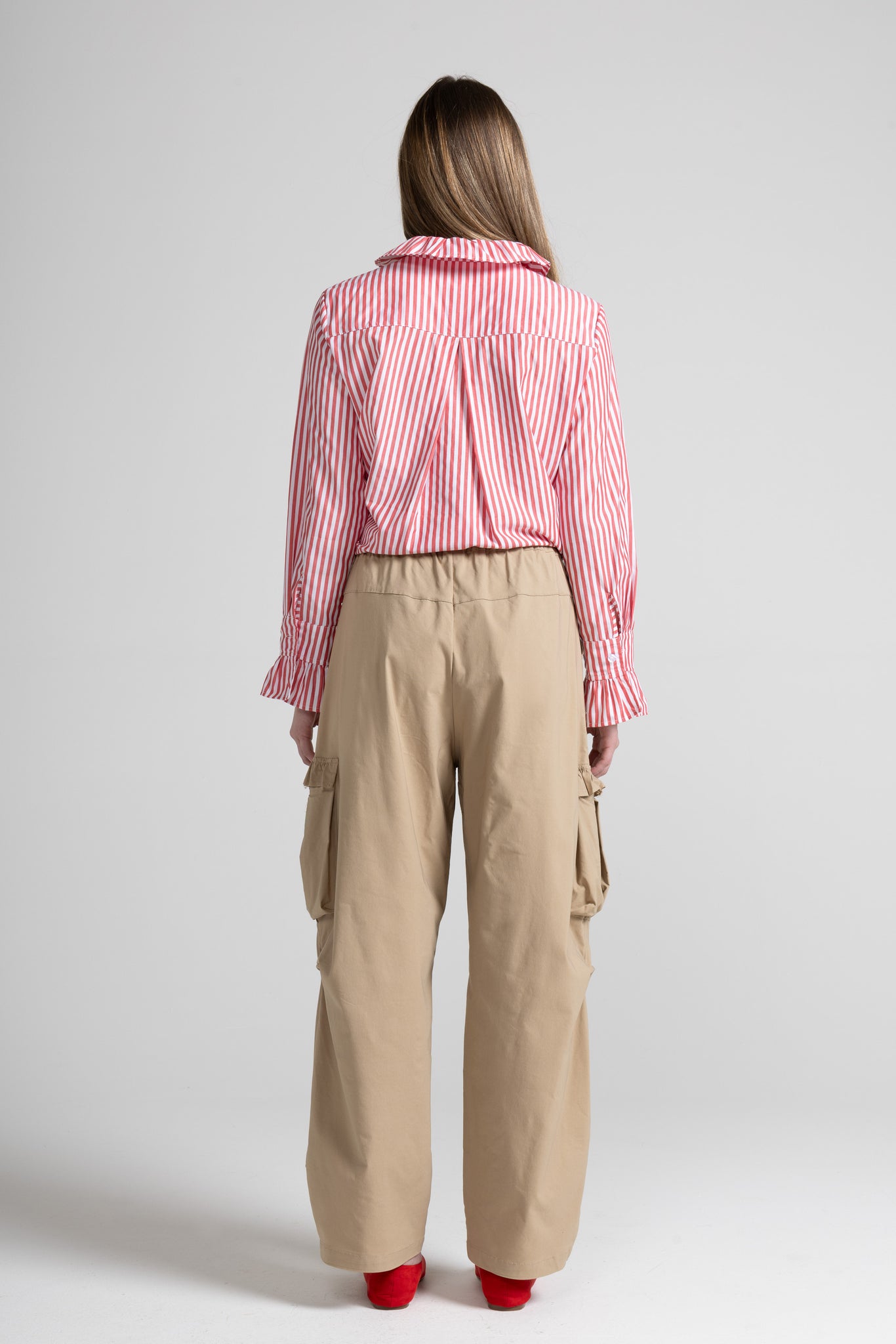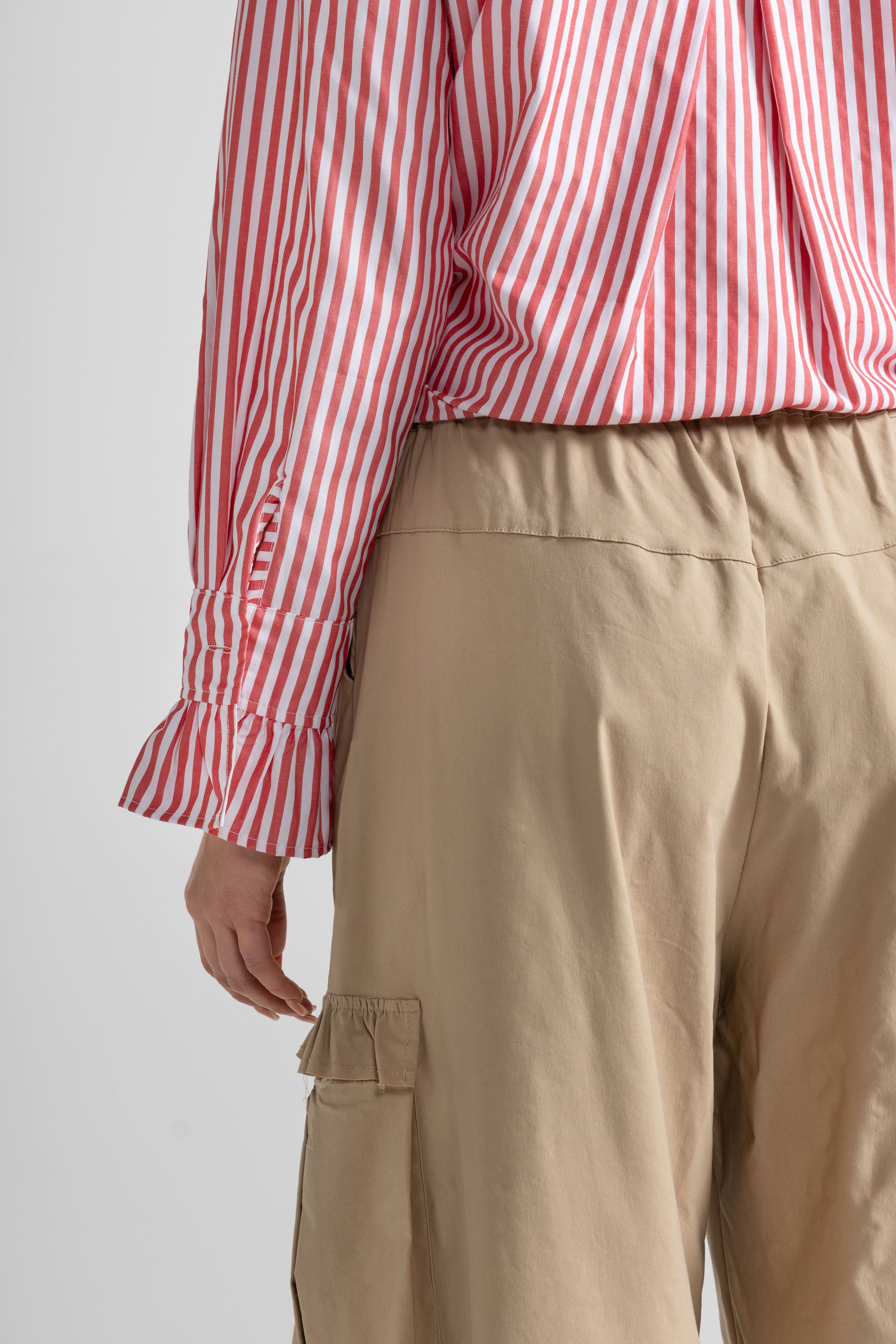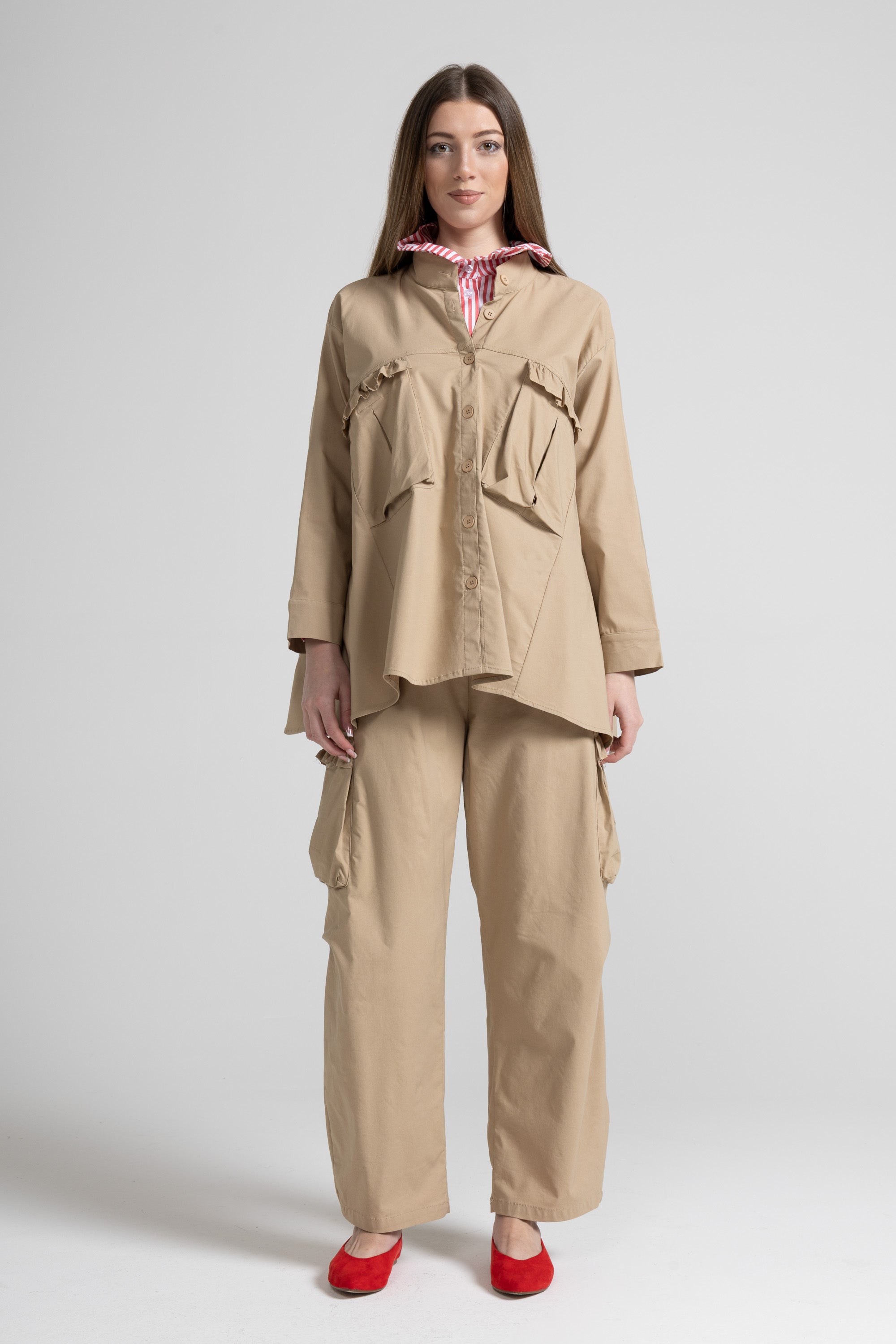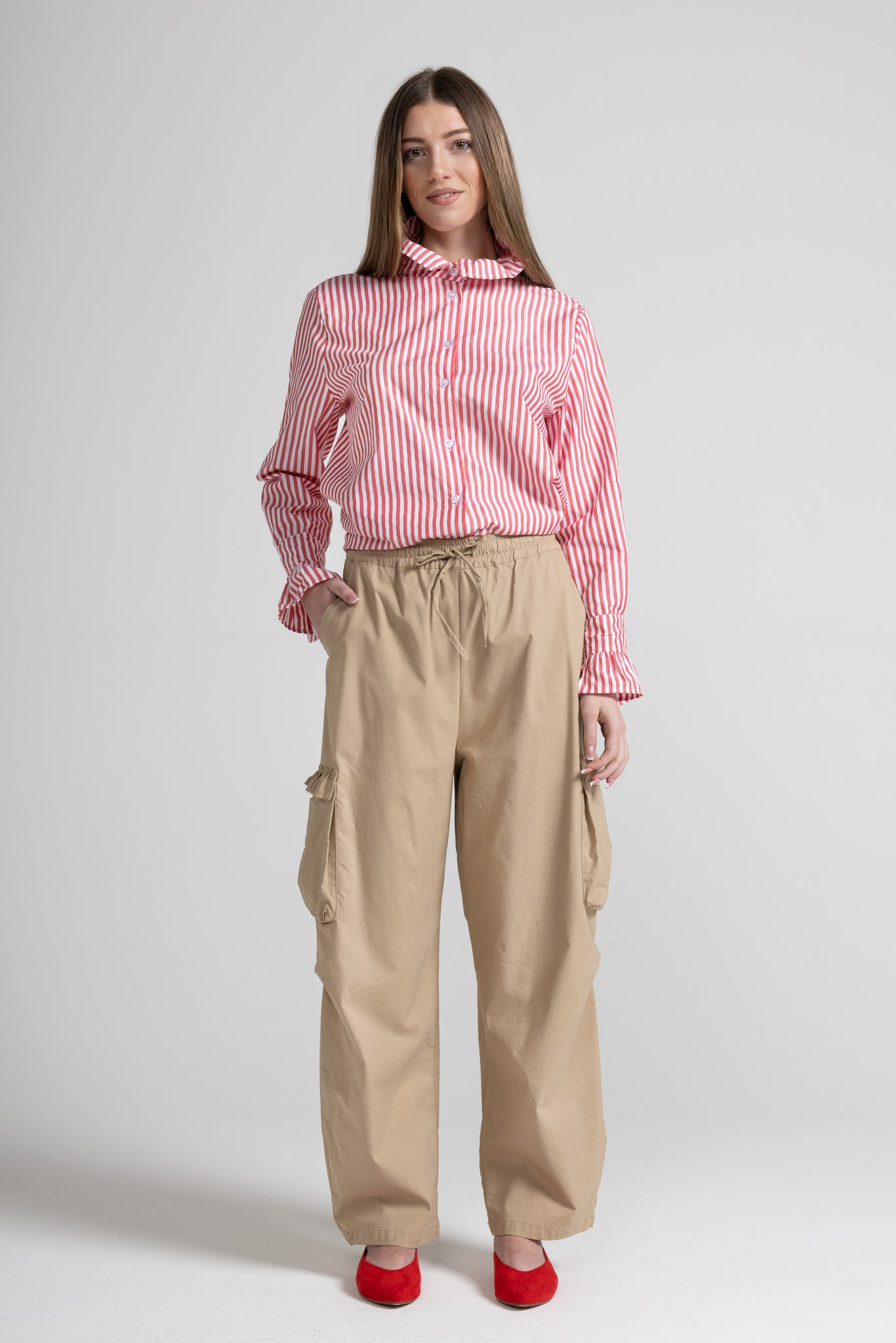 Pantalone lungo d’ispirazione utility, con linea ampia e caduta morbida. La vita è elasticizzata e regolabile grazie al laccetto tono su tono, per una vestibilità comoda e personalizzabile. Sui lati sono presenti due maxi tasche cargo applicate, rifinite da un dettaglio rouche/volant che aggiunge un tocco femminile al design. Gamba dritta e larga, con fondo rifinito a impuntura.