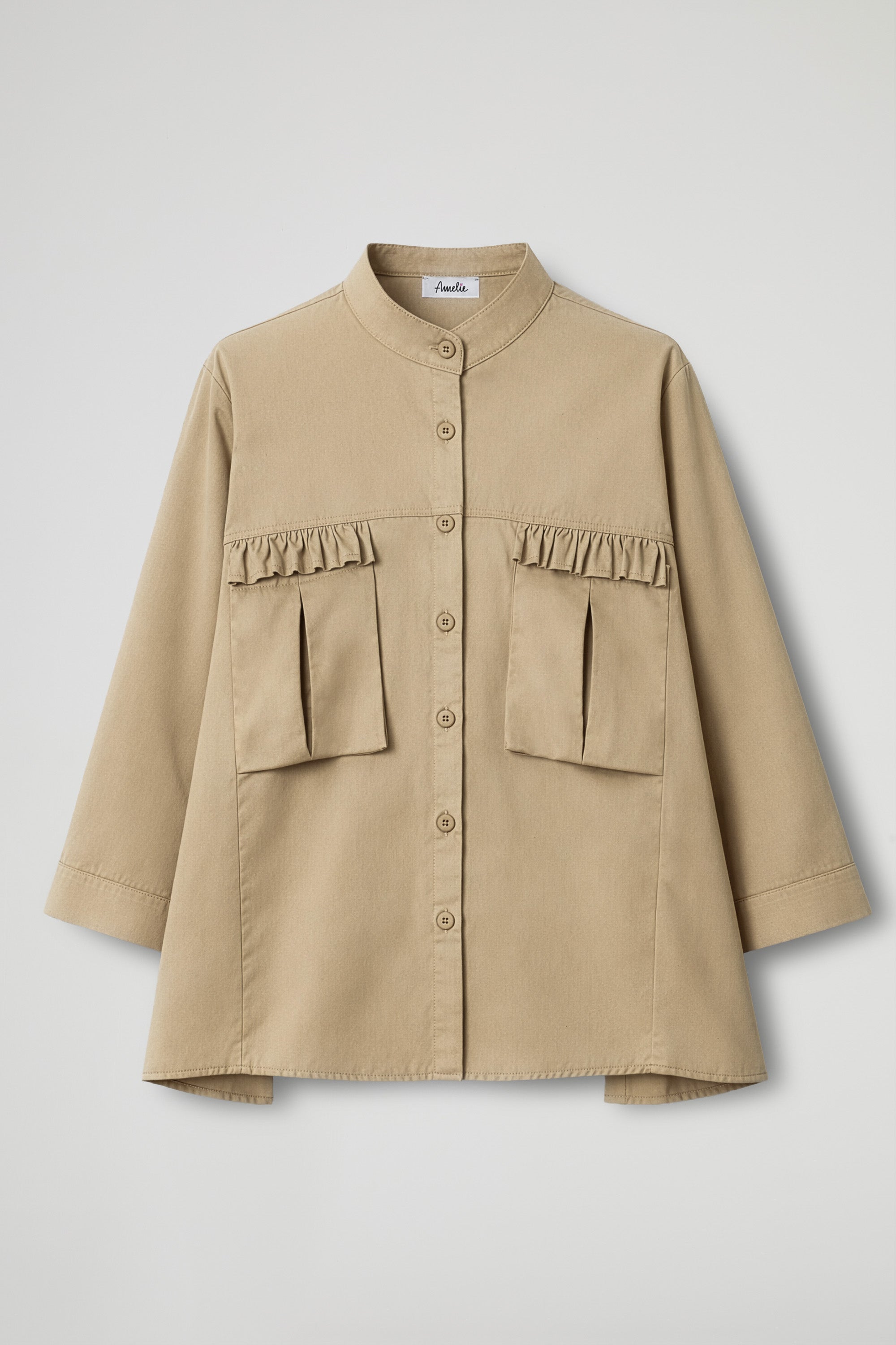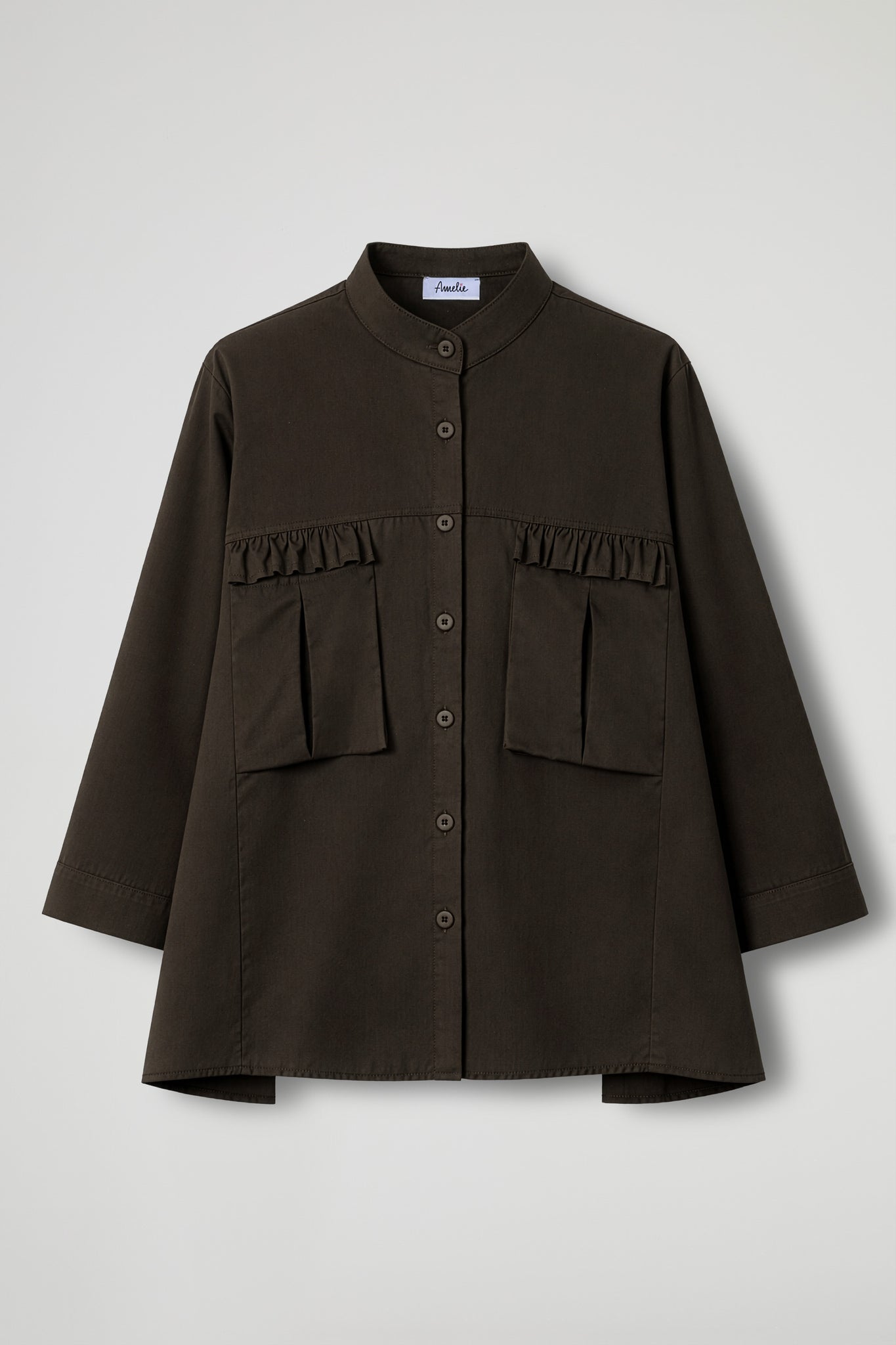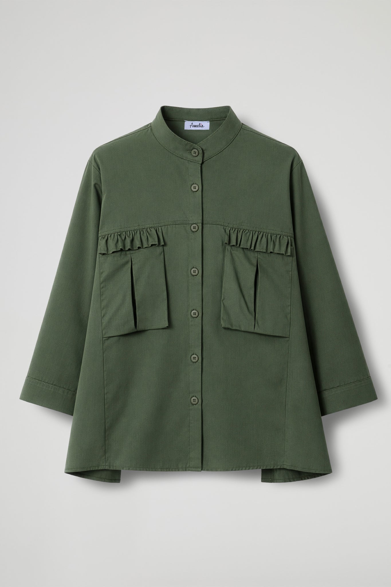 A shirt-jacket with a contemporary and functional design. The model features a high mandarin collar and a front closure with tone-on-tone buttons. The front features large patch pockets with pleats, designed to provide structure and roominess.