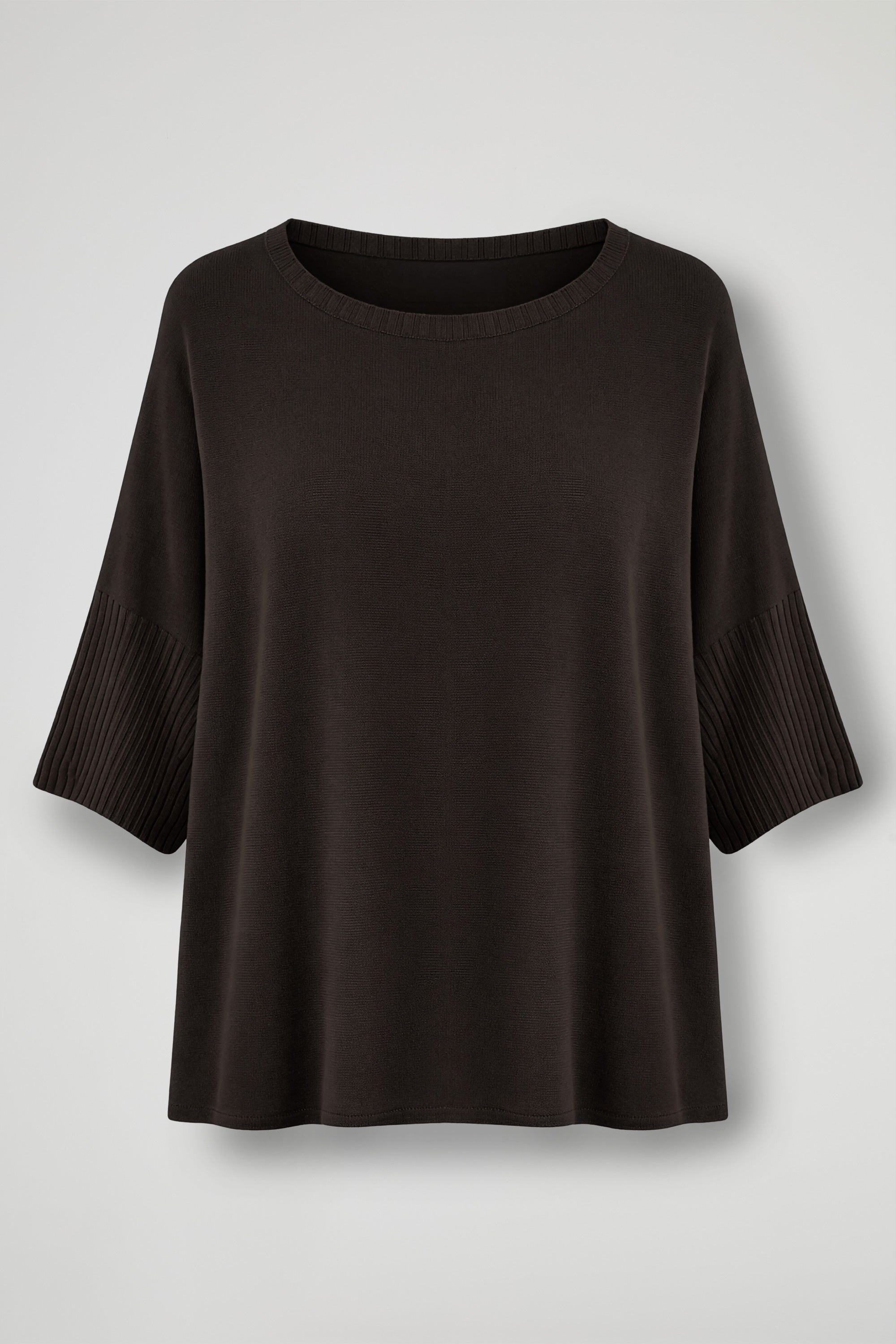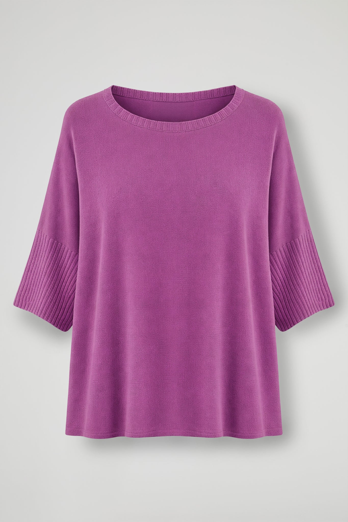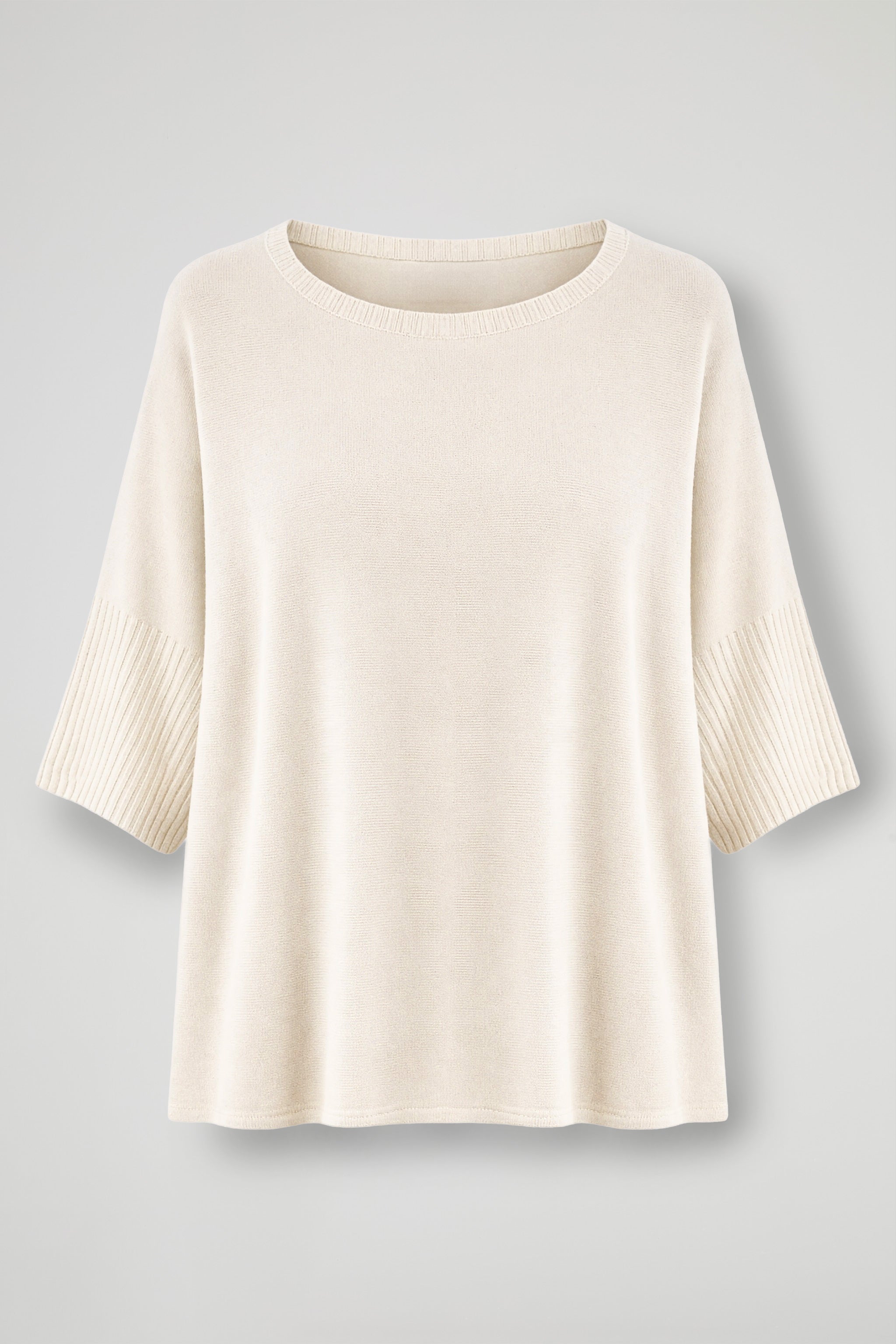 Maglia over in morbida maglina di viscosa, scollo ampio con bordo a taglio vivo, manica corta a pipistrello con dettaglio costine sul fondo. Fondo con bordo a taglio vivo. Linea ampia .
